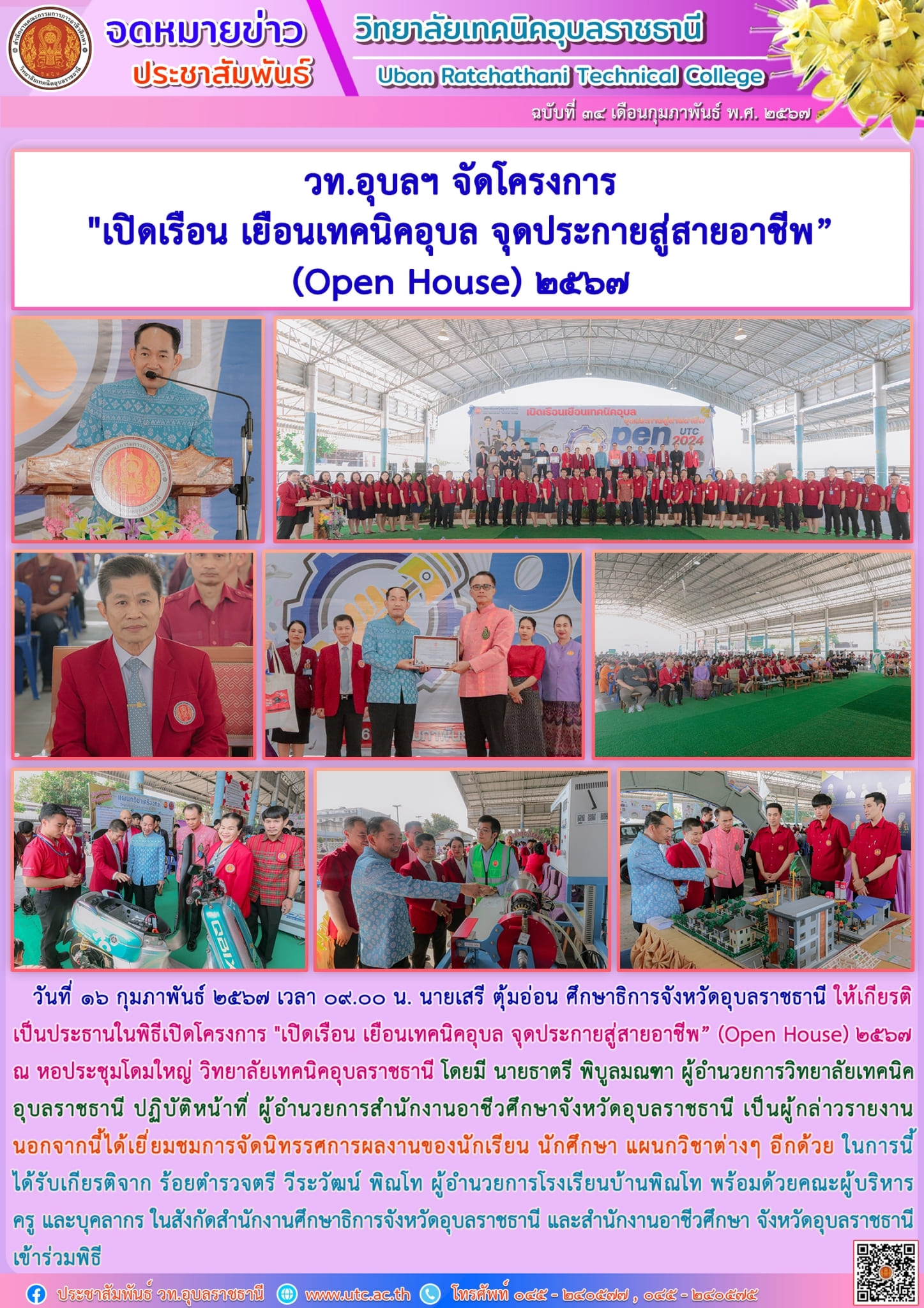 วันที่ ๑๖ กุมภาพันธ์ ๒๕๖๗ เวลา ๐๙.๐๐ น. นายเสรี ตุ้มอ่อน ศึกษาธิการจังหวัดอุบลราชธานี ให้เกียรติเป็นประธานในพิธีเปิดโครงการ “เปิดเรือน เยือนเทคนิคอุบล จุดประกายสู่สายอาชีพ” (Open House) ๒๕๖๗ ณ หอประชุมโดมใหญ่ วิทยาลัยเทคนิคอุบลราชธานี โดยมี นายธาตรี พิบูลมณฑา ผู้อำนวยการวิทยาลัยเทคนิคอุบลราชธานี ปฏิบัติหน้าที่ ผู้อำนวยการสำนักงานอาชีวศึกษาจังหวัดอุบลราชธานี เป็นผู้กล่าวรายงาน นอกจากนี้ได้เยี่ยมชมการจัดนิทรรศการผลงานของนักเรียน นักศึกษา แผนกวิชาต่างๆ อีกด้วย ในการนี้ได้รับเกียรติจาก ร้อยตำรวจตรี วีระวัฒน์ พิณโท ผู้อำนวยการโรงเรียนบ้านพิณโท พร้อมด้วยคณะผู้บริหาร ครู และบุคลากร ในสังกัดสำนักงานศึกษาธิการจังหวัดอุบลราชธานี และสำนักงานอาชีวศึกษาจังหวัดอุบลราชธานี เข้าร่วมพิธี