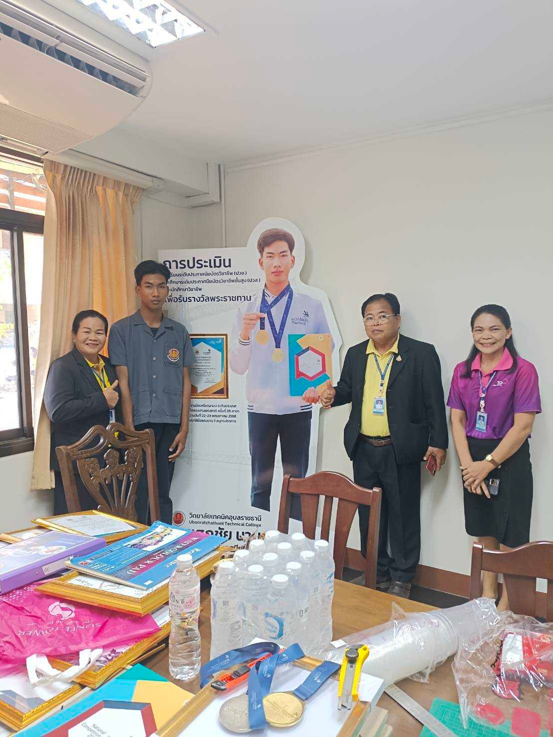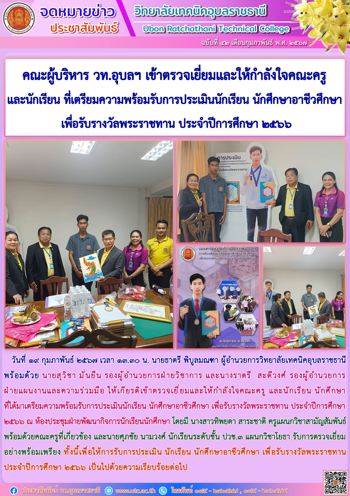 วันที่ ๑๙ กุมภาพันธ์ ๒๕๖๗ เวลา ๑๓.๓๐ น. นายธาตรี พิบูลมณฑา ผู้อำนวยการวิทยาลัยเทคนิคอุบลราชธานี พร้อมด้วย นายสุวิชา มั่นยืน รองผู้อำนวยการฝ่ายวิชาการ และนางราตรี สะดีวงศ์ รองผู้อำนวยการฝ่ายแผนงานและความร่วมมือ ให้เกียรติเข้าตรวจเยี่ยมและให้กำลังใจคณะครู และนักเรียน นักศึกษา ที่ได้มาเตรียมความพร้อมรับการประเมินนักเรียน นักศึกษาอาชีวศึกษา เพื่อรับรางวัลพระราชทาน ประจำปีการศึกษา ๒๕๖๖ ณ ห้องประชุมฝ่ายพัฒนากิจการนักเรียนนักศึกษา โดยมี นางสาวทิพยดา สาระชาติ ครูแผนกวิชาสามัญสัมพันธ์ พร้อมด้วยคณะครูที่เกี่ยวข้อง และนายศุภชัย นามวงศ์ นักเรียนระดับชั้น ปวช.๓ แผนกวิชาโยธา รับการตรวจเยี่ยมอย่างพร้อมเพรียง ทั้งนี้เพื่อให้การรับการประเมิน นักเรียน นักศึกษาอาชีวศึกษา เพื่อรับรางวัลพระราชทาน ประจำปีการศึกษา ๒๕๖๖ เป็นไปด้วยความเรียบร้อยต่อไป