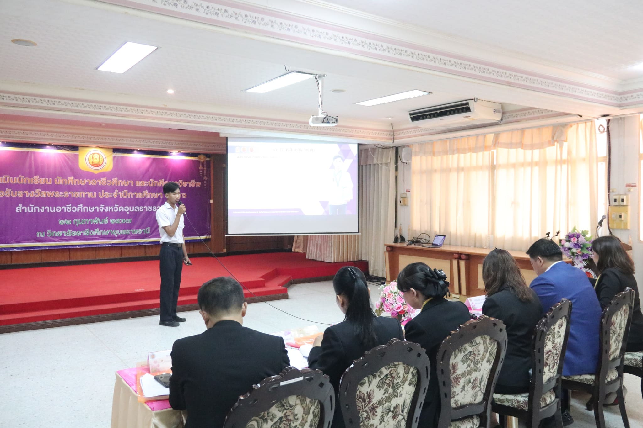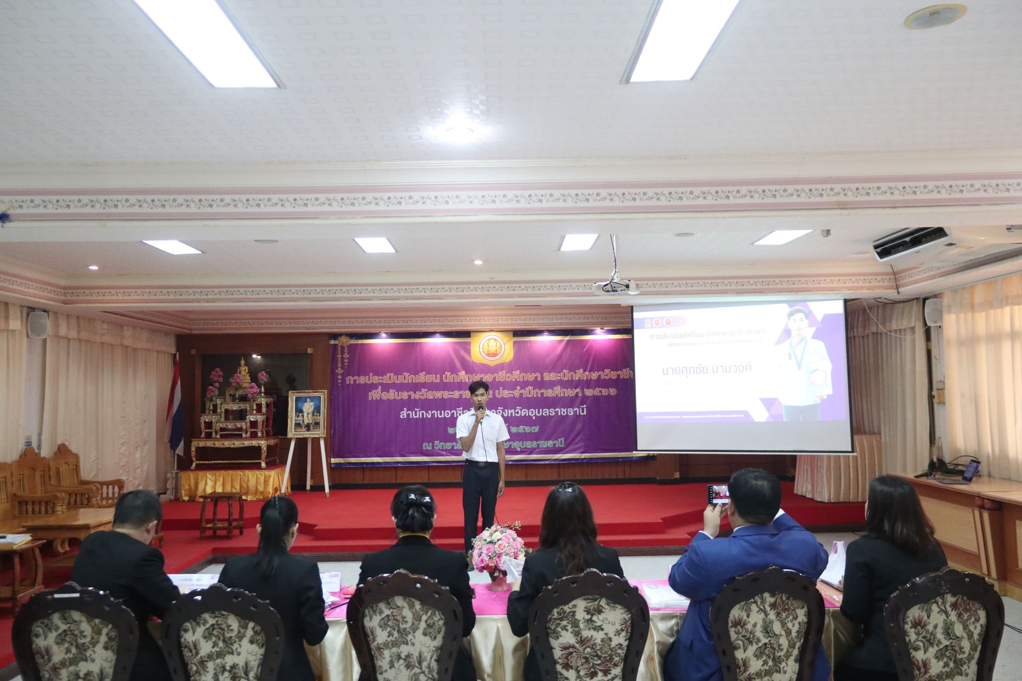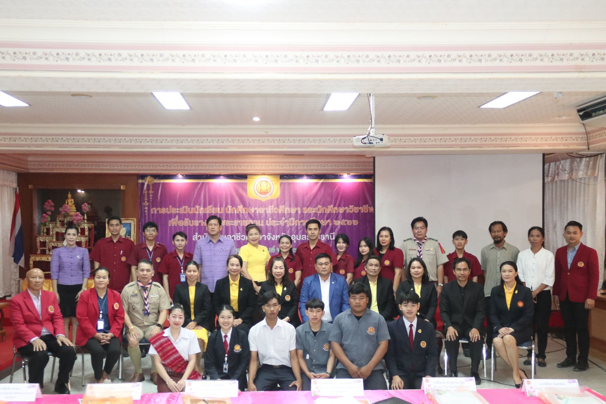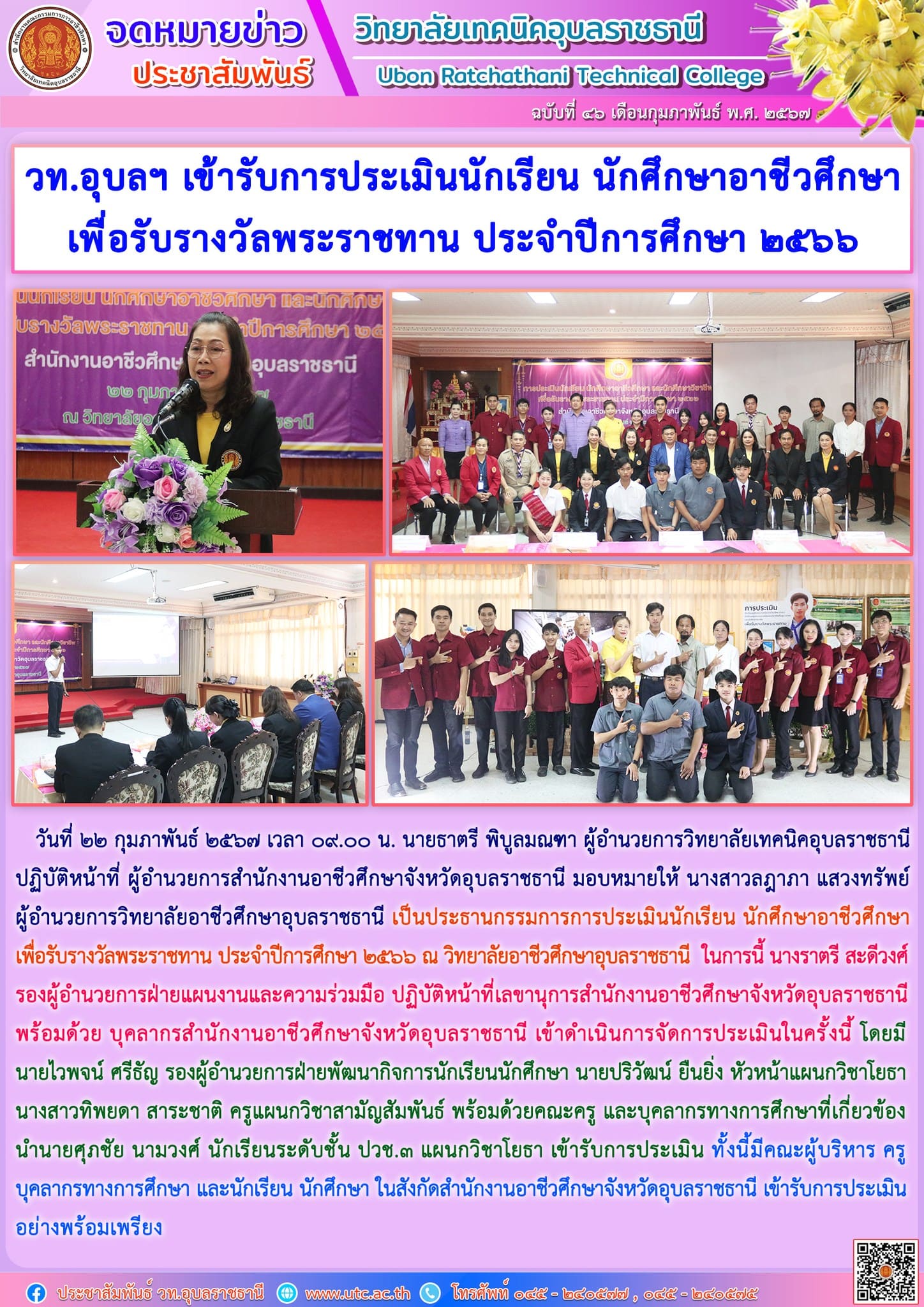 วันที่ ๒๒ กุมภาพันธ์ ๒๕๖๗ เวลา ๐๙.๐๐ น. นายธาตรี พิบูลมณฑา ผู้อำนวยการวิทยาลัยเทคนิคอุบลราชธานี ปฏิบัติหน้าที่ ผู้อำนวยการสำนักงานอาชีวศึกษาจังหวัดอุบลราชธานี มอบหมายให้ นางสาวลฎาภา แสวงทรัพย์ ผู้อำนวยการวิทยาลัยอาชีวศึกษาอุบลราชธานี เป็นประธานกรรมการการประเมินนักเรียน นักศึกษาอาชีวศึกษา เพื่อรับรางวัลพระราชทาน ประจำปีการศึกษา ๒๕๖๖ ณ วิทยาลัยอาชีวศึกษาอุบลราชธานี ในการนี้ นางราตรี สะดีวงศ์ รองผู้อำนวยการฝ่ายแผนงานและความร่วมมือ ปฏิบัติหน้าที่เลขานุการสำนักงานอาชีวศึกษาจังหวัดอุบลราชธานี พร้อมด้วย บุคลากรสำนักงานอาชีวศึกษาจังหวัดอุบลราชธานี เข้าดำเนินการจัดการประเมินในครั้งนี้ โดยมี นายไวพจน์ ศรีธัญ รองผู้อำนวยการฝ่ายพัฒนากิจการนักเรียนนักศึกษา นายปริวัฒน์ ยืนยิ่ง หัวหน้าแผนกวิชาโยธา นางสาวทิพยดา สาระชาติ ครูแผนกวิชาสามัญสัมพันธ์ พร้อมด้วยคณะครู และบุคลากรทางการศึกษาที่เกี่ยวข้อง นำนายศุภชัย นามวงศ์ นักเรียนระดับชั้น ปวช.๓ แผนกวิชาโยธา เข้ารับการประเมิน ทั้งนี้มีคณะผู้บริหาร ครู บุคลากรทางการศึกษา และนักเรียน นักศึกษา ในสังกัดสำนักงานอาชีวศึกษาจังหวัดอุบลราชธานี เข้ารับการประเมินอย่างพร้อมเพรียง