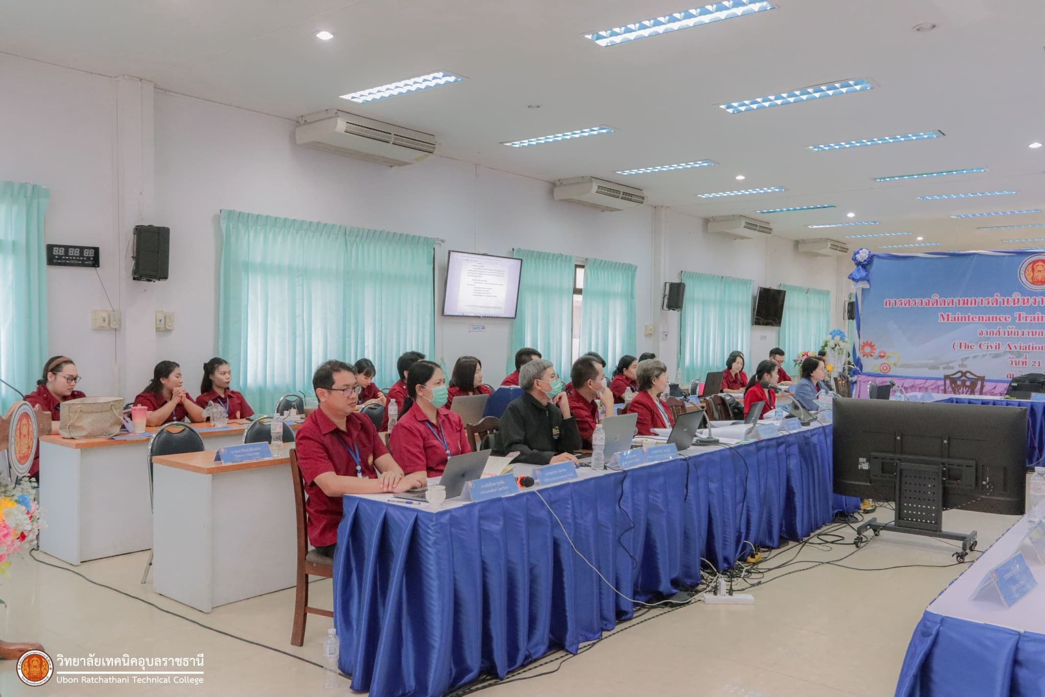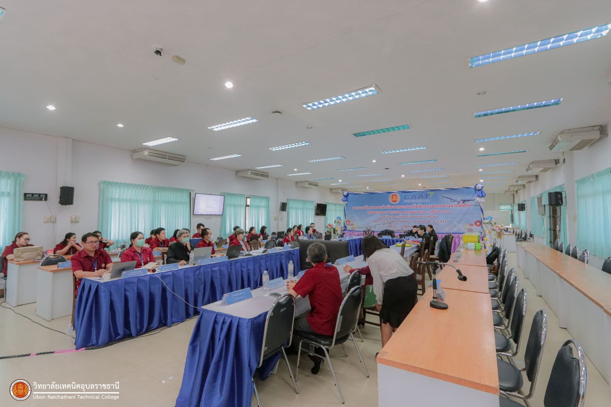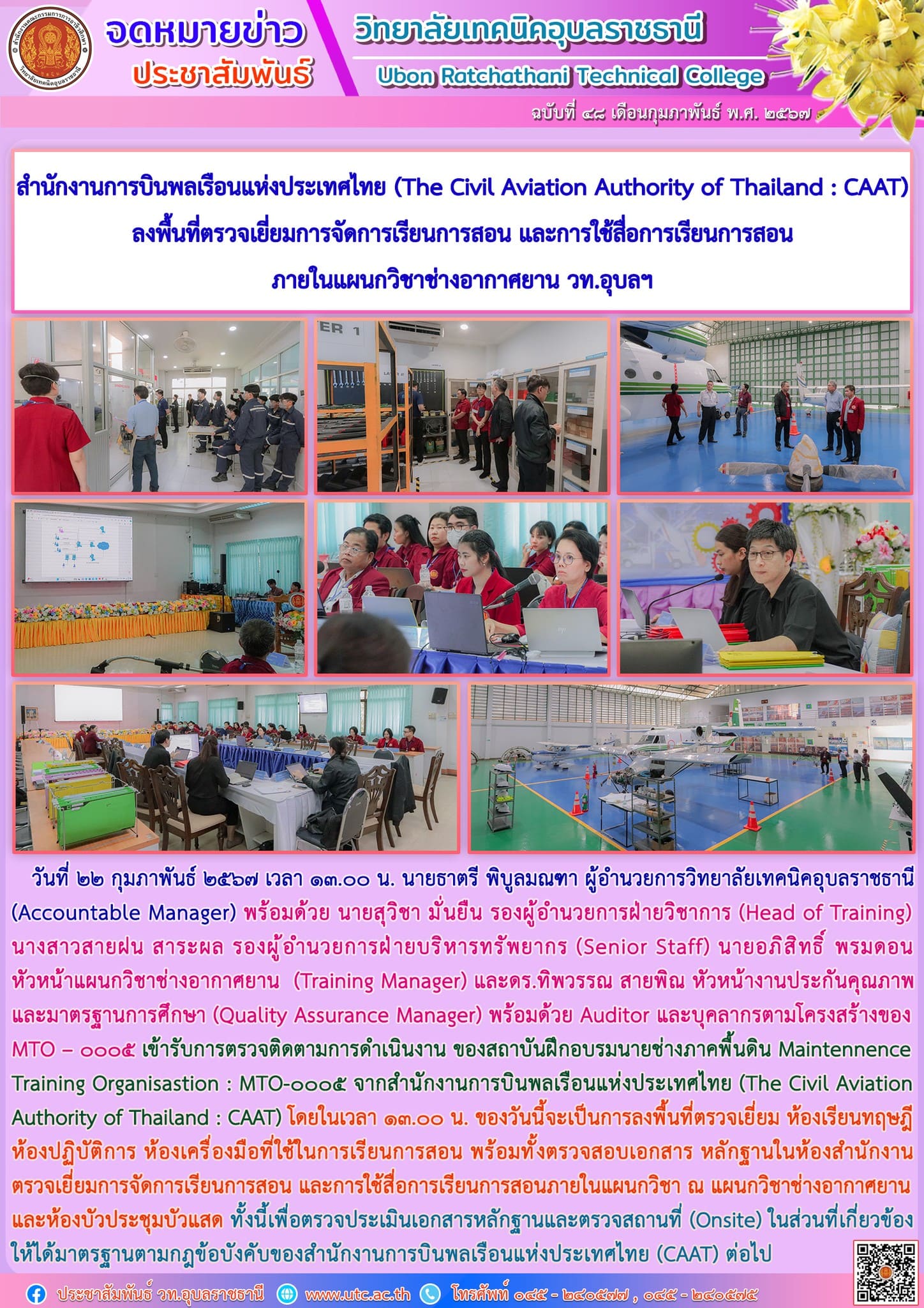 วันที่ ๒๒ กุมภาพันธ์ ๒๕๖๗ เวลา ๑๓.๐๐ น. นายธาตรี พิบูลมณฑา ผู้อำนวยการวิทยาลัยเทคนิคอุบลราชธานี (Accountable Manager) พร้อมด้วย นายสุวิชา มั่นยืน รองผู้อำนวยการฝ่ายวิชาการ (Head of Training) นางสาวสายฝน สาระผล รองผู้อำนวยการฝ่ายบริหารทรัพยากร (Senior Staff) นายอภิสิทธิ์ พรมดอน หัวหน้าแผนกวิชาช่างอากาศยาน (Training Manager) และดร.ทิพวรรณ สายพิณ หัวหน้างานประกันคุณภาพและมาตรฐานการศึกษา (Quality Assurance Manager) พร้อมด้วย Auditor และบุคลากรตามโครงสร้างของ MTO – ๐๐๐๕ เข้ารับการตรวจติดตามการดำเนินงาน ของสถาบันฝึกอบรมนายช่างภาคพื้นดิน Maintennence Training Organisastion : MTO-๐๐๐๕ จากสำนักงานการบินพลเรือนแห่งประเทศไทย (The Civil Aviation Authority of Thailand : CAAT) โดยในเวลา ๑๓.๐๐ น. ของวันนี้จะเป็นการลงพื้นที่ตรวจเยี่ยม ห้องเรียนทฤษฎี ห้องปฏิบัติการ ห้องเครื่องมือที่ใช้ในการเรียนการสอน พร้อมทั้งตรวจสอบเอกสาร หลักฐานในห้องสำนักงาน ตรวจเยี่ยมการจัดการเรียนการสอน และการใช้สื่อการเรียนการสอนภายในแผนกวิชา ณ แผนกวิชาช่างอากาศยาน และห้องบัวประชุมบัวแสด ทั้งนี้เพื่อตรวจประเมินเอกสารหลักฐานและตรวจสถานที่ (Onsite) ในส่วนที่เกี่ยวข้องให้ได้มาตรฐานตามกฎข้อบังคับของสำนักงานการบินพลเรือนแห่งประเทศไทย (CAAT) ต่อไป