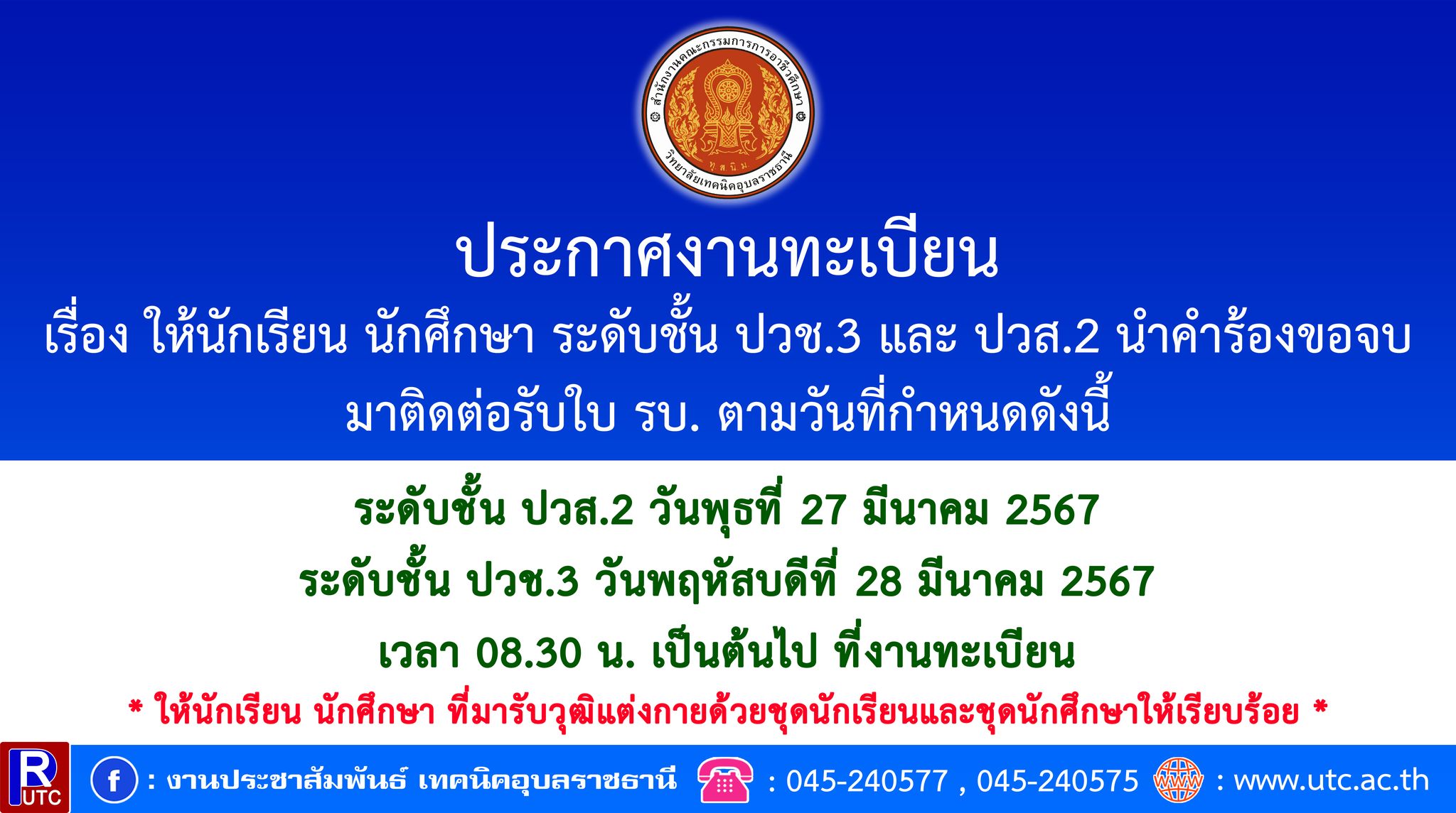 ประกาศให้นักเรียนระดับชั้น ปวช.3 และ ปวส.2 นำคำร้องขอจบมาติดต่อรับใบ รบ.