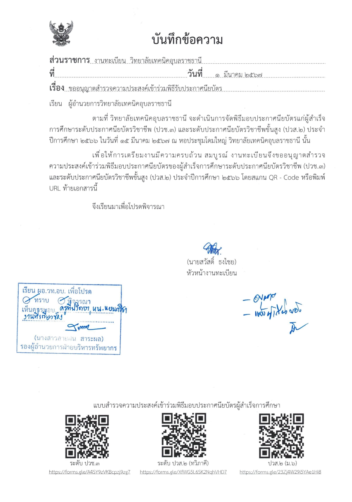ประกาศงานทะเบียน ขออนุญาตสำรวจความประสงค์เข้าร่วมพิธีรับประกาศนียบัตร แบบสอบถามความประสงค์เข้าร่วมพิธีรับประกาศนียบัตร ฯลฯ