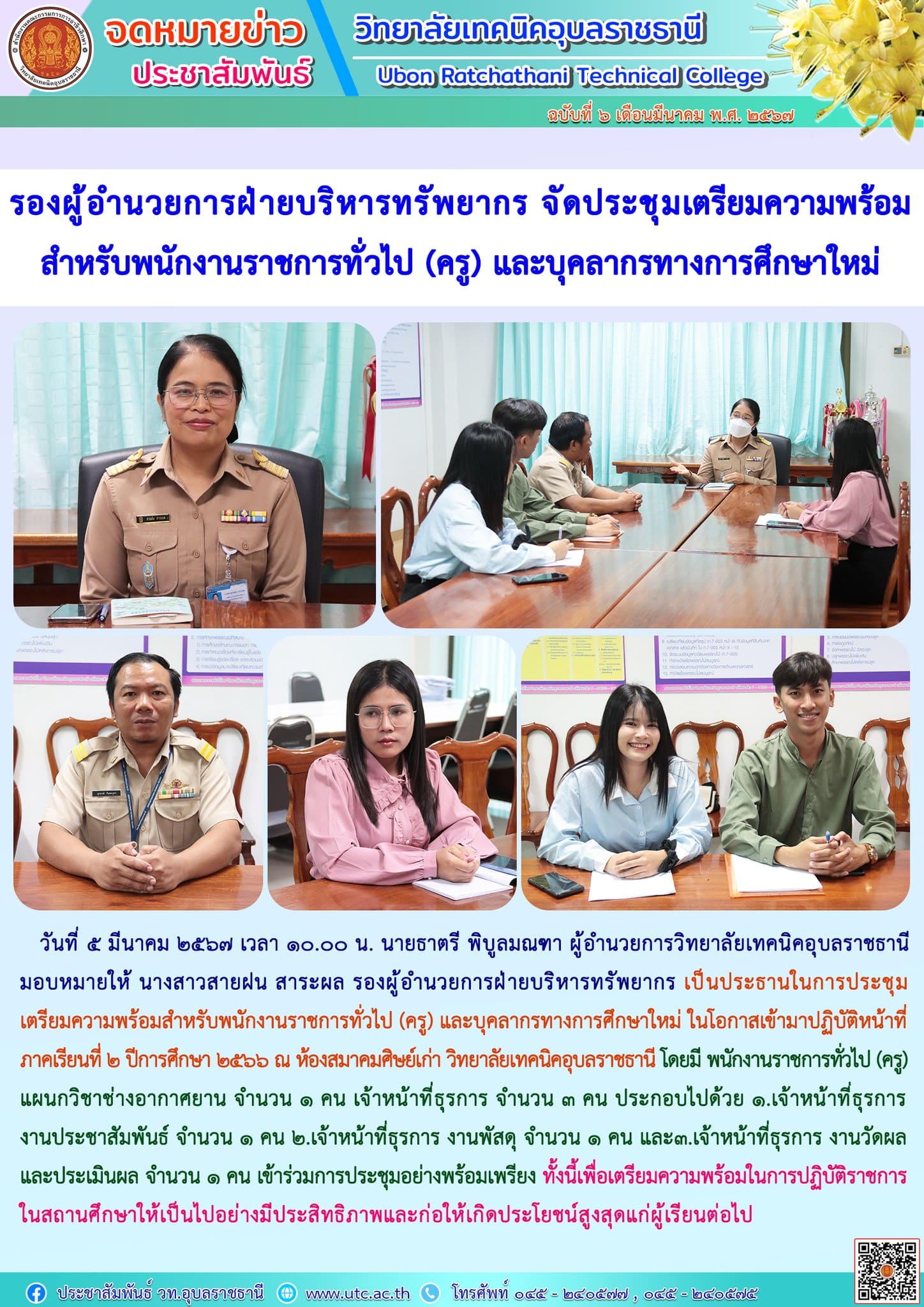 วันที่ ๕ มีนาคม ๒๕๖๗ เวลา ๑๐.๐๐ น. นายธาตรี พิบูลมณฑา ผู้อำนวยการวิทยาลัยเทคนิคอุบลราชธานี มอบหมายให้ นางสาวสายฝน สาระผล รองผู้อำนวยการฝ่ายบริหารทรัพยากร เป็นประธานในการประชุมเตรียมความพร้อมสำหรับพนักงานราชการทั่วไป (ครู) และบุคลากรทางการศึกษาใหม่ ในโอกาสเข้ามาปฏิบัติหน้าที่ ภาคเรียนที่ ๒ ปีการศึกษา ๒๕๖๖ ณ ห้องสมาคมศิษย์เก่า วิทยาลัยเทคนิคอุบลราชธานี โดยมี พนักงานราชการทั่วไป (ครู) แผนกวิชาช่างอากาศยาน จำนวน ๑ คน เจ้าหน้าที่ธุรการ จำนวน ๓ คน ประกอบไปด้วย ๑.เจ้าหน้าที่ธุรการ งานประชาสัมพันธ์ จำนวน ๑ คน ๒.เจ้าหน้าที่ธุรการ งานพัสดุ จำนวน ๑ คน และ๓.เจ้าหน้าที่ธุรการ งานวัดผลและประเมินผล จำนวน ๑ คน เข้าร่วมการประชุมอย่างพร้อมเพรียง ทั้งนี้เพื่อเตรียมความพร้อมในการปฏิบัติราชการในสถานศึกษาให้เป็นไปอย่างมีประสิทธิภาพและก่อให้เกิดประโยชน์สูงสุดแก่ผู้เรียนต่อไป