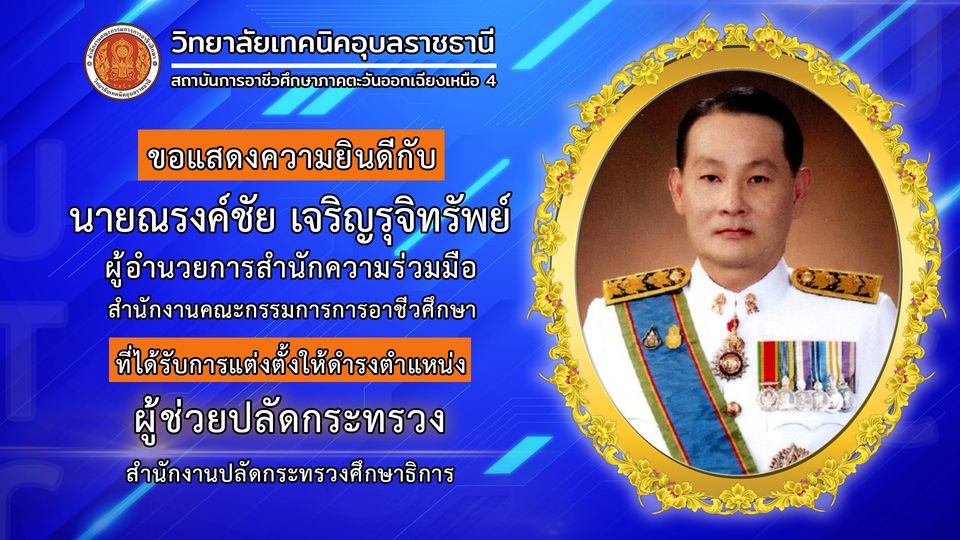 วิทยาลัยเทคนิคอุบลราชธานี ขอแสดงความยินดีกับ นายณรงค์ชัย เจริญรุจิทรัพย์ ผู้อำนวยการสำนักความร่วมมือ สำนักงานคณะกรรมการการอาชีวศึกษา