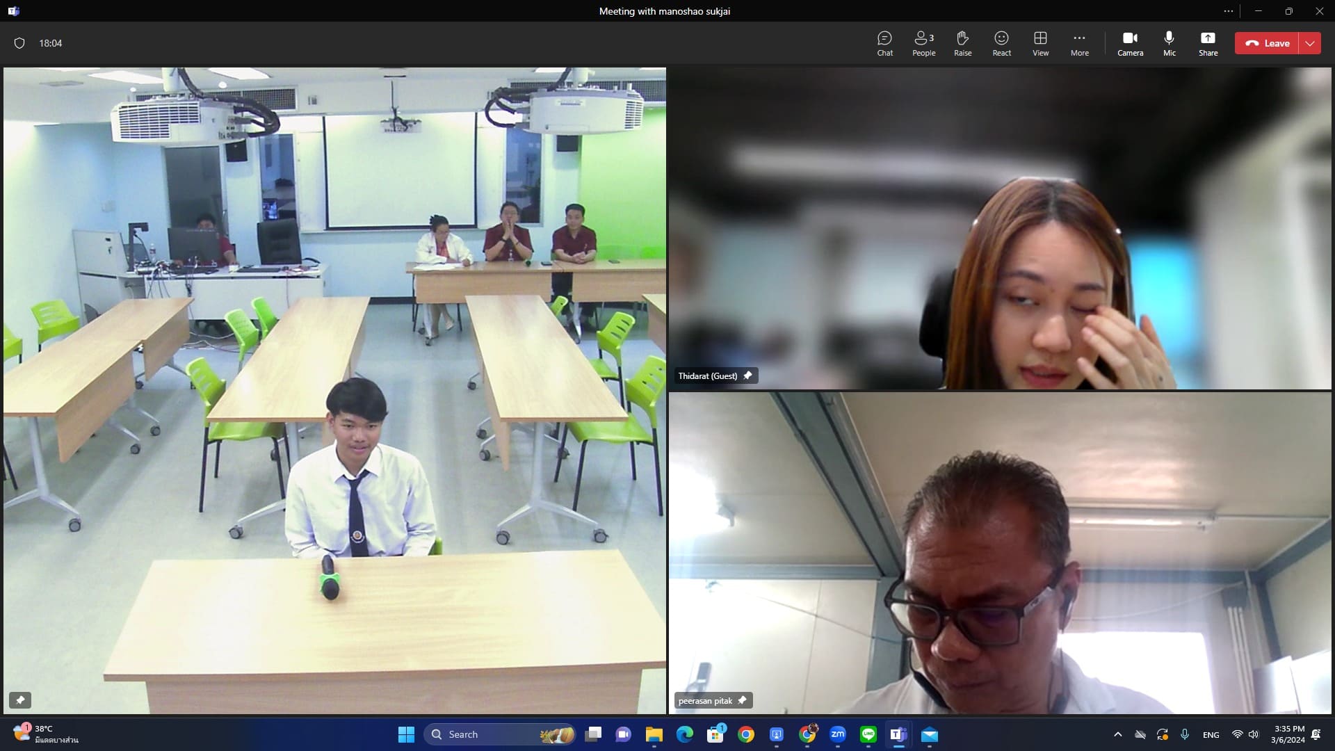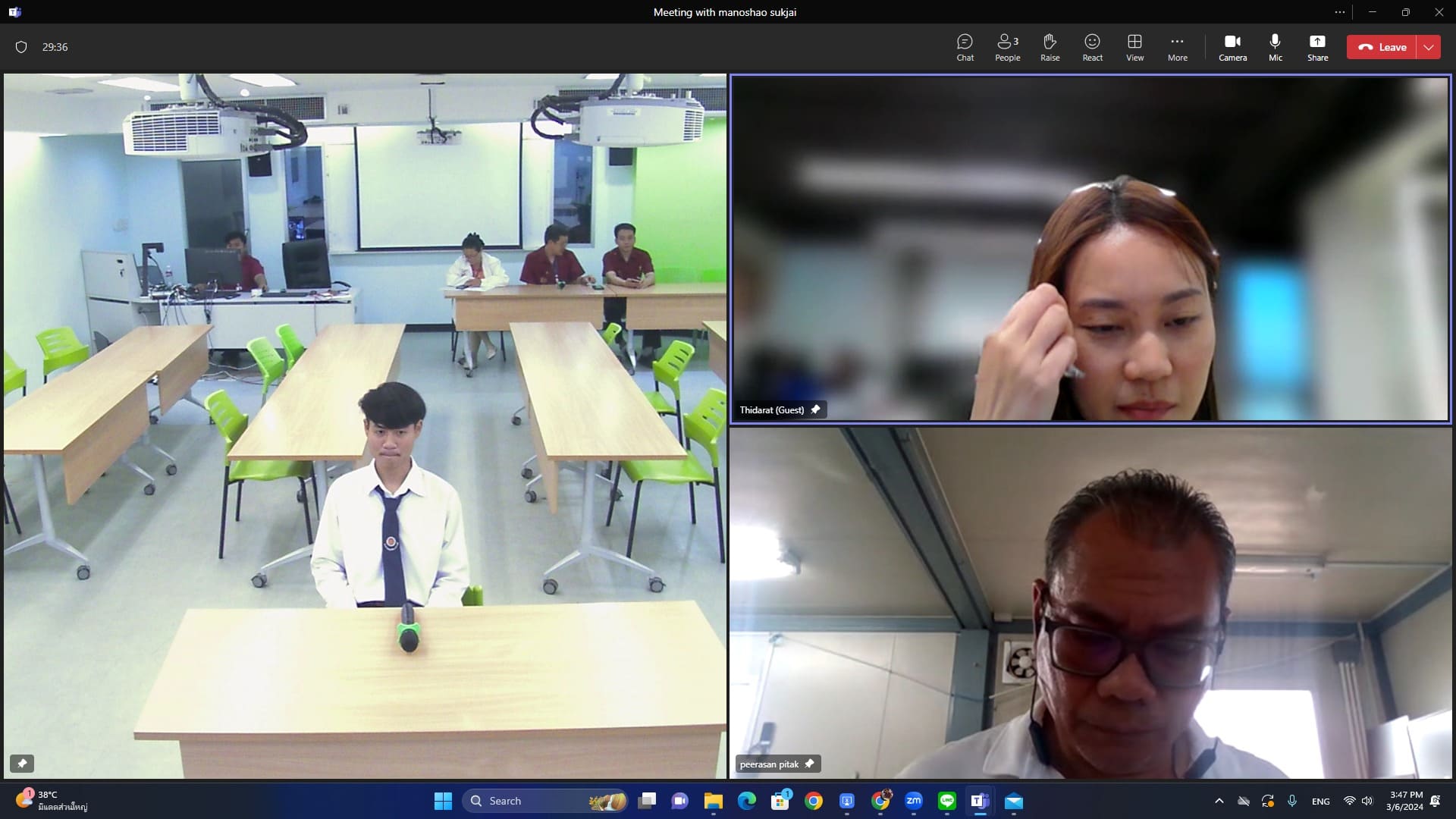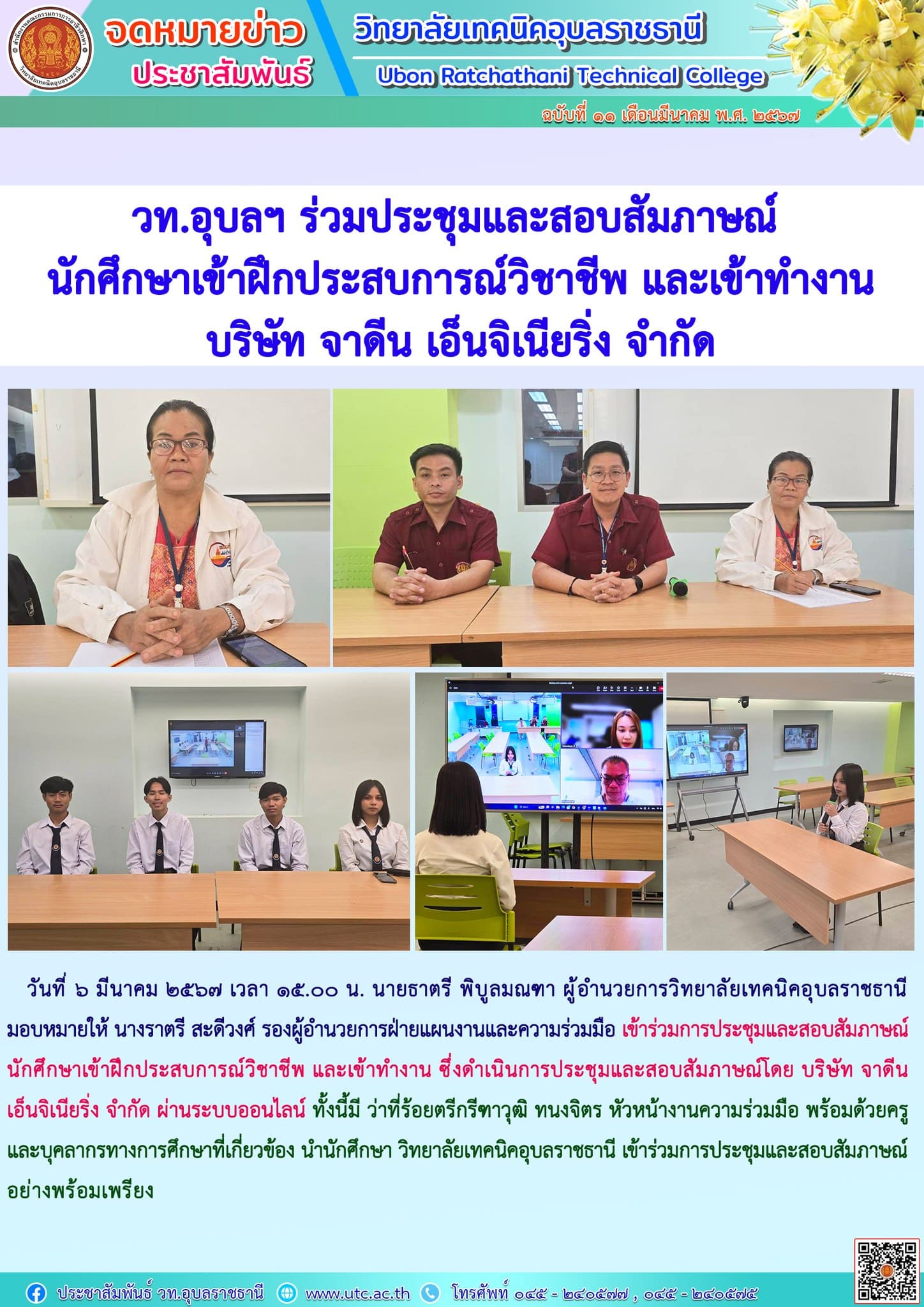 วันที่ ๖ มีนาคม ๒๕๖๗ เวลา ๑๕.๐๐ น. นายธาตรี พิบูลมณฑา ผู้อำนวยการวิทยาลัยเทคนิคอุบลราชธานี มอบหมายให้ นางราตรี สะดีวงศ์ รองผู้อำนวยการฝ่ายแผนงานและความร่วมมือ เข้าร่วมการประชุมและสอบสัมภาษณ์ นักศึกษาเข้าฝึกประสบการณ์วิชาชีพ และเข้าทำงาน ซึ่งดำเนินการประชุมและสอบสัมภาษณ์โดย บริษัท จาดีน เอ็นจิเนียริ่ง จำกัด ผ่านระบบออนไลน์ ทั้งนี้มี ว่าที่ร้อยตรีกรีฑาวุฒิ ทนงจิตร หัวหน้างานความร่วมมือ พร้อมด้วยครู และบุคลากรทางการศึกษาที่เกี่ยวข้อง นำนักศึกษา วิทยาลัยเทคนิคอุบลราชธานี เข้าร่วมการประชุมและสอบสัมภาษณ์อย่างพร้อมเพรียง