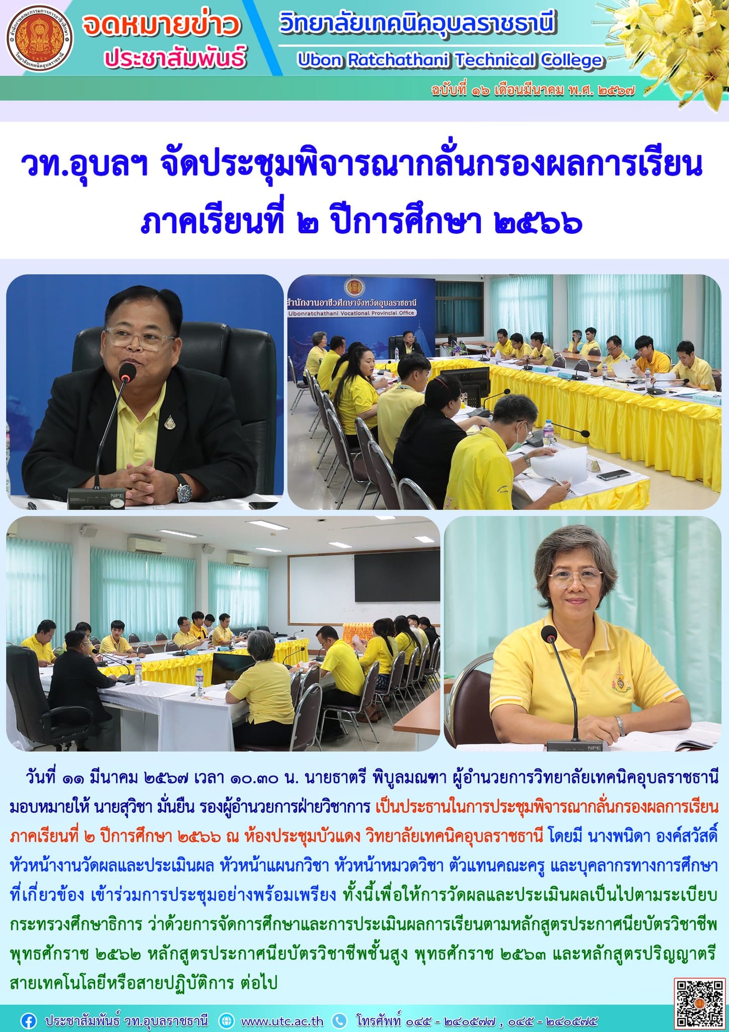 วันที่ ๑๑ มีนาคม ๒๕๖๗ เวลา ๑๐.๓๐ น. นายธาตรี พิบูลมณฑา ผู้อำนวยการวิทยาลัยเทคนิคอุบลราชธานี มอบหมายให้ นายสุวิชา มั่นยืน รองผู้อำนวยการฝ่ายวิชาการ เป็นประธานในการประชุมพิจารณากลั่นกรองผลการเรียน ภาคเรียนที่ ๒ ปีการศึกษา ๒๕๖๖ ณ ห้องประชุมบัวแดง วิทยาลัยเทคนิคอุบลราชธานี โดยมี นางพนิดา องค์สวัสดิ์ หัวหน้างานวัดผลและประเมินผล หัวหน้าแผนกวิชา หัวหน้าหมวดวิชา ตัวแทนคณะครู และบุคลากรทางการศึกษาที่เกี่ยวข้อง เข้าร่วมการประชุมอย่างพร้อมเพรียง ทั้งนี้เพื่อให้การวัดผลและประเมินผลเป็นไปตามระเบียบกระทรวงศึกษาธิการ ว่าด้วยการจัดการศึกษาและการประเมินผลการเรียนตามหลักสูตรประกาศนียบัตรวิชาชีพ พุทธศักราช ๒๕๖๒ หลักสูตรประกาศนียบัตรวิชาชีพชั้นสูง พุทธศักราช ๒๕๖๓ และหลักสูตรปริญญาตรี สายเทคโนโลยีหรือสายปฏิบัติการ ต่อไป