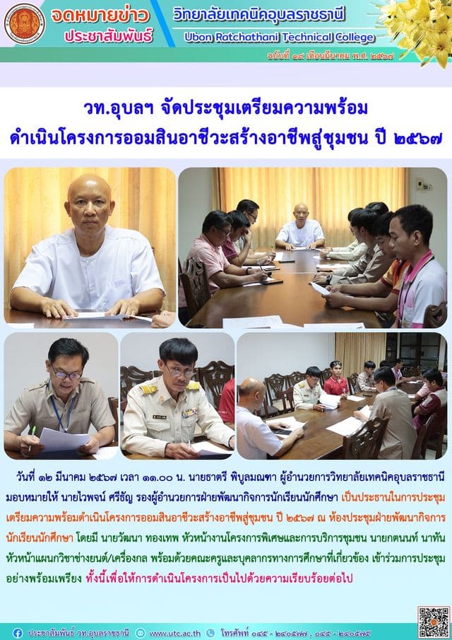วันที่ ๑๒ มีนาคม ๒๕๖๗ เวลา ๑๑.๐๐ น. นายธาตรี พิบูลมณฑา ผู้อำนวยการวิทยาลัยเทคนิคอุบลราชธานี มอบหมายให้ นายไวพจน์ ศรีธัญ รองผู้อำนวยการฝ่ายพัฒนากิจการนักเรียนนักศึกษา เป็นประธานในการประชุมเตรียมความพร้อมดำเนินโครงการออมสินอาชีวะสร้างอาชีพสู่ชุมชน ปี ๒๕๖๗ ณ ห้องประชุมฝ่ายพัฒนากิจการนักเรียนนักศึกษา โดยมี นายวัฒนา ทองเทพ หัวหน้างานโครงการพิเศษและการบริการชุมชน นายกตนนท์ นาทัน หัวหน้าแผนกวิชาช่างยนต์/เครื่องกล พร้อมด้วยคณะครูและบุคลากรทางการศึกษาที่เกี่ยวข้อง เข้าร่วมการประชุมอย่างพร้อมเพรียง ทั้งนี้เพื่อให้การดำเนินโครงการเป็นไปด้วยความเรียบร้อยต่อไป