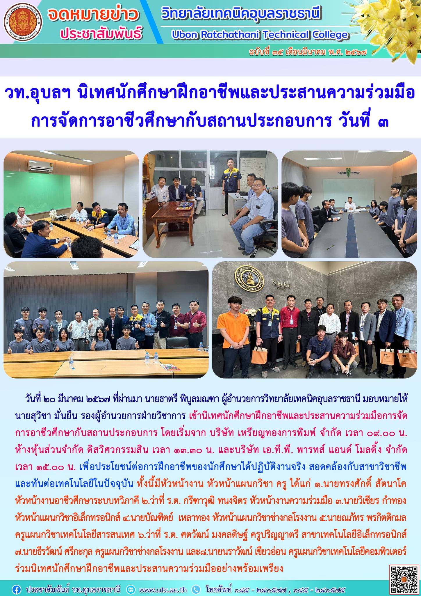 วท.อุบลฯ นิเทศนักศึกษาฝึกอาชีพและประสานความร่วมมือการจัดการอาชีวศึกษากับสถานประกอบการ วันที่ ๓