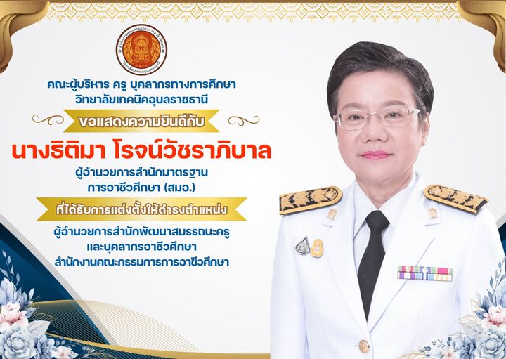 คณะผู้บริหาร ครู บุคลากรทางการศึกษา และนักเรียนนักศึกษา วิทยาลัยเทคนิคอุบลราชธานี ขอแสดงความยินดีกับ นางธิติมา โรจน์วัชราภิบาล