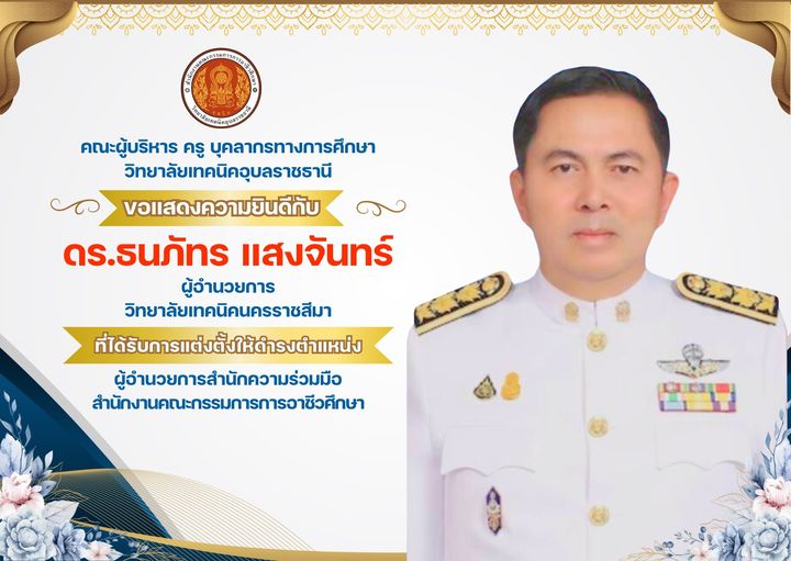 คณะผู้บริหาร ครู บุคลากรทางการศึกษา และนักเรียนนักศึกษา วิทยาลัยเทคนิคอุบลราชธานี ขอแสดงความยินดีกับ ดร.ธนภัทร แสงจันทร์