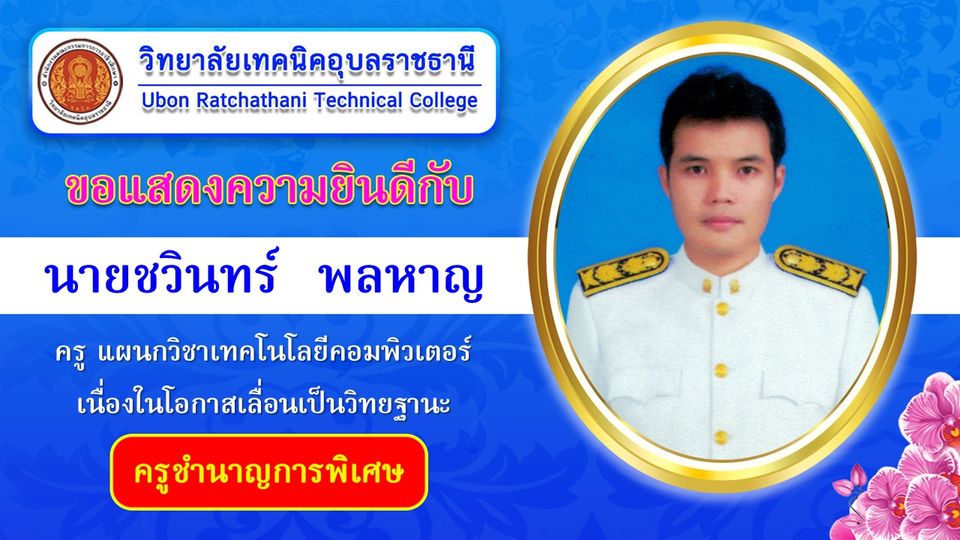 วิทยาลัยเทคนิคอุบลราชธานี ขอแสดงความยินดีกับ นายชวินทร์ พลหาญ ครู แผนกวิชาเทคโนโลยีคอมพิวเตอร์
