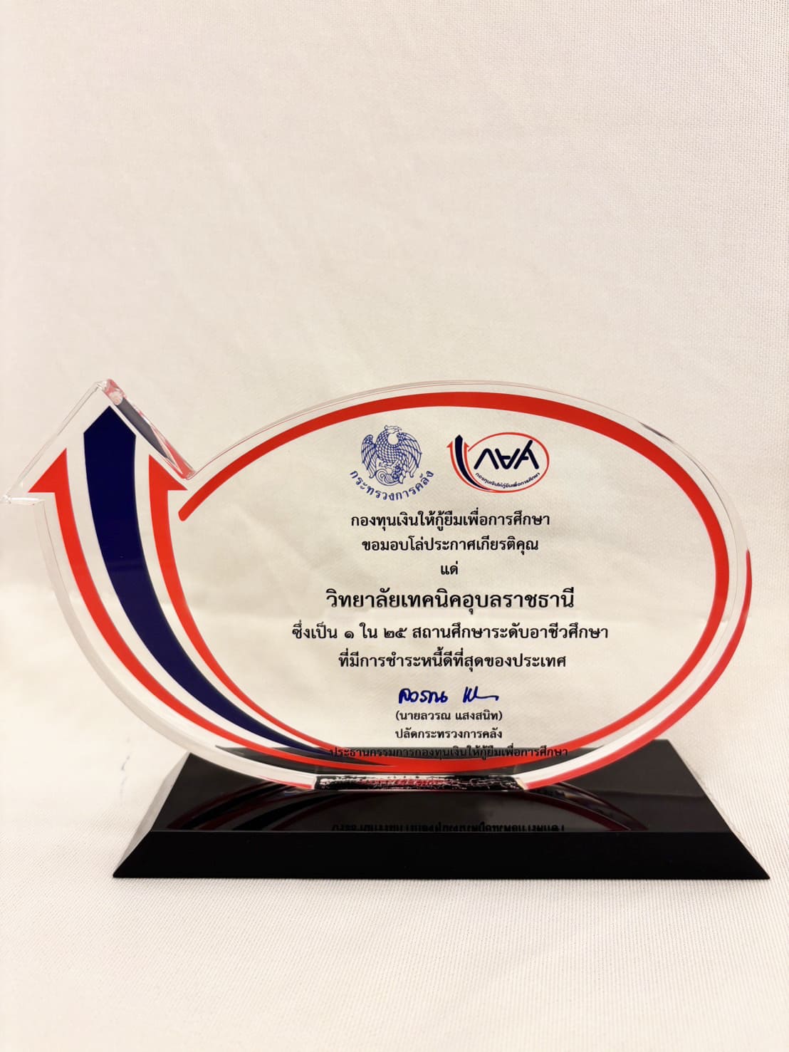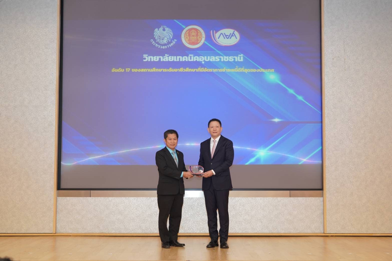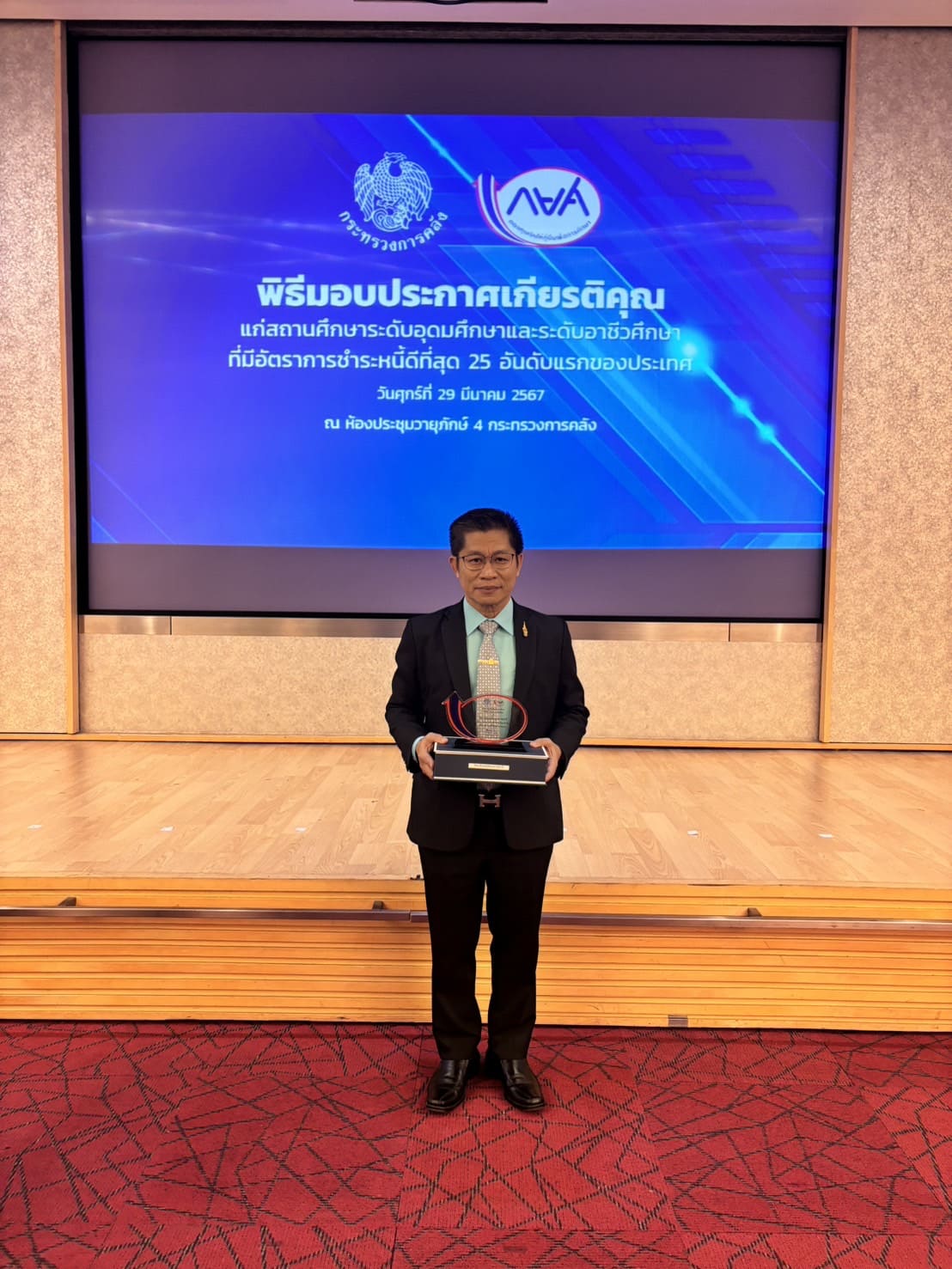 วันที่ ๒๙ มีนาคม ๒๕๖๗ เวลา ๑๐.๐๐ น. นายธาตรี พิบูลมณฑา ผู้อำนวยการวิทยาลัยเทคนิคอุบลราชธานี ให้เกียรติเข้าร่วมพิธีมอบโล่ประกาศเกียรติคุณแก่สถานศึกษาระดับอุดมศึกษาและระดับอาชีวศึกษาที่มีอัตราการชำระหนี้ดีที่สุด ๒๕ อันดับแรกของประเทศ ณ ห้องประชุมวายุภักษ์ ๔ ชั้น ๔ กระทรวงการคลัง ในการนี้ได้รับเกียรติจาก นายลวรณ แสงสนิท ปลัดกระทรวงการคลัง ประธานกรรมการกองทุนเงินให้กู้ยืมเพื่อการศึกษา เป็นประธานในพิธี พร้อมทั้งกล่าวแสดงความยินดีและมอบโล่ประกาศเกียรติคุณแก่สถานศึกษา ในการนี้มีผู้บริหารสถานศึกษาระดับอุดมศึกษาและระดับอาชีวศึกษา จำนวน ๕๐ แห่ง เข้าร่วมพิธีอย่างพร้อมเพรียง