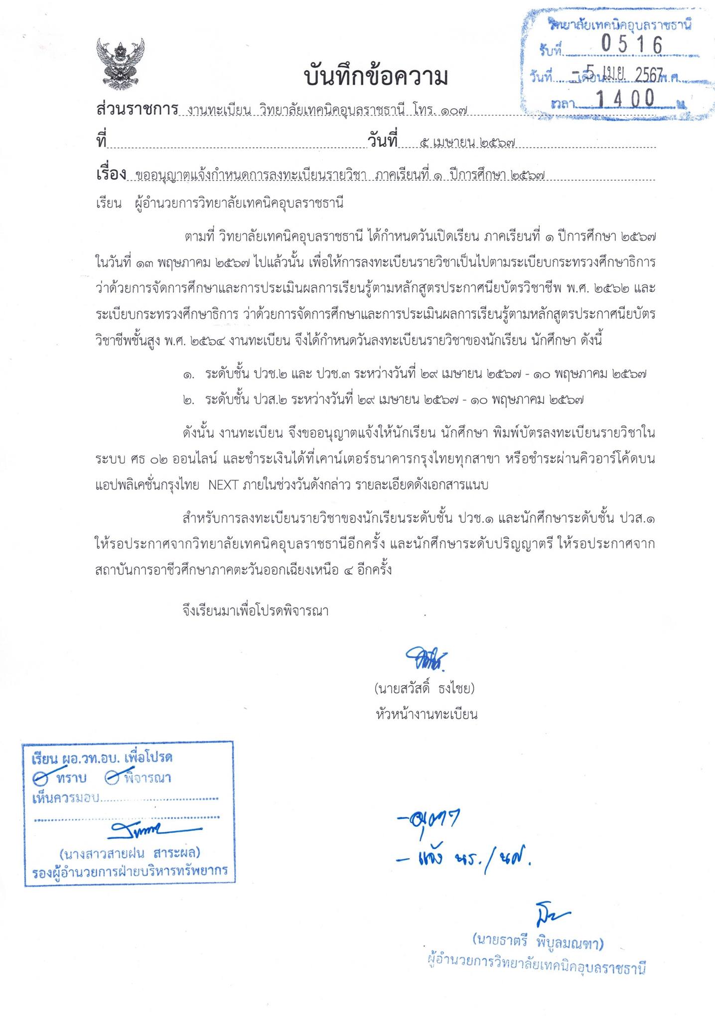 ประกาศวิทยาลัยเทคนิคอุบลราชธานี เรื่อง แจ้งกำหนดการลงทะเบียนรายวิชา ภาคเรียนที่ 1 ปีการศึกษา 2567