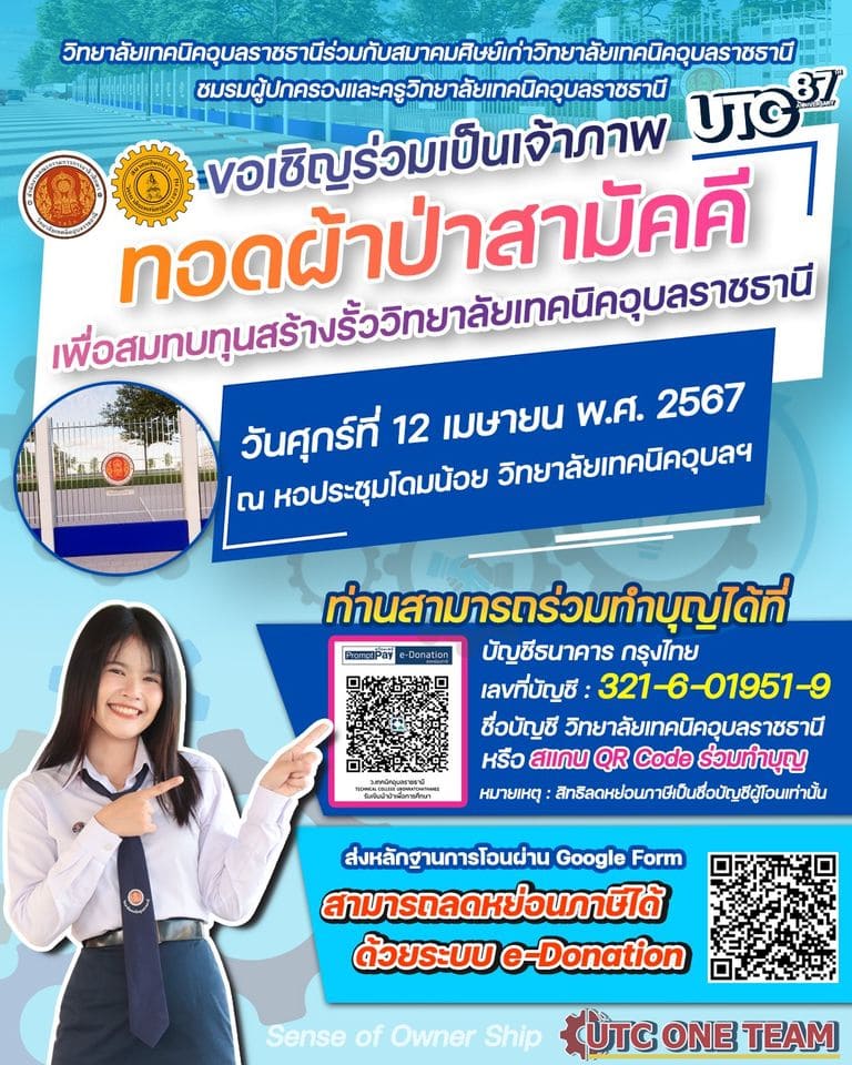วันที่ ๑๒ เมษายน ๒๕๖๗ เวลา ๑๐.๐๐ น. นายลิขิต พลเหลา ผู้อำนวยการสถาบันการอาชีวศึกษาภาคตะวันออกเฉียงเหนือ ๔ ให้เกียรติเป็นประธานในพิธีทอดผ้าป่าสามัคคี เพื่อสมทบทุนสร้างรั้ววิทยาลัยเทคนิคอุบลราชธานี ณ หอประชุมโดมน้อย ซึ่งเป็นความร่วมมือระหว่างวิทยาลัยเทคนิคอุบลราชธานีกับสมาคมศิษย์เก่าวิทยาลัยเทคนิคอุบลราชธานี และชมรมผู้ปกครองและครูวิทยาลัยเทคนิคอุบลราชธานี ในการนี้ นายธาตรี พิบูลมณฑา ผู้อำนวยการวิทยาลัยเทคนิคอุบลราชธานี พร้อมด้วย นายประสงค์ จันจำปา นายกสมาคมศิษย์เก่าวิทยาลัยเทคนิคอุบลราชธานี และนายประดิษฐ์ พาชื่น ประธานชมรมผู้ปกครองและครูวิทยาลัยเทคนิคอุบลราชธานี นำคณะผู้บริหาร กรรมการวิทยาลัยฯ ครูอาวุโส คณะครู และบุคลากรทางการศึกษา เข้าร่วมพิธีอย่างพร้อมเพรียง ทั้งนี้ยอดบริจาค ณ เวลา ๑๓.๓๕ น. รวมเป็นเงินทั้งสิ้น ๙๕๑,๔๕๖.๗๗ บาท ซึ่งท่านผู้มีจิตศรัทธาสามารถร่วมทำบุญเพิ่มเติมได้อีกโดยสามารถสแกน QR Code ร่วมทำบุญ หรือโอนเงินผ่านบัญชีธนาคารกรุงไทย เลขที่บัญชี ๓๒๑-๖-๐๑๙๕๑-๙ ชื่อบัญชี วิทยาลัยเทคนิคอุบลราชธานี ในการนี้คณะผู้บริหาร ครู บุคลากรทางการศึกษา และนักเรียนนักศึกษา วิทยาลัยเทคนิคอุบลราชธานี จึงขออนุโมทนาบุญมายังทุกท่านที่ร่วมกันทำบุญทอดผ้าป่าสามัคคีในครั้งนี้