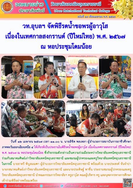 วันที่ ๑๒ เมษายน ๒๕๖๗ เวลา ๑๑.๐๐ น. นายลิขิต พลเหลา ผู้อำนวยการสถาบันการอาชีวศึกษาภาคตะวันออกเฉียงเหนือ ๔ ให้เกียรติเป็นประธานในพิธีรดน้ำขอพรผู้อาวุโส เนื่องในเทศกาลสงกรานต์ (ปีใหม่ไทย) พ.ศ. ๒๕๖๗ ณ หอประชุมโดมน้อย ซึ่งกิจกรรมดังกล่าวเป็นความร่วมมือระหว่างวิทยาลัยเทคนิคอุบลราชธานีร่วมกับสมาคมศิษย์เก่าวิทยาลัยเทคนิคอุบลราชธานี และชมรมผู้ปกครองและครูวิทยาลัยเทคนิคอุบลราชธานี ในการนี้ นายธาตรี พิบูลมณฑา ผู้อำนวยการวิทยาลัยเทคนิคอุบลราชธานี พร้อมด้วย นายประสงค์ จันจำปา นายกสมาคมศิษย์เก่าวิทยาลัยเทคนิคอุบลราชธานี และนายประดิษฐ์ พาชื่น ประธานชมรมผู้ปกครองและครูวิทยาลัยเทคนิคอุบลราชธานี นำคณะกรรมการวิทยาลัยฯ ครูอาวุโส คณะผู้บริหาร ครู และบุคลากรทางการศึกษาเข้าร่วมพิธีอย่างพร้อมเพรียง