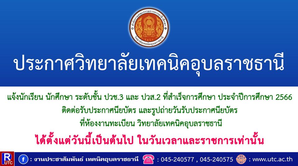 แจ้งนักเรียน นักศึกษา ระดับชั้น ปวช.3 และ ปวส.2 ที่สำเร็จการศึกษา ประจำปีการศึกษา 2566 ติดต่อรับประกาศนียบัตร และรูปถ่ายวันรับประกาศนียบัตร ที่ห้องงานทะเบียน วิทยาลัยเทคนิคอุบลราชธานี ได้ตั้งแต่วันนี้เป็นต้นไป ในวันเวลาและราชการเท่านั้น
