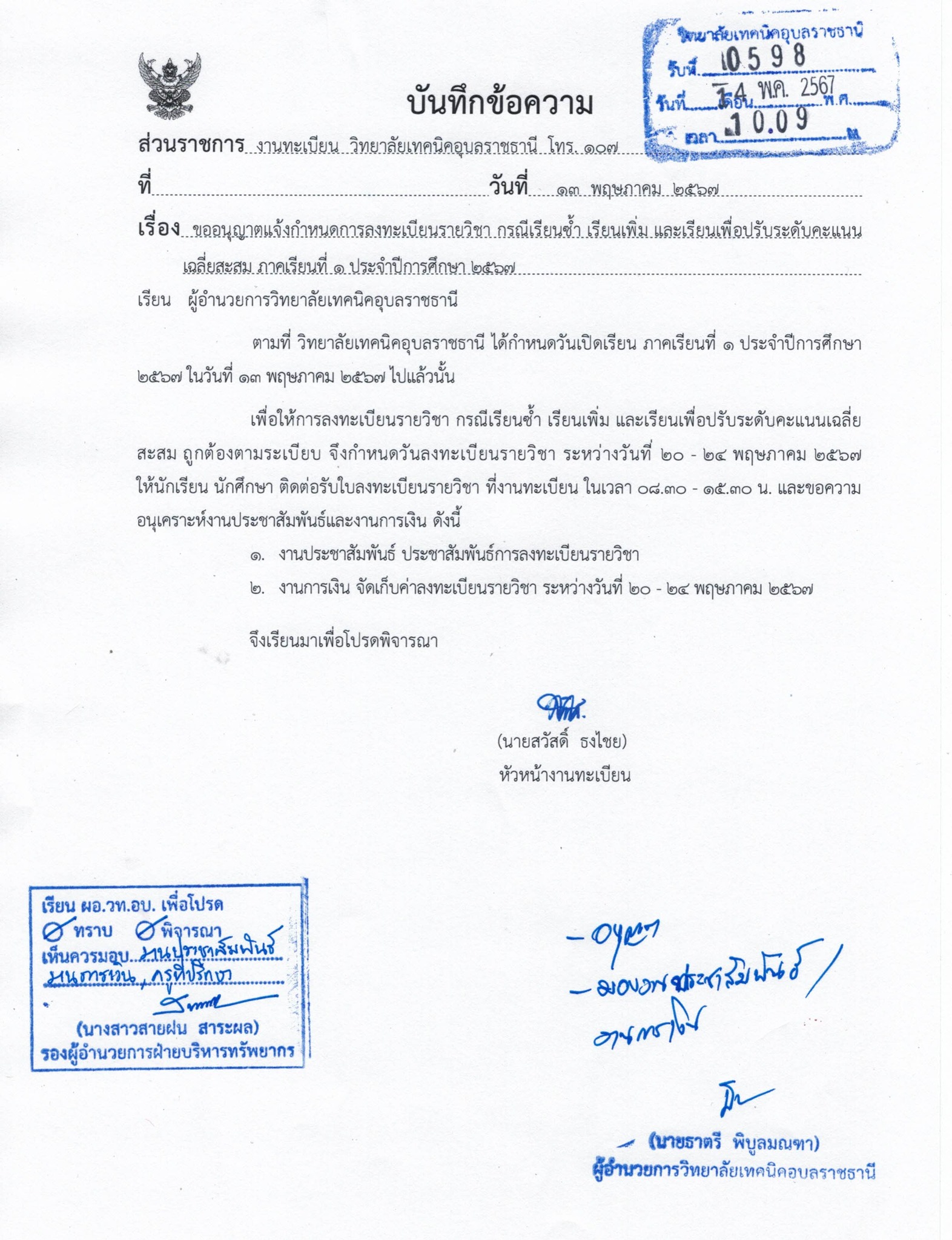 เพื่อให้การลงทะเบียนรายวิชา กรณีเรียนซ้ำ เรียนเพิ่ม และเรียนเพื่อปรับระดับคะแนนเฉลี่ยสะสม ถูกต้องตามระเบียบ วิทยาลัยเทคนิคอุบลราชธานี จึงกำหนดวันลงทะเบียนรายวิชา ระหว่างวันที่ 20 – 24 พฤษภาคม 2567