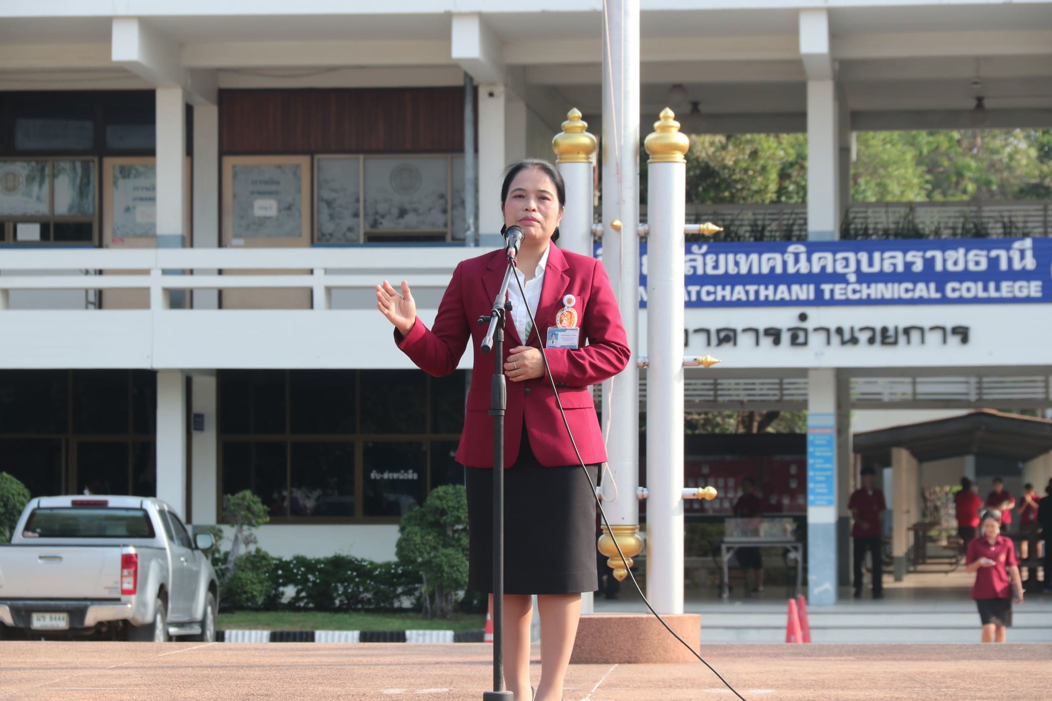วันที่ ๑๕ พฤษภาคม ๒๕๖๗ เวลา ๐๗.๓๐ น. นายธาตรี พิบูลมณฑา ผู้อำนวยการวิทยาลัยเทคนิคอุบลราชธานี มอบหมายให้ นางสาวสายฝน สาระผล รองผู้อำนวยการฝ่ายบริหารทรัพยากร ให้โอวาทแก่นักเรียน นักศึกษา เรื่องการลงทะเบียนเรียน และความรับผิดชอบต่อหน้าที่ของนักเรียน นักศึกษา นอกจากนี้ได้แนะนำคณะครู ที่ได้ย้ายและมาช่วยปฏิบัติราชการ ทั้ง ๕ ท่าน ณ วิทยาลัยเทคนิคอุบลราชธานี ได้แก่ ๑.นายณัฐกร หมื่นทอง ครูแผนกวิชาช่างยนต์/เครื่องกล ๒.นางสาวบุญญาพร วิลามาศ ครูแผนกวิชาช่างไฟฟ้ากำลัง ๓.นายธนพัฒน์ ใจตรง ครูหมวดวิชาภาษาต่างประเทศ แผนกวิชาสามัญสัมพันธ์ ๔.นายวัฒนกร ไชยพล ครูแผนกวิชาอิเล็กทรอนิกส์ และ๕.นางสาวพิมพ์พัชชา แก้วมหาวงศ์ ครูหมวดวิชาสังคมศึกษา แผนกวิชาสามัญสัมพันธ์ ทั้งนี้มี นายไวพจน์ ศรีธัญ รองผู้อำนวยการฝ่ายพัฒนากิจการนักเรียนนักศึกษา นายสุวิชา มั่นยืน รองผู้อำนวยการฝ่ายวิชาการ นางราตรี สะดีวงศ์ รองผู้อำนวยการฝ่ายแผนงานและความร่วมมือ นำคณะครู บุคลากรทางการศึกษา และนักเรียน นักศึกษา เข้าร่วมกิจกรรมหน้าเสาธงอย่างพร้อมเพรียง