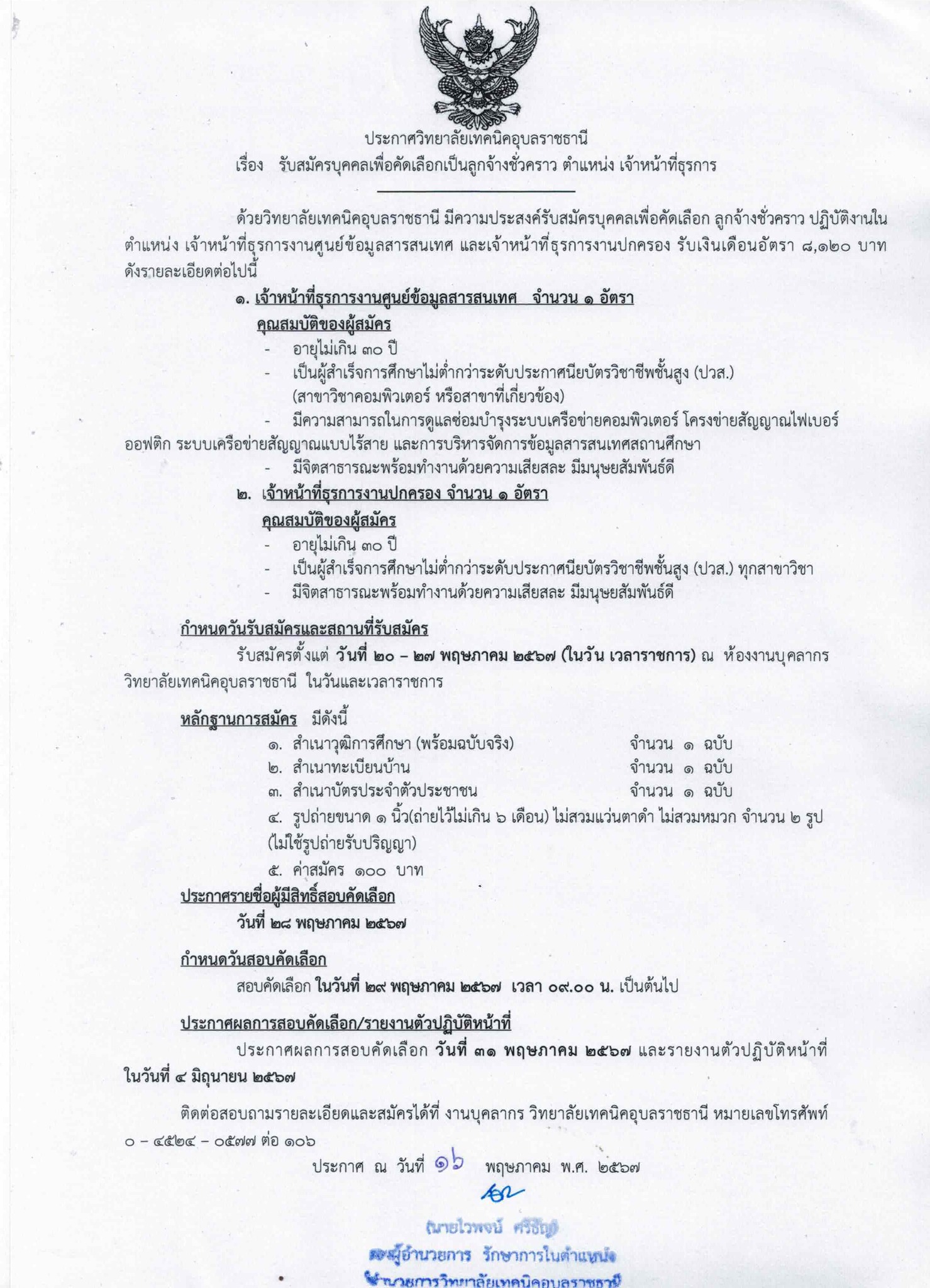 ด้วย วิทยาลัยเทคนิคอุบลราชธานี มีความประสงค์รับสมัครบุคคลเพื่อคัดเลือก ลูกจ้างชั่วคราว ปฏิบัติงานในตำแหน่ง เจ้าหน้าที่ธุรการงานศูนย์ข้อมูลสารสนเทศ และเจ้าหน้าที่ธุรการงานปกครอง รับเงินเดือนอัตรา 8,120 บาท ดังรายละเอียดต่อไปนี้