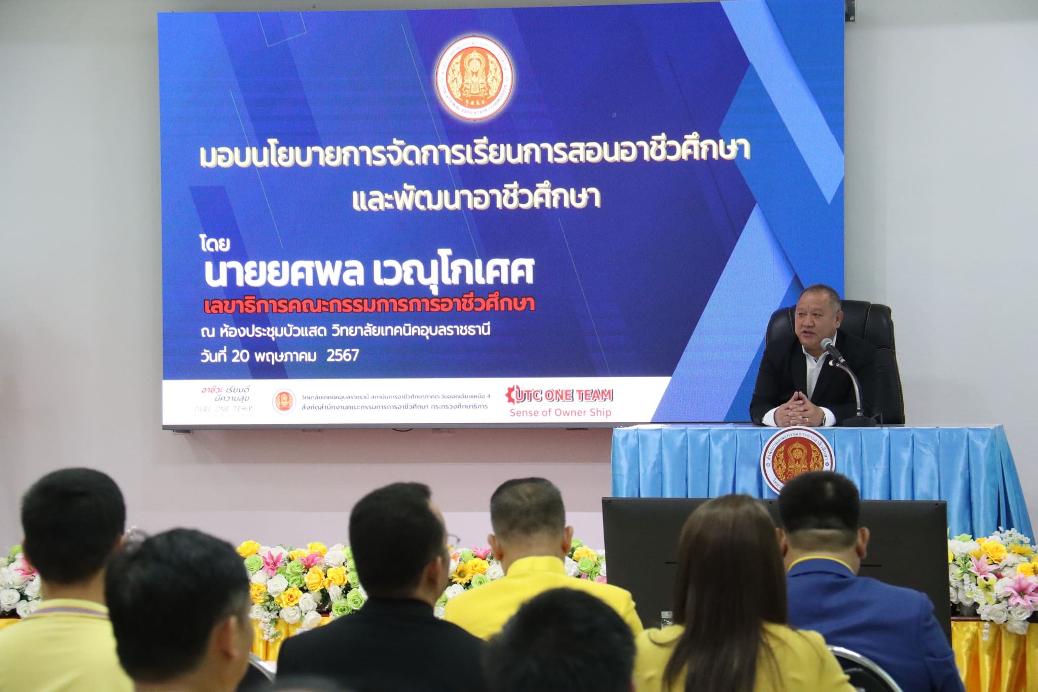 วันที่ ๒๐ พฤษภาคม ๒๕๖๗ เวลา ๐๙.๐๐ น. นายยศพล เวณุโกเศศ เลขาธิการคณะกรรมการการอาชีวศึกษา ให้เกียรติเป็นประธานในการประชุมมอบนโยบาย “การพัฒนาอาชีวศึกษา” ณ ห้องประชุมบัวแสด วิทยาลัยเทคนิคอุบลราชธานี ในการนี้ นายธาตรี พิบูลมณฑา ผู้อำนวยการวิทยาลัยเทคนิคอุบลราชธานี ปฏิบัติหน้าที่ ผู้อำนวยการสำนักงานอาชีวศึกษาจังหวัดอุบลราชธานี ให้เกียรติกล่าวต้อนรับ ต่อมาได้ลงพื้นที่ตรวจเยี่ยมการจัดการเรียนการสอน ได้แก่ ๑.แผนกวิชาช่างอากาศยาน ๒.ศูนย์การเรียนรู้เทคโนโลยียานยนต์ไฟฟ้า วิทยาลัยเทคนิคอุบลราชธานี แผนกวิชาช่างยนต์/เครื่องกล ๓.แผนกวิชาช่างกลโรงงาน และ๔.แผนกวิชาช่างไฟฟ้ากำลัง โดยมีคณะผู้บริหารสถานศึกษา ครู และบุคลากรทางการศึกษา ในสังกัดสำนักงานอาชีวศึกษาจังหวัดอุบลราชธานี ร่วมให้การต้อนรับและรับฟังการมอบนโยบายการขับเคลื่อนอาชีวศึกษาด้านการจัดการเรียนการสอนอย่างพร้อมเพรียง
