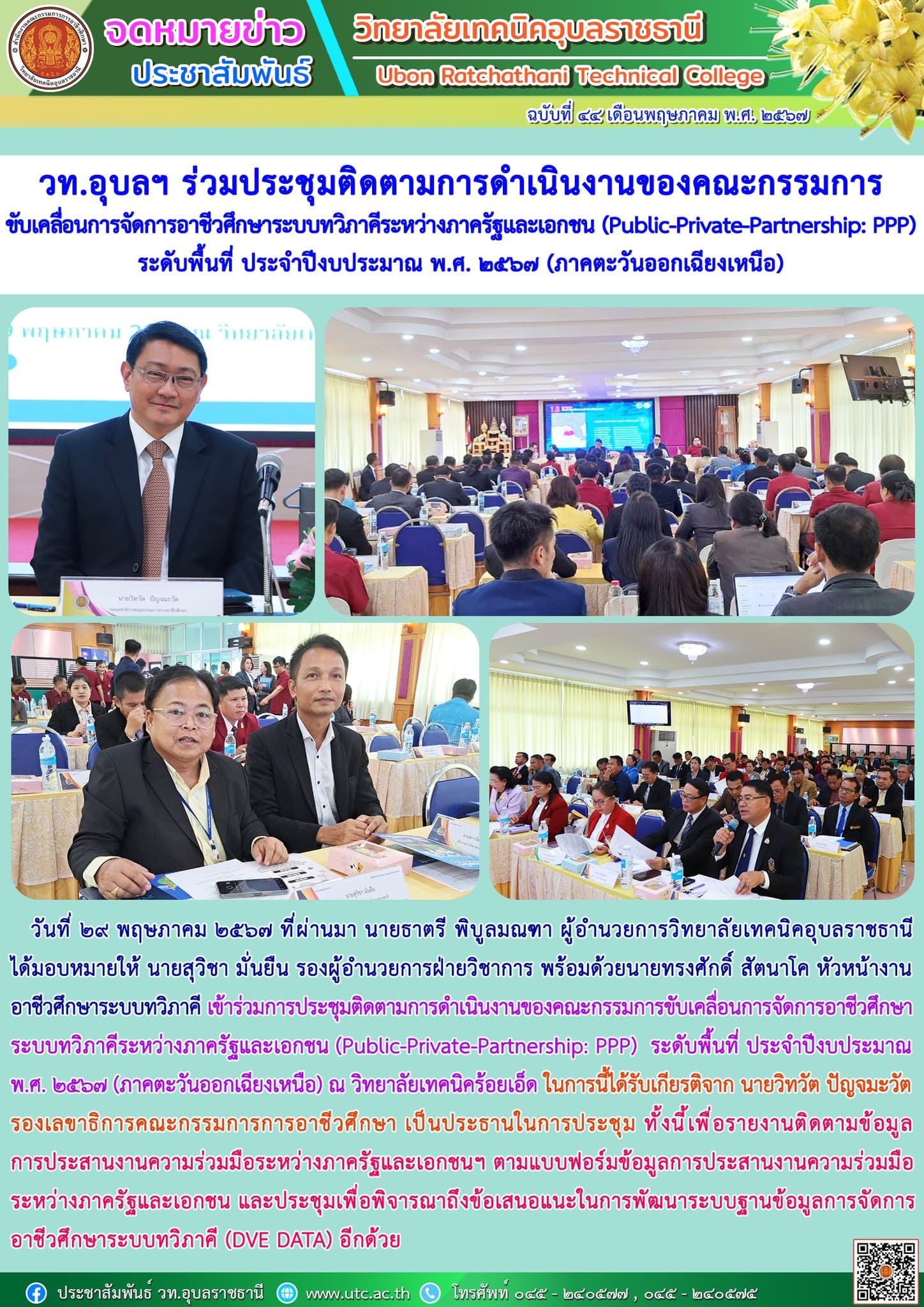 วันที่ ๒๙ พฤษภาคม ๒๕๖๗ ที่ผ่านมา นายธาตรี พิบูลมณฑา ผู้อำนวยการวิทยาลัยเทคนิคอุบลราชธานี ได้มอบหมายให้ นายสุวิชา มั่นยืน รองผู้อำนวยการฝ่ายวิชาการ พร้อมด้วยนายทรงศักดิ์ สัตนาโค หัวหน้างานอาชีวศึกษาระบบทวิภาคี เข้าร่วมการประชุมติดตามการดำเนินงานของคณะกรรมการขับเคลื่อนการจัดการอาชีวศึกษาระบบทวิภาคีระหว่างภาครัฐและเอกชน (Public-Private-Partnership: PPP) ระดับพื้นที่ ประจำปีงบประมาณ พ.ศ. ๒๕๖๗ (ภาคตะวันออกเฉียงเหนือ) ณ วิทยาลัยเทคนิคร้อยเอ็ด ในการนี้ได้รับเกียรติจาก นายวิทวัต ปัญจมะวัต รองเลขาธิการคณะกรรมการการอาชีวศึกษา เป็นประธานในการประชุม ทั้งนี้เพื่อรายงานติดตามข้อมูล การประสานงานความร่วมมือระหว่างภาครัฐและเอกชนฯ ตามแบบฟอร์มข้อมูลการประสานงานความร่วมมือระหว่างภาครัฐและเอกชน และประชุมเพื่อพิจารณาถึงข้อเสนอแนะในการพัฒนาระบบฐานข้อมูลการจัดการอาชีวศึกษาระบบทวิภาคี (DVE DATA) อีกด้วย