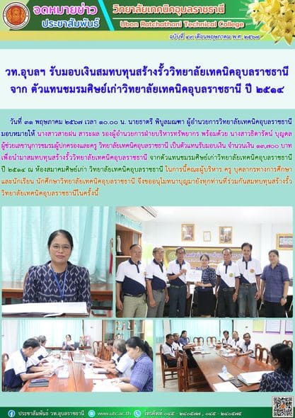 วันที่ ๓๑ พฤษภาคม ๒๕๖๗ เวลา ๑๐.๐๐ น. นายธาตรี พิบูลมณฑา ผู้อำนวยการวิทยาลัยเทคนิคอุบลราชธานีมอบหมายให้ นางสาวสายฝน สาระผล รองผู้อำนวยการฝ่ายบริหารทรัพยากร พร้อมด้วย นางสาวธิดารัตน์ บุญดล ผู้ช่วยเลขานุการชมรมผู้ปกครองและครู วิทยาลัยเทคนิคอุบลราชธานี เป็นตัวแทนรับมอบเงิน จำนวนเงิน ๑๓,๗๐๐ บาทเพื่อนำมาสมทบทุนสร้างรั้ววิทยาลัยเทคนิคอุบลราชธานี จากตัวแทนชมรมศิษย์เก่าวิทยาลัยเทคนิคอุบลราชธานี ปี ๒๕๑๔ ณ ห้องสมาคมศิษย์เก่า วิทยาลัยเทคนิคอุบลราชธานี ในการนี้คณะผู้บริหาร ครู บุคลากรทางการศึกษาและนักเรียน นักศึกษาวิทยาลัยเทคนิคอุบลราชธานี จึงขออนุโมทนาบุญมายังทุกท่านที่ร่วมกันสมทบทุนสร้างรั้ว วิทยาลัยเทคนิคอุบลราชธานีในครั้งนี้