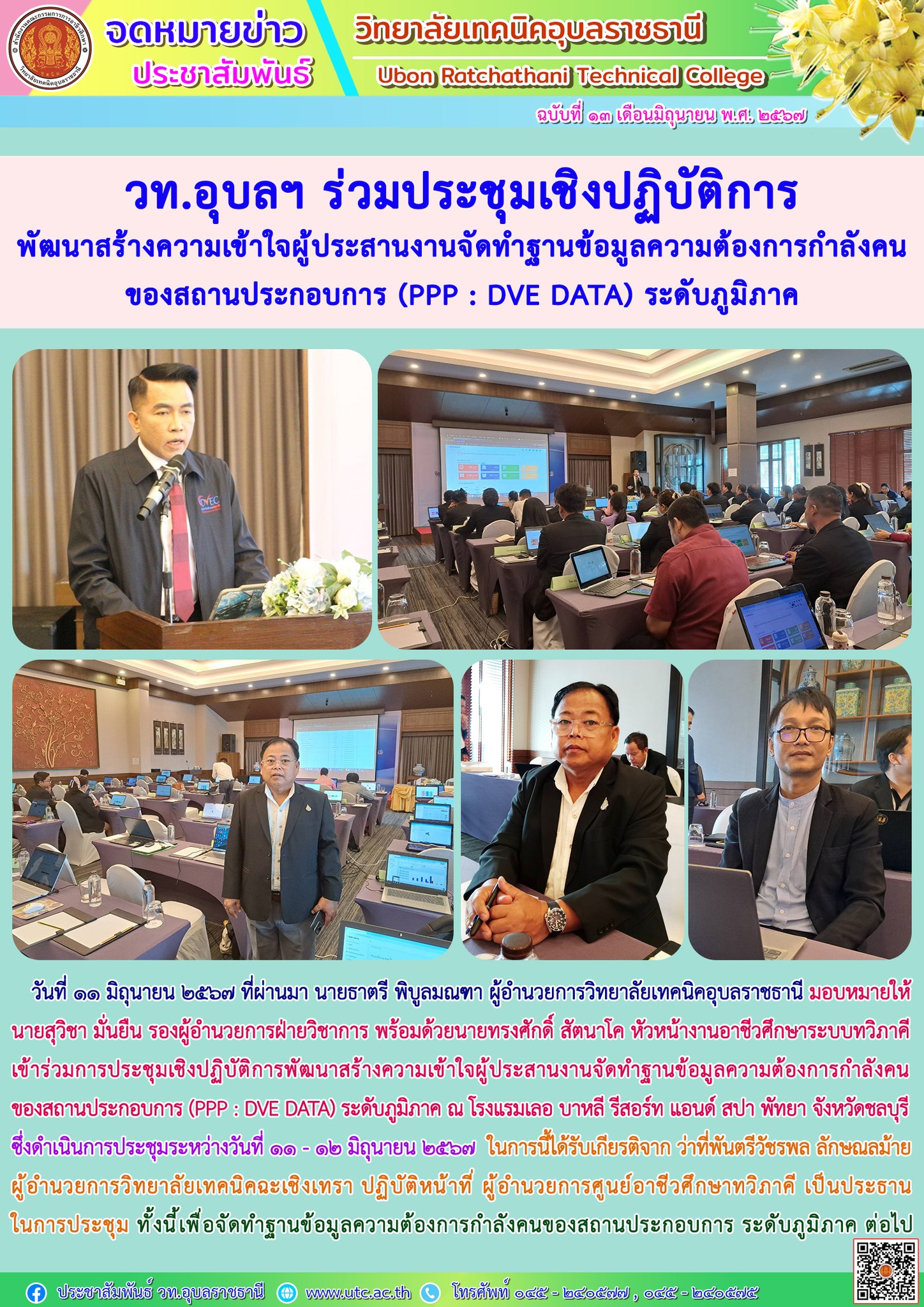 วันที่ ๑๑ มิถุนายน ๒๕๖๗ ที่ผ่านมา นายธาตรี พิบูลมณฑา ผู้อำนวยการวิทยาลัยเทคนิคอุบลราชธานี ได้มอบหมายให้ นายสุวิชา มั่นยืน รองผู้อำนวยการฝ่ายวิชาการ พร้อมด้วยนายทรงศักดิ์ สัตนาโค หัวหน้างานอาชีวศึกษาระบบทวิภาคี เข้าร่วมการประชุมเชิงปฏิบัติการพัฒนาสร้างความเข้าใจผู้ประสานงานจัดทำฐานข้อมูลความต้องการกำลังคนของสถานประกอบการ (PPP : DVE DATA) ระดับภูมิภาค ณ โรงแรมเลอ บาหลี รีสอร์ท แอนด์ สปา พัทยา จังหวัดชลบุรี ซึ่งดำเนินการประชุมระหว่างวันที่ ๑๑ – ๑๒ มิถุนายน ๒๕๖๗ ในการนี้ได้รับเกียรติจาก ว่าที่พันตรีวัชรพล ลักษณลม้าย ผู้อำนวยการวิทยาลัยเทคนิคฉะเชิงเทรา ปฏิบัติหน้าที่ ผู้อำนวยการศูนย์อาชีวศึกษาทวิภาคี เป็นประธานในการประชุม ทั้งนี้เพื่อจัดทำฐานข้อมูลความต้องการกำลังคนของสถานประกอบการ ระดับภูมิภาค ต่อไป