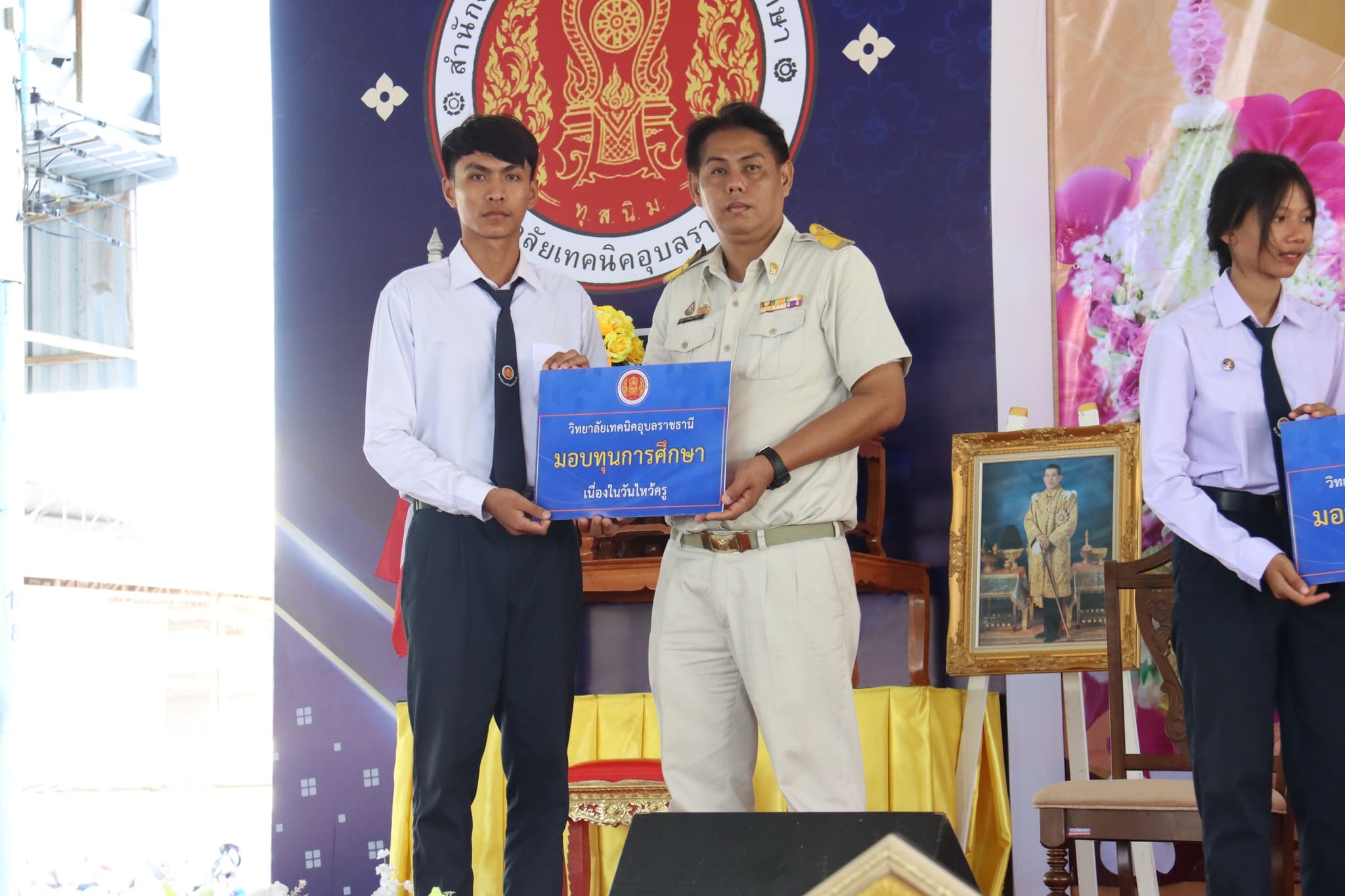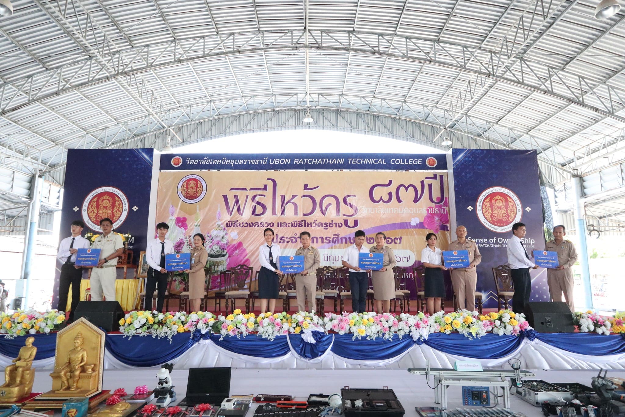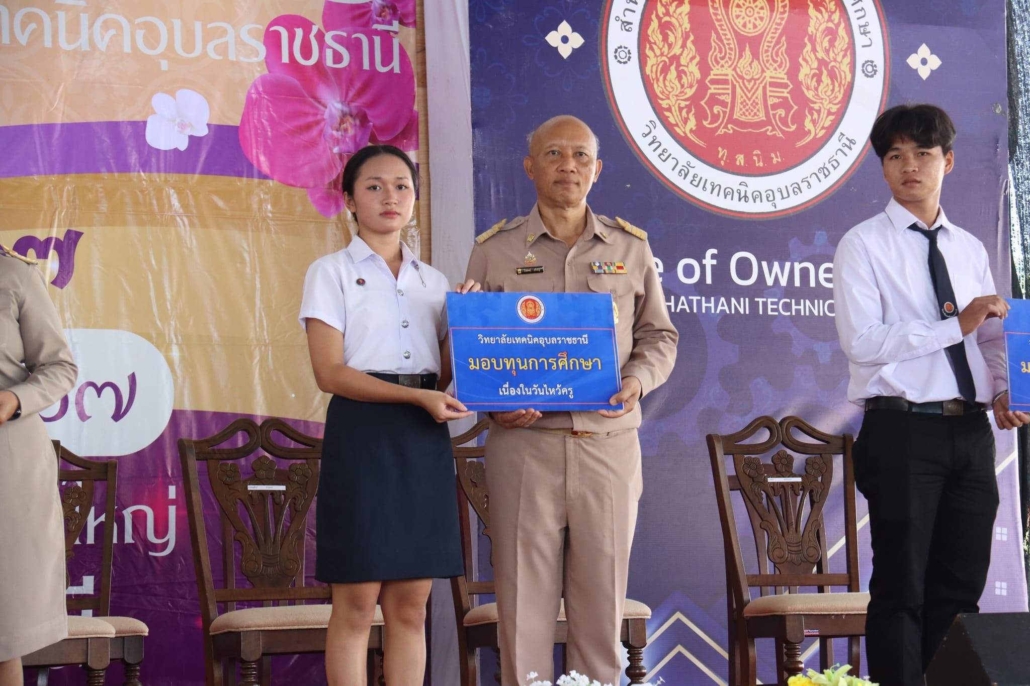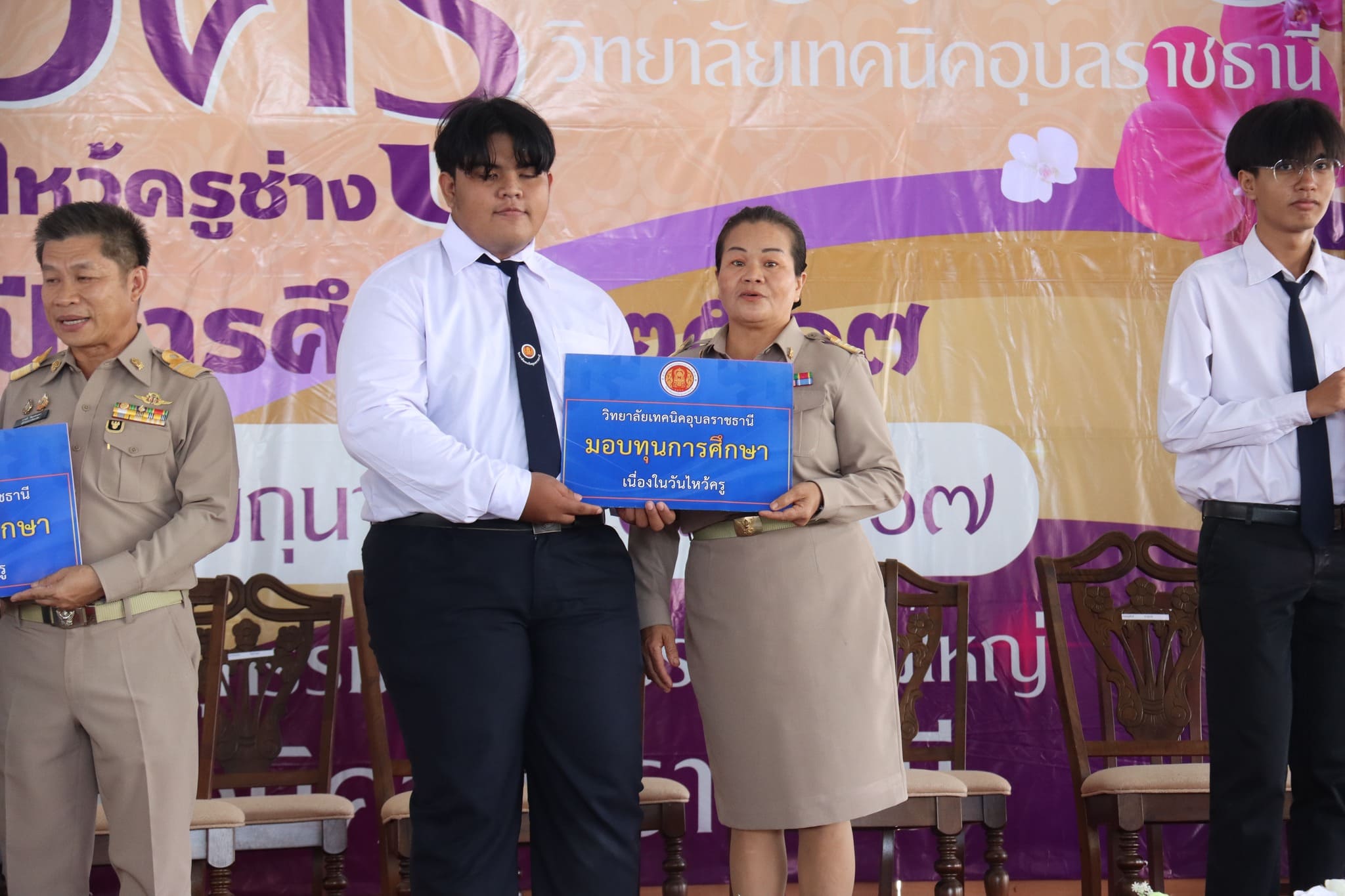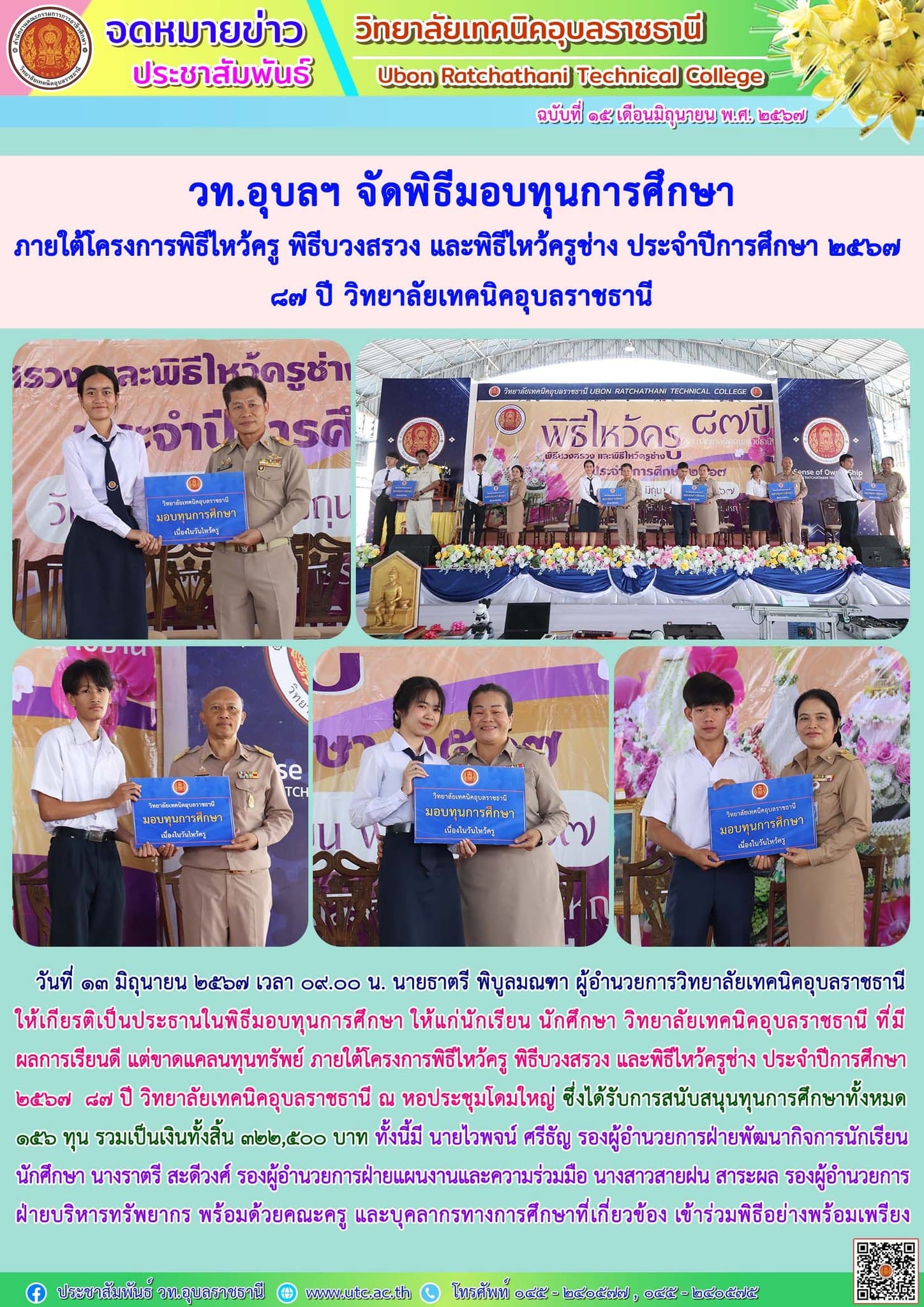 วันที่ ๑๓ มิถุนายน ๒๕๖๗ เวลา ๐๙.๐๐ น. นายธาตรี พิบูลมณฑา ผู้อำนวยการวิทยาลัยเทคนิคอุบลราชธานี ให้เกียรติเป็นประธานในพิธีมอบทุนการศึกษา ให้แก่นักเรียน นักศึกษา วิทยาลัยเทคนิคอุบลราชธานี ที่มีผลการเรียนดี แต่ขาดแคลนทุนทรัพย์ ภายใต้โครงการพิธีไหว้ครู พิธีบวงสรวง และพิธีไหว้ครูช่าง ประจำปีการศึกษา ๒๕๖๗ ๘๗ ปี วิทยาลัยเทคนิคอุบลราชธานี ณ หอประชุมโดมใหญ่ ซึ่งได้รับการสนับสนุนทุนการศึกษาทั้งหมด ๑๕๖ ทุน รวมเป็นเงินทั้งสิ้น ๓๒๒,๕๐๐ บาท ทั้งนี้มี นายไวพจน์ ศรีธัญ รองผู้อำนวยการฝ่ายพัฒนากิจการนักเรียนนักศึกษา นางราตรี สะดีวงศ์ รองผู้อำนวยการฝ่ายแผนงานและความร่วมมือ นางสาวสายฝน สาระผล รองผู้อำนวยการฝ่ายบริหารทรัพยากร พร้อมด้วยคณะครู และบุคลากรทางการศึกษาที่เกี่ยวข้อง เข้าร่วมพิธีอย่างพร้อมเพรียง
