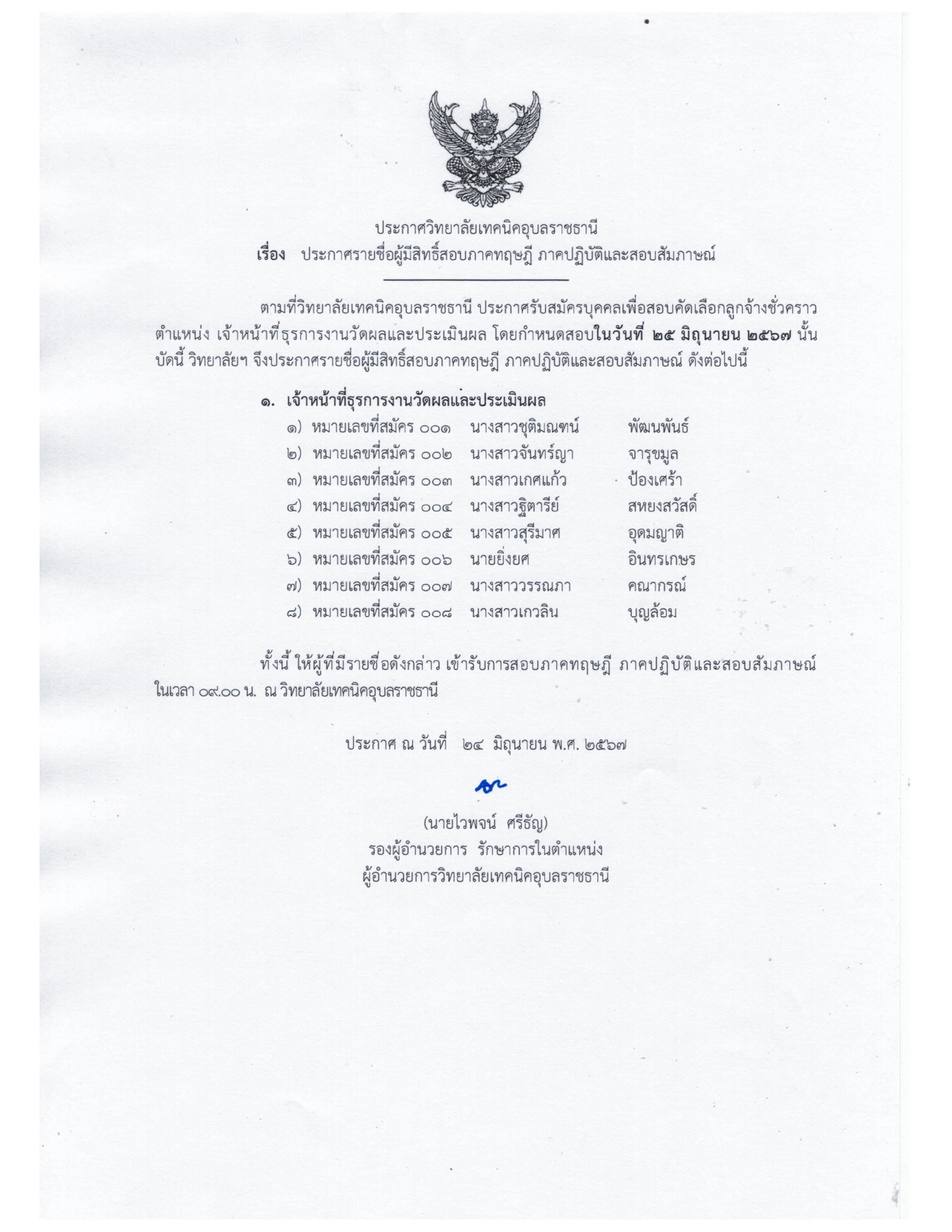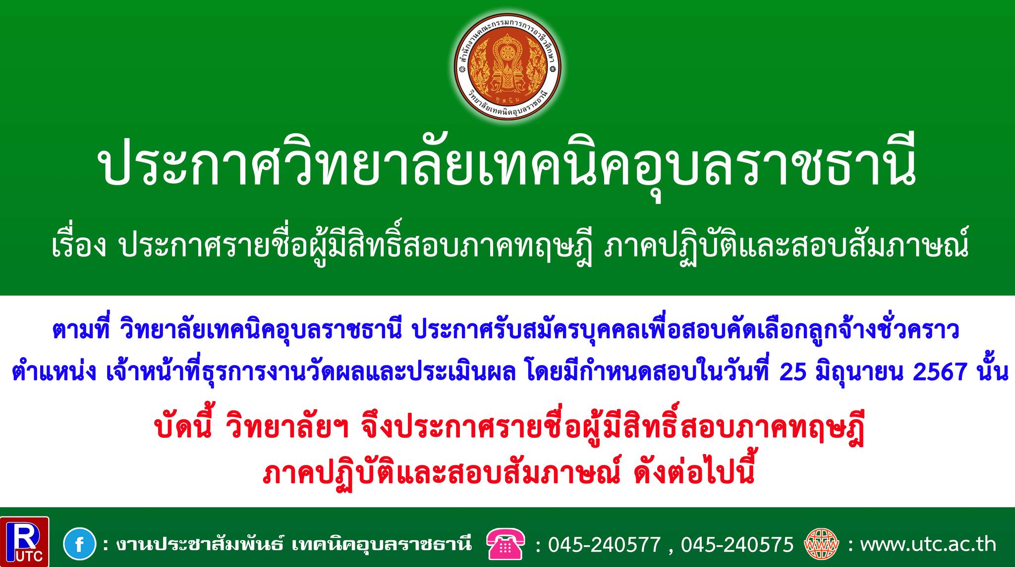 ตามที่ วิทยาลัยเทคนิคอุบลราชธานี ประกาศรับสมัครบุคคลเพื่อสอบคัดเลือกลูกจ้างชั่วคราว ตำแหน่ง เจ้าหน้าที่ธุรการงานวัดผลและประเมินผล โดยมีกำหนดสอบในวันที่ 25 มิถุนายน 2567 นั้น