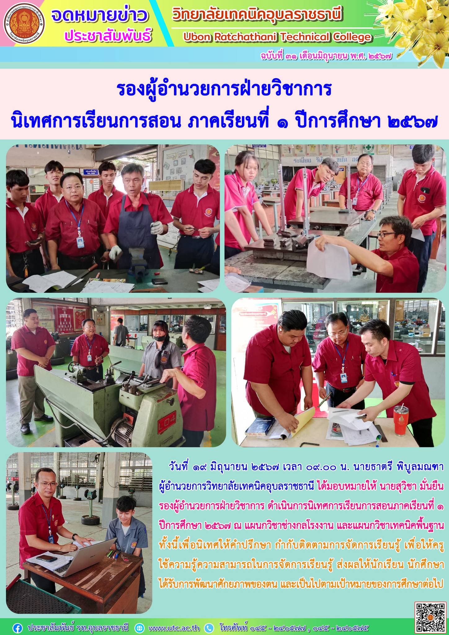 วันที่ ๑๙ มิถุนายน ๒๕๖๗ เวลา ๐๙.๐๐ น. นายธาตรี พิบูลมณฑา ผู้อำนวยการวิทยาลัยเทคนิคอุบลราชธานี ได้มอบหมายให้ นายสุวิชา มั่นยืน รองผู้อำนวยการฝ่ายวิชาการ ดำเนินการนิเทศการเรียนการสอนภาคเรียนที่ ๑ ปีการศึกษา ๒๕๖๗ ณ แผนกวิชาช่างกลโรงงาน และแผนกวิชาเทคนิคพื้นฐาน ทั้งนี้เพื่อนิเทศให้คำปรึกษา กำกับติดตามการจัดการเรียนรู้ เพื่อให้ครูใช้ความรู้ความสามารถในการจัดการเรียนรู้ ส่งผลให้นักเรียน นักศึกษา ได้รับการพัฒนาศักยภาพของตน และเป็นไปตามเป้าหมายของการศึกษาต่อไป