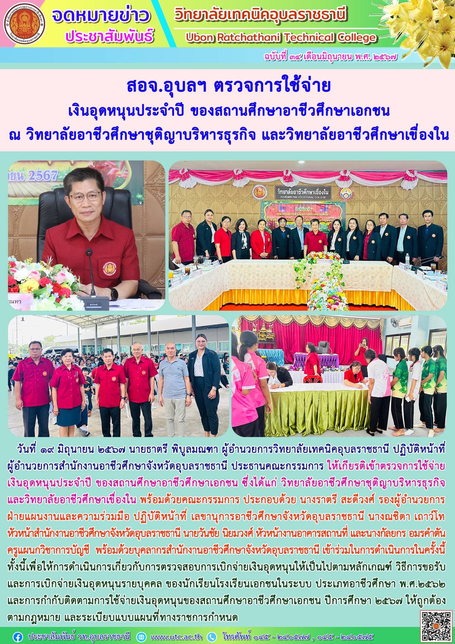 วันที่ ๑๙ มิถุนายน ๒๕๖๗ นายธาตรี พิบูลมณฑา ผู้อำนวยการวิทยาลัยเทคนิคอุบลราชธานี ปฏิบัติหน้าที่ ผู้อำนวยการสำนักงานอาชีวศึกษาจังหวัดอุบลราชธานี ประธานคณะกรรมการ ให้เกียรติเข้าตรวจการใช้จ่ายเงินอุดหนุนประจำปี ของสถานศึกษาอาชีวศึกษาเอกชน ซึ่งได้แก่ วิทยาลัยอาชีวศึกษาชุติญาบริหารธุรกิจ และวิทยาลัยอาชีวศึกษาเขื่องใน พร้อมด้วยคณะกรรมการ ประกอบด้วย นางราตรี สะดีวงศ์ รองผู้อำนวยการฝ่ายแผนงานและความร่วมมือ ปฏิบัติหน้าที่ เลขานุการอาชีวศึกษาจังหวัดอุบลราชธานี นางณชิตา เถาว์โท หัวหน้าสำนักงานอาชีวศึกษาจังหวัดอุบลราชธานี นายวันชัย นิยมวงศ์ หัวหน้างานอาคารสถานที่ และนางกัลยกร อมรคำตัน ครูแผนกวิชาการบัญชี พร้อมด้วยบุคลากรสำนักงานอาชีวศึกษาจังหวัดอุบลราชธานี เข้าร่วมในการดำเนินการในครั้งนี้ ทั้งนี้เพื่อให้การดำเนินการเกี่ยวกับการตรวจสอบการเบิกจ่ายเงินอุดหนุนให้เป็นไปตามหลักเกณฑ์ วิธีการขอรับและการเบิกจ่ายเงินอุดหนุนรายบุคคล ของนักเรียนโรงเรียนเอกชนในระบบ ประเภทอาชีวศึกษา พ.ศ.๒๕๖๒ และการกำกับติดตามการใช้จ่ายเงินอุดหนุนของสถานศึกษาอาชีวศึกษาเอกชน ปีการศึกษา ๒๕๖๗ ให้ถูกต้องตามกฎหมาย และระเบียบแบบแผนที่ทางราชการกำหนด