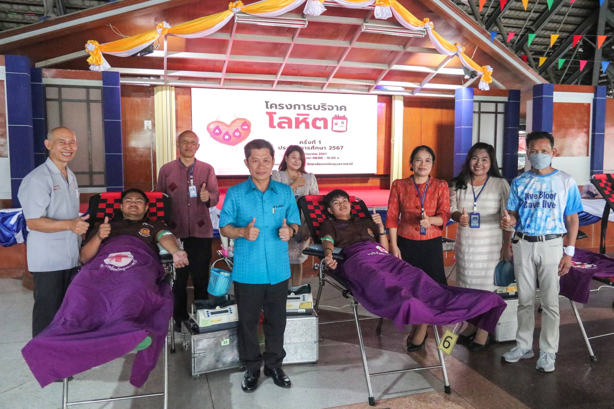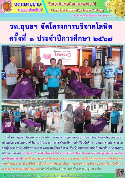 วันที่ ๒๑ มิถุนายน ๒๕๖๗ เวลา ๐๙.๓๐ น. นายธาตรี พิบูลมณฑา ผู้อำนวยการวิทยาลัยเทคนิคอุบลราชธานี พร้อมด้วย นายไวพจน์ ศรีธัญ รองผู้อำนวยการฝ่ายพัฒนากิจการนักเรียนนักศึกษา นางสาวสายฝน สาระผล รองผู้อำนวยการฝ่ายบริหารทรัพยากร และนางสุภัดสา ศิริชนะ หัวหน้างานสวัสดิการนักเรียนนักศึกษา นำคณะครู นักเรียน นักศึกษา เข้าร่วมโครงการบริจาคโลหิต ครั้งที่ ๑ ประจำปีการศึกษา ๒๕๖๗ ณ หอประชุมโดมน้อย วิทยาลัยเทคนิคอุบลราชธานี โดยได้รับความอนุเคราะห์คณะแพทย์ พยาบาล และเจ้าหน้าที่จากโรงพยาบาลสรรพสิทธิประสงค์ จังหวัดอุบลราชธานี มาให้บริการรับบริจาคโลหิต โดยมีครู บุคลากรทางการศึกษา และนักเรียน นักศึกษา เข้าร่วมกิจกรรมอย่างพร้อมเพรียง ทั้งนี้เพื่อนำโลหิตไปช่วยเหลือในการรักษาผู้ป่วยต่อไป