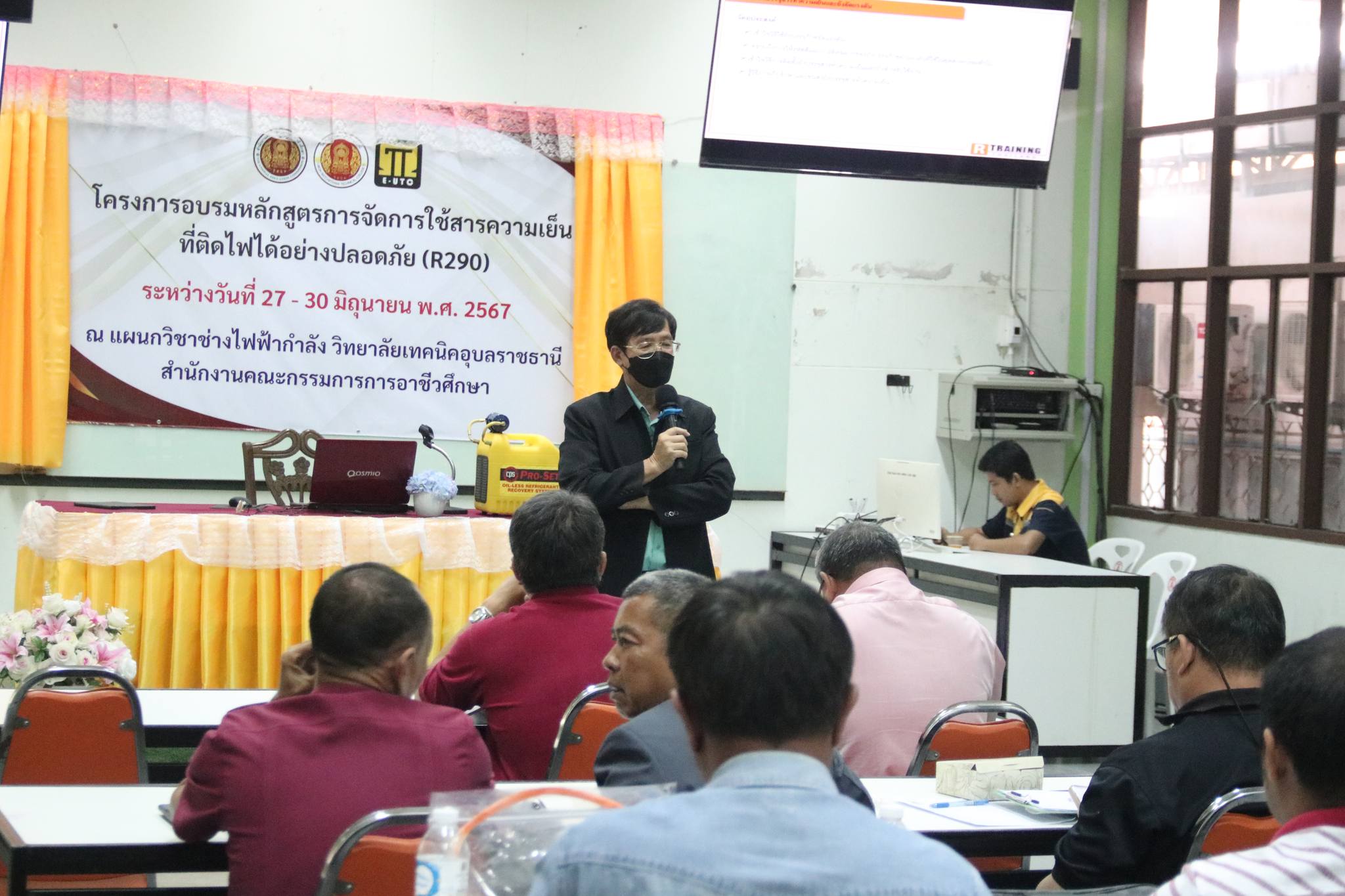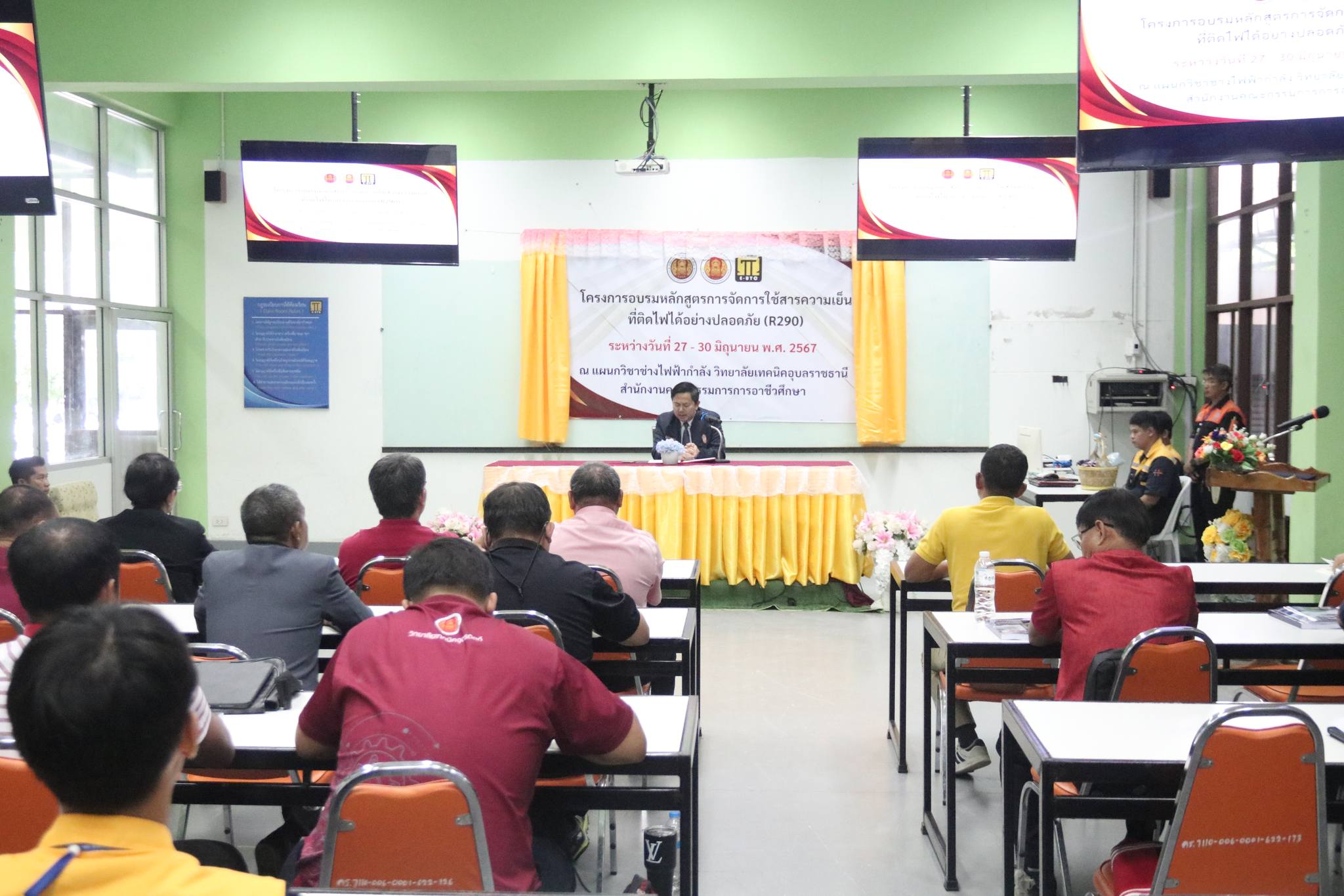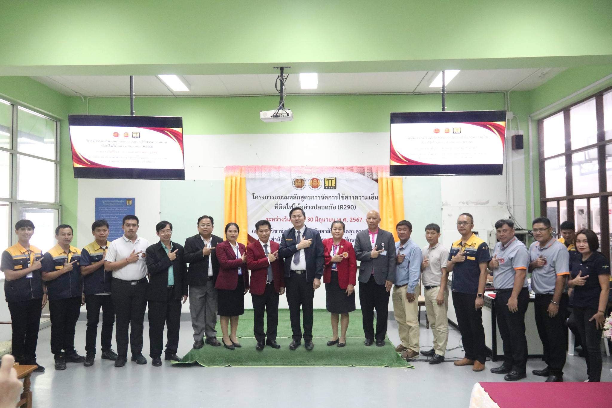 วันที่ ๒๗ มิถุนายน ๒๕๖๗ เวลา ๑๓.๐๐ น. ดร.ธนภัทร แสงจันทร์ ผู้อำนวยการสำนักความร่วมมือ สำนักงานคณะกรรมการการอาชีวศึกษา ให้เกียรติเป็นประธานในพิธีเปิดโครงการอบรมหลักสูตรการจัดการใช้สารทำความเย็นที่ติดไฟได้อย่างปลอดภัย (R๒๙๐ Training Thailand) โดยได้รับงบประมาณสนับสนุนจาก การไฟฟ้าฝ่ายผลิตแห่งประเทศไทย (กฟผ.) ณ แผนกวิชาช่างไฟฟ้ากำลัง วิทยาลัยเทคนิคอุบลราชธานี ในการนี้ นายธาตรี พิบูลมณฑา ผู้อำนวยการวิทยาลัยเทคนิคอุบลราชธานี ให้เกียรติเป็นผู้กล่าวรายงาน โดยมี นายไวพจน์ ศรีธัญ รองผู้อำนวยการฝ่ายพัฒนากิจการนักเรียนนักศึกษา นายสุวิชา มั่นยืน รองผู้อำนวยการฝ่ายวิชาการ นางราตรี สะดีวงษ์ รองผู้อำนวยการฝ่ายแผนงานและความร่วมมือ นางสาวสายฝน สาระผล รองผู้อำนวยการฝ่ายบริหารทรัพยากร นายจำรัส ชนะสิงห์ หัวหน้าแผนกวิชาช่างไฟฟ้ากำลัง พร้อมด้วยผู้เข้ารับการอบรมซึ่งเป็นตัวแทนคณะครู ในสังกัดสำนักงานคณะกรรมการการอาชีวศึกษา เข้าร่วมการอบรมอย่างพร้อมเพรียง ทั้งนี้เพื่อสร้างความรู้ความเข้าใจและพัฒนาช่างฝีมือให้เกิดความตระหนักเกี่ยวกับเทคโนโลยีการใช้สารทำความเย็นธรรมชาติรวมถึงมาตรฐานด้านความปลอดภัย อีกทั้งยังเพื่อจัดหาและติดตั้งอุปกรณ์สำหรับการฝึก ให้สอดคล้องกับความต้องการที่จำเป็นในการฝึกอบรม รวมถึงสามารถรองรับความต้องการของบุคลากรในเขตพื้นที่ใกล้เคียง และเตรียมความพร้อมสำหรับรองรับการปรับเปลี่ยนมาใช้สารทำความเย็นธรรมชาติที่เป็นมิตรกับสิ่งแวดล้อมอีกด้วย