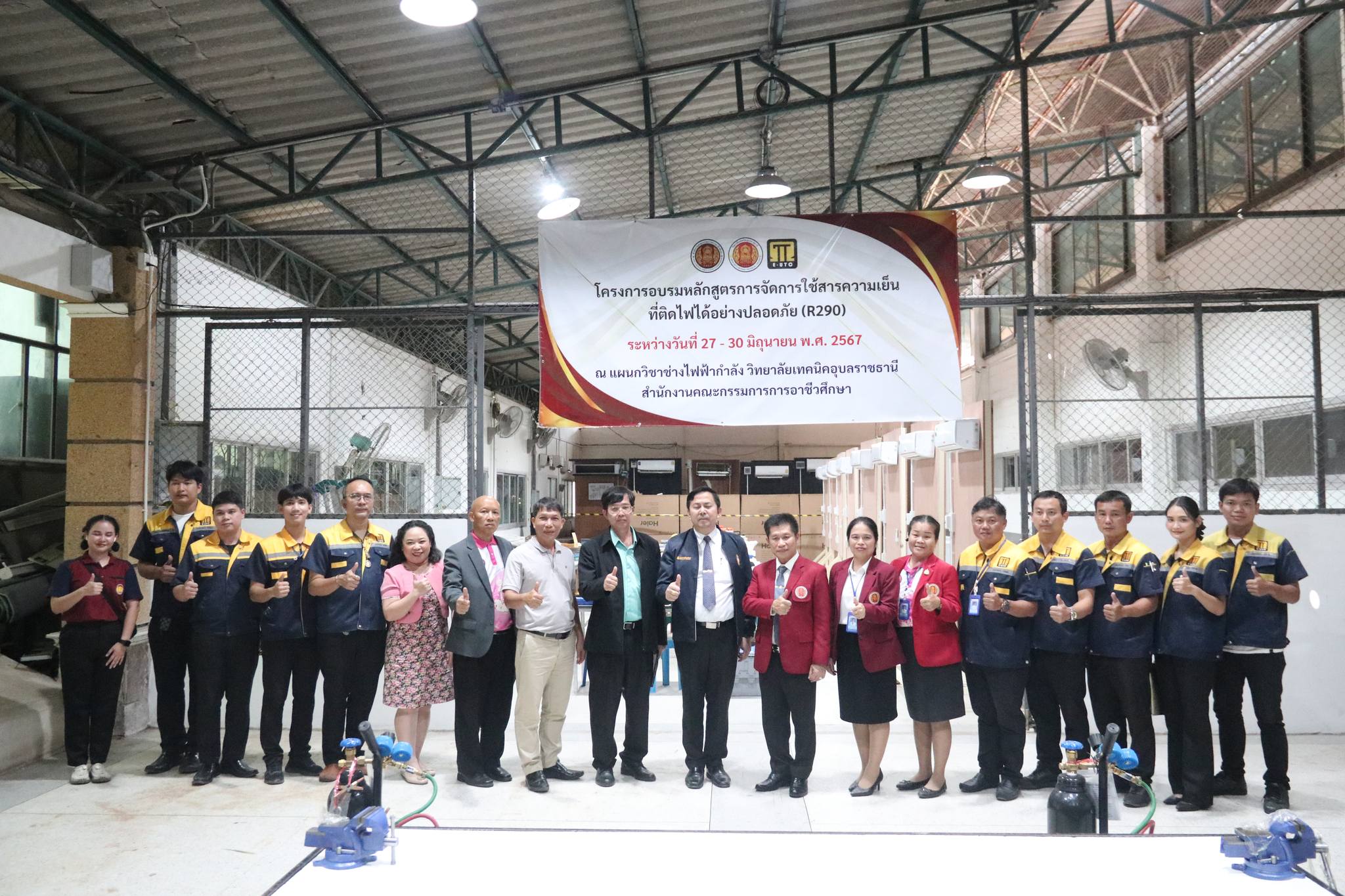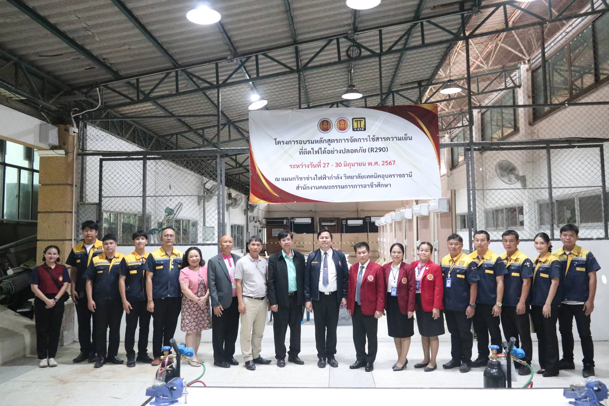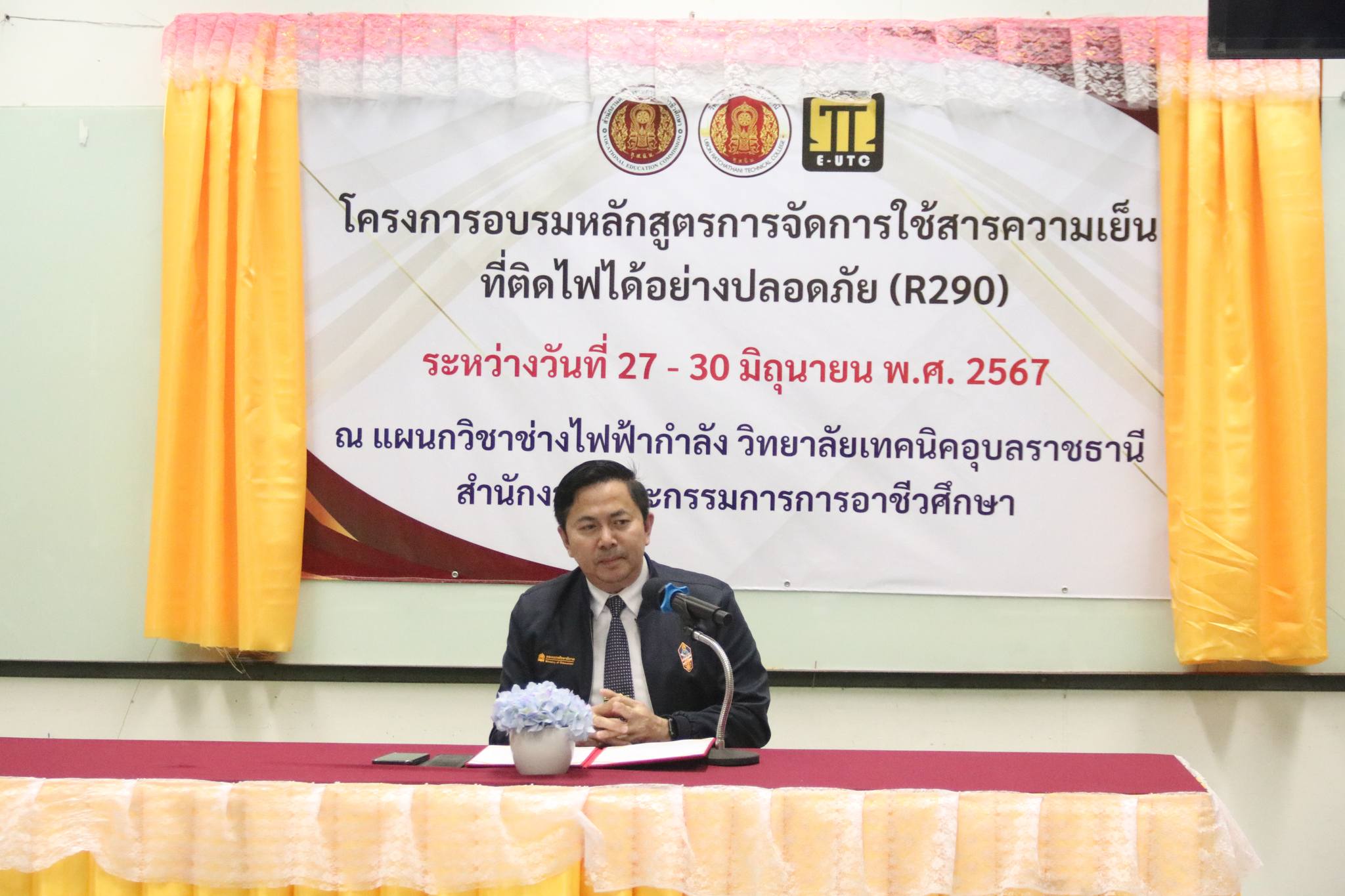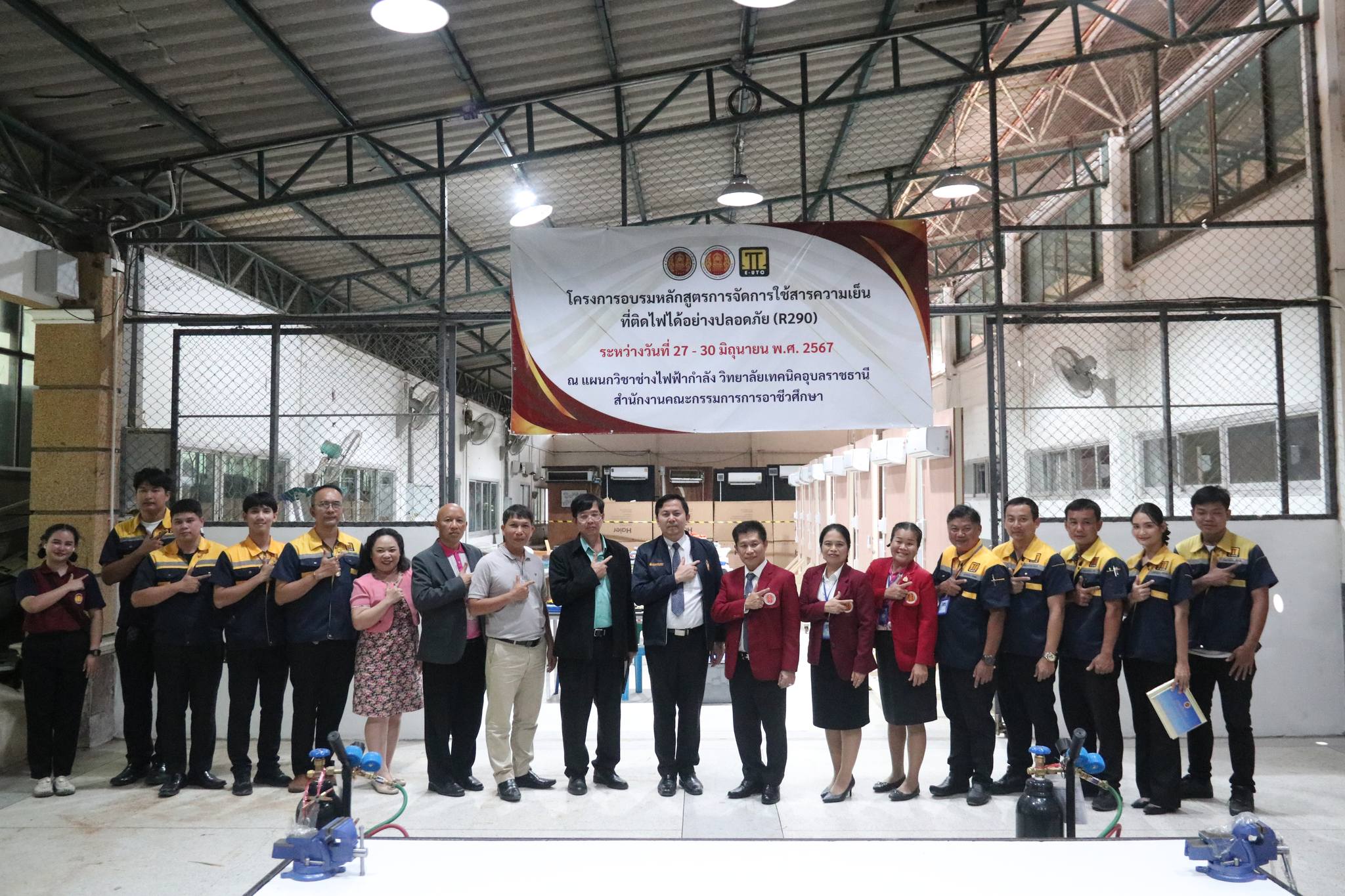 วันที่ ๒๗ มิถุนายน ๒๕๖๗ เวลา ๑๓.๐๐ น. ดร.ธนภัทร แสงจันทร์ ผู้อำนวยการสำนักความร่วมมือ สำนักงานคณะกรรมการการอาชีวศึกษา ให้เกียรติเป็นประธานในพิธีเปิดโครงการอบรมหลักสูตรการจัดการใช้สารทำความเย็นที่ติดไฟได้อย่างปลอดภัย (R๒๙๐ Training Thailand) โดยได้รับงบประมาณสนับสนุนจาก การไฟฟ้าฝ่ายผลิตแห่งประเทศไทย (กฟผ.) ณ แผนกวิชาช่างไฟฟ้ากำลัง วิทยาลัยเทคนิคอุบลราชธานี ในการนี้ นายธาตรี พิบูลมณฑา ผู้อำนวยการวิทยาลัยเทคนิคอุบลราชธานี ให้เกียรติเป็นผู้กล่าวรายงาน โดยมี นายไวพจน์ ศรีธัญ รองผู้อำนวยการฝ่ายพัฒนากิจการนักเรียนนักศึกษา นายสุวิชา มั่นยืน รองผู้อำนวยการฝ่ายวิชาการ นางราตรี สะดีวงษ์ รองผู้อำนวยการฝ่ายแผนงานและความร่วมมือ นางสาวสายฝน สาระผล รองผู้อำนวยการฝ่ายบริหารทรัพยากร นายจำรัส ชนะสิงห์ หัวหน้าแผนกวิชาช่างไฟฟ้ากำลัง พร้อมด้วยผู้เข้ารับการอบรมซึ่งเป็นตัวแทนคณะครู ในสังกัดสำนักงานคณะกรรมการการอาชีวศึกษา เข้าร่วมการอบรมอย่างพร้อมเพรียง ทั้งนี้เพื่อสร้างความรู้ความเข้าใจและพัฒนาช่างฝีมือให้เกิดความตระหนักเกี่ยวกับเทคโนโลยีการใช้สารทำความเย็นธรรมชาติรวมถึงมาตรฐานด้านความปลอดภัย อีกทั้งยังเพื่อจัดหาและติดตั้งอุปกรณ์สำหรับการฝึก ให้สอดคล้องกับความต้องการที่จำเป็นในการฝึกอบรม รวมถึงสามารถรองรับความต้องการของบุคลากรในเขตพื้นที่ใกล้เคียง และเตรียมความพร้อมสำหรับรองรับการปรับเปลี่ยนมาใช้สารทำความเย็นธรรมชาติที่เป็นมิตรกับสิ่งแวดล้อมอีกด้วย
