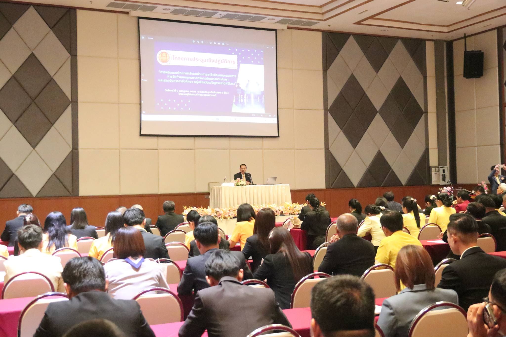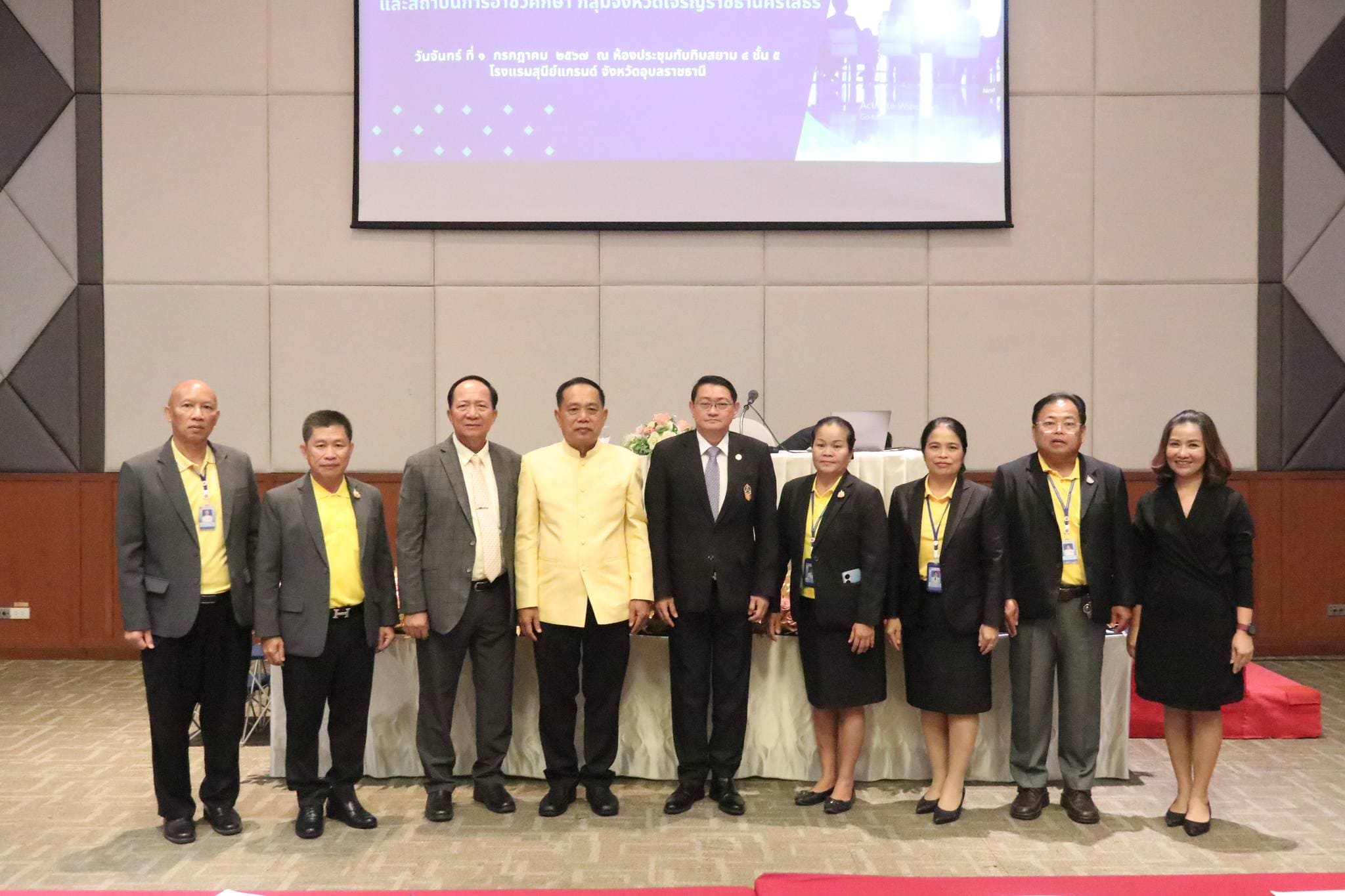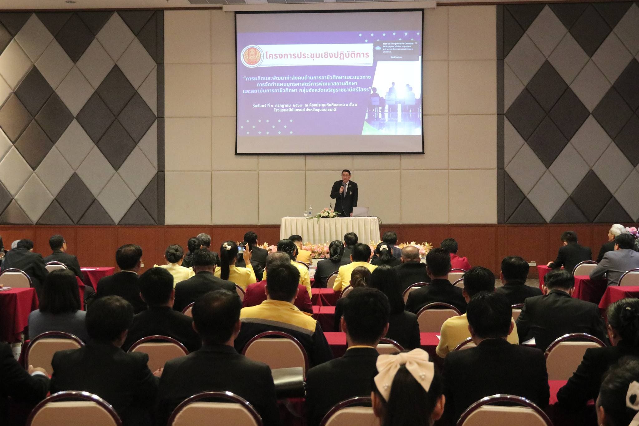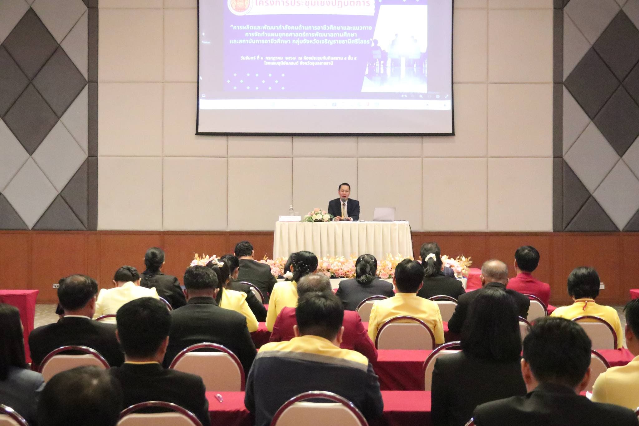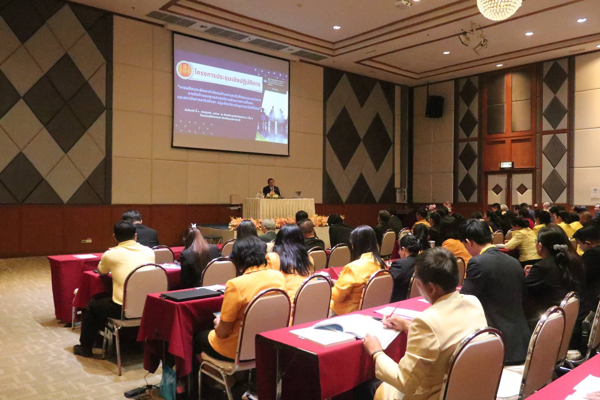 วันที่ ๑ กรกฎาคม ๒๕๖๗ เวลา ๐๘.๐๐ น. นายวิทวัตปัญจมะวัต รองเลขาธิการคณะกรรมการการอาชีวศึกษา ให้เกียรติเป็นประธานในพิธีเปิดการประชุมเชิงปฏิบัติการเรื่อง การผลิตและพัฒนากำลังคนด้านการอาชีวศึกษาและแนวทางการจัดทำแผนยุทธศาสตร์การพัฒนาสถานศึกษาและสถาบันการอาชีวศึกษากลุ่มจังหวัดเจริญราชธานีศรีโสธร สถาบันการอาชีวศึกษาภาคตะวันออกเฉียงเหนือ ๔ และบรรยายพิเศษ เรื่อง“การผลิตและพัฒนากำลังคนด้านการอาชีวศึกษาและแนวทางการจัดทำแผนยุทธศาสตร์การพัฒนาสถานศึกษาและสถาบันการอาชีวศึกษา” พร้อมด้วย นายบัณฑิต ออกแมน ผู้อำนวยการสำนักนโยบายและแผนการอาชีวศึกษา ให้เกียรติบรรยายพิเศษ เรื่อง “แนวทางการผลิตและพัฒนากำลังคนด้านการอาชีวศึกษาตามพระราชบัญญัติการศึกษาแห่งชาติ”ณ โรงแรมสุนีย์ แกรนด์ ในการนี้มี นายประดิษฐ์ พาชื่น ผู้อำนวยการสถาบันการอาชีวศึกษาภาคตะวันออกเฉียงเหนือ ๔ นายลิขิต พลเหลา รองผู้อำนวยการสถาบันการอาชีวศึกษาภาคตะวันออกเฉียงเหนือ ๔ นายวินัย จันทรเกษม รองผู้อำนวยการสถาบันการอาชีวศึกษาภาคตะวันออกเฉียงเหนือ ๔ นายธาตรี พิบูลมณฑา ผู้อำนวยการวิทยาลัยเทคนิคอุบลราชธานี ปฏิบัติหน้าที่ ผู้อำนวยการสำนักงานอาชีวศึกษาจังหวัดอุบลราชธานี พร้อมด้วย คณะผู้บริหารสถานศึกษา ครู และบุคลากรทางการศึกษา สังกัดสถาบันการอาชีวศึกษาภาคตะวันออกเฉียงเหนือ ๔ เข้าร่วมการประชุมอย่างพร้อมเพรียง ทั้งนี้เพื่อร่วมกันวางแผน กำหนดทิศทางในการพัฒนาคุณภาพการศึกษาที่จะนำไปสู่การพัฒนาบุคลากรและผู้เรียนด้านอาชีวศึกษาของสถาบันฯ และสถานศึกษาสู่การขับเคลื่อนยุทธศาสตร์การพัฒนาและเสริมสร้างศักยภาพทรัพยากรมนุษย์ได้อย่างมีคุณภาพต่อไป