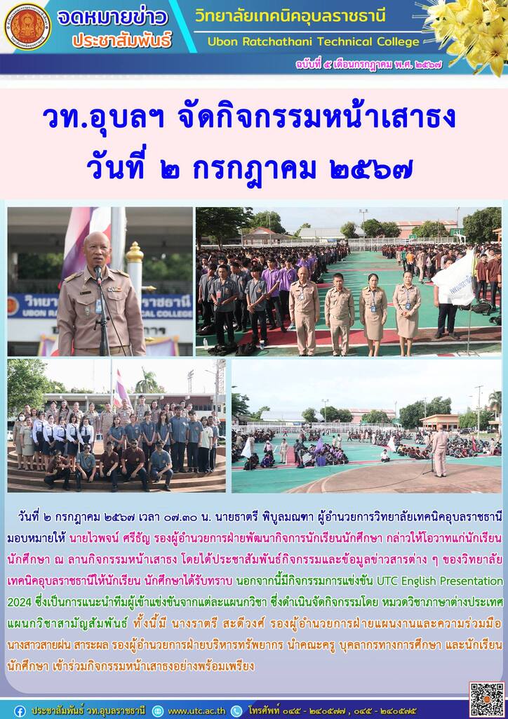 วันที่ ๒ กรกฎาคม ๒๕๖๗ เวลา ๐๗.๓๐ น. นายธาตรี พิบูลมณฑา ผู้อำนวยการวิทยาลัยเทคนิคอุบลราชธานี มอบหมายให้ นายไวพจน์ ศรีธัญ รองผู้อำนวยการฝ่ายพัฒนากิจการนักเรียนนักศึกษา กล่าวให้โอวาทแก่นักเรียน นักศึกษา ณ ลานกิจกรรมหน้าเสาธง โดยได้ประชาสัมพันธ์กิจกรรมและข้อมูลข่าวสารต่าง ๆ ของวิทยาลัยเทคนิคอุบลราชธานีให้นักเรียน นักศึกษาได้รับทราบ นอกจากนี้มีกิจกรรมการแข่งขัน UTC English Presentation 2024 ซึ่งเป็นการแนะนำทีมผู้เข้าแข่งขันจากแต่ละแผนกวิชา ซึ่งดำเนินจัดกิจกรรมโดย หมวดวิชาภาษาต่างประเทศ แผนกวิชาสามัญสัมพันธ์ ทั้งนี้มี นางราตรี สะดีวงศ์ รองผู้อำนวยการฝ่ายแผนงานและความร่วมมือ นางสาวสายฝน สาระผล รองผู้อำนวยการฝ่ายบริหารทรัพยากร นำคณะครู บุคลากรทางการศึกษา และนักเรียน นักศึกษา เข้าร่วมกิจกรรมหน้าเสาธงอย่างพร้อมเพรียง