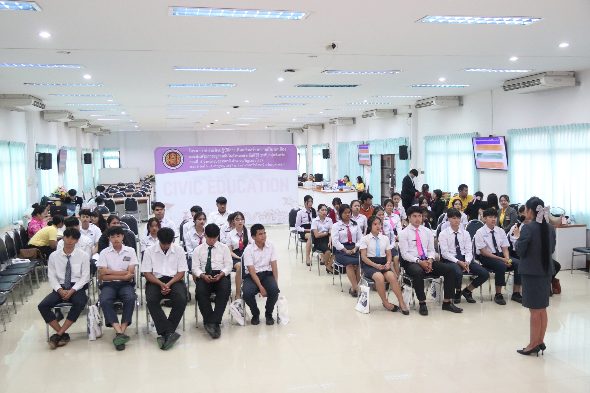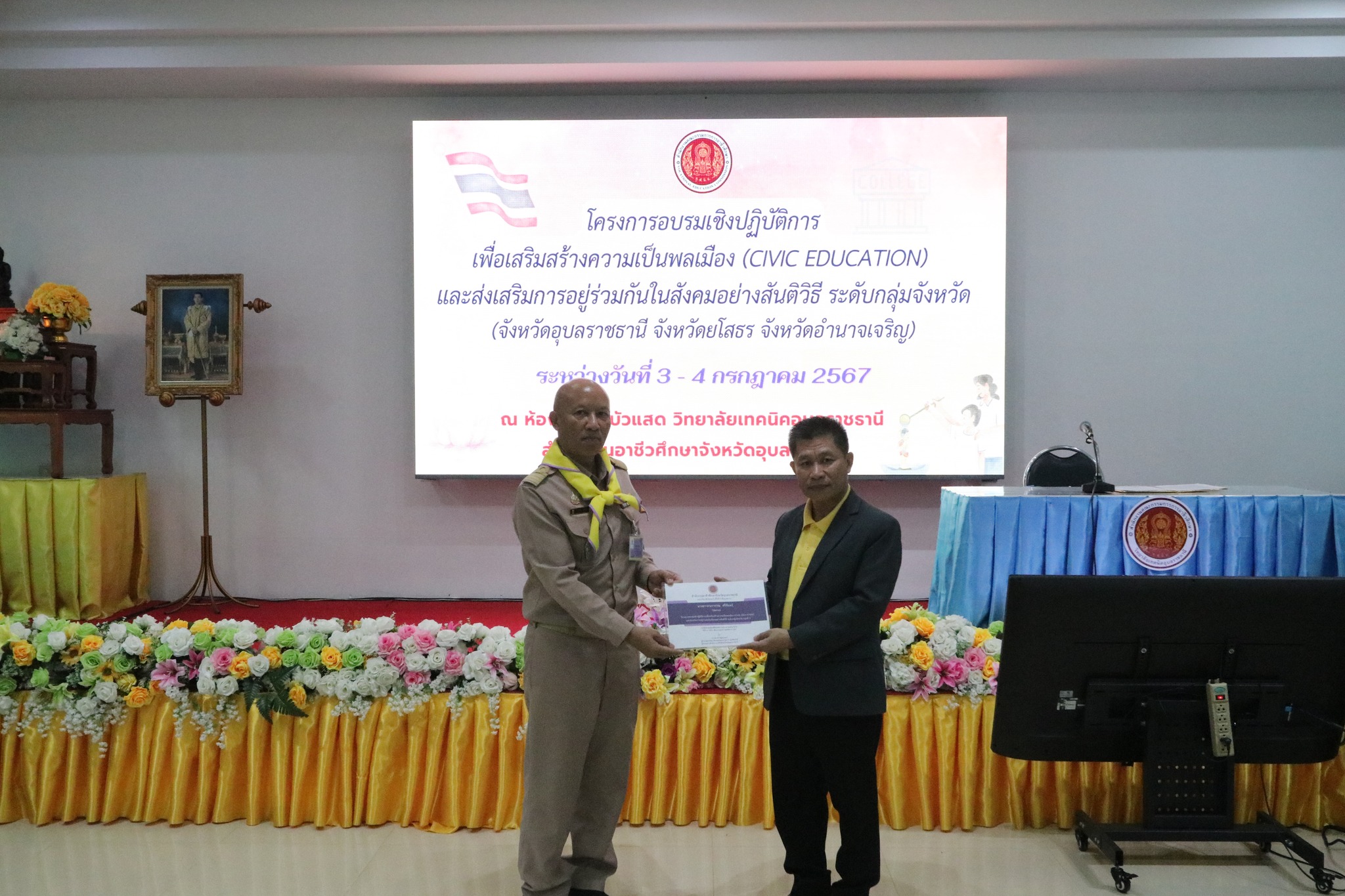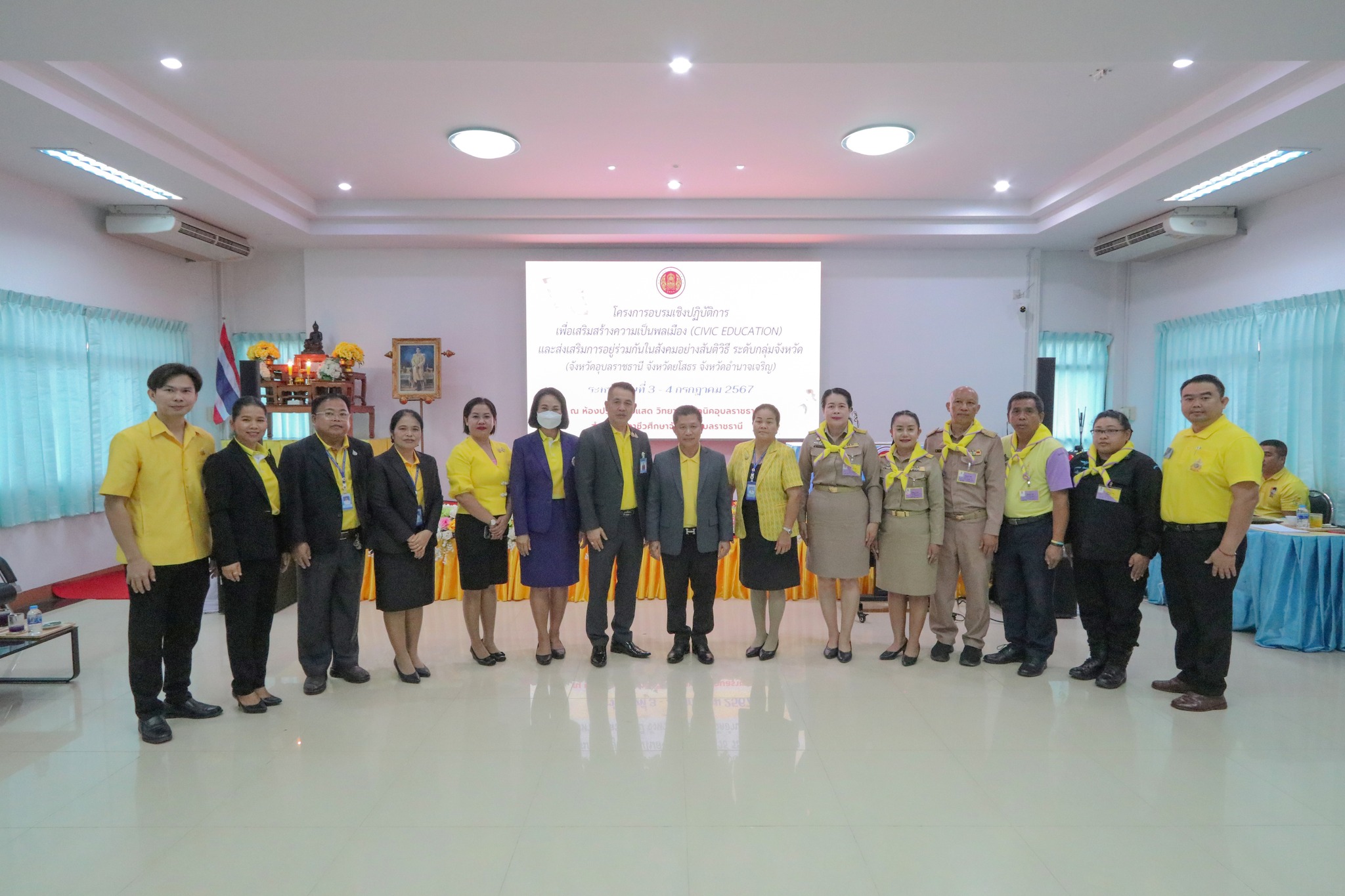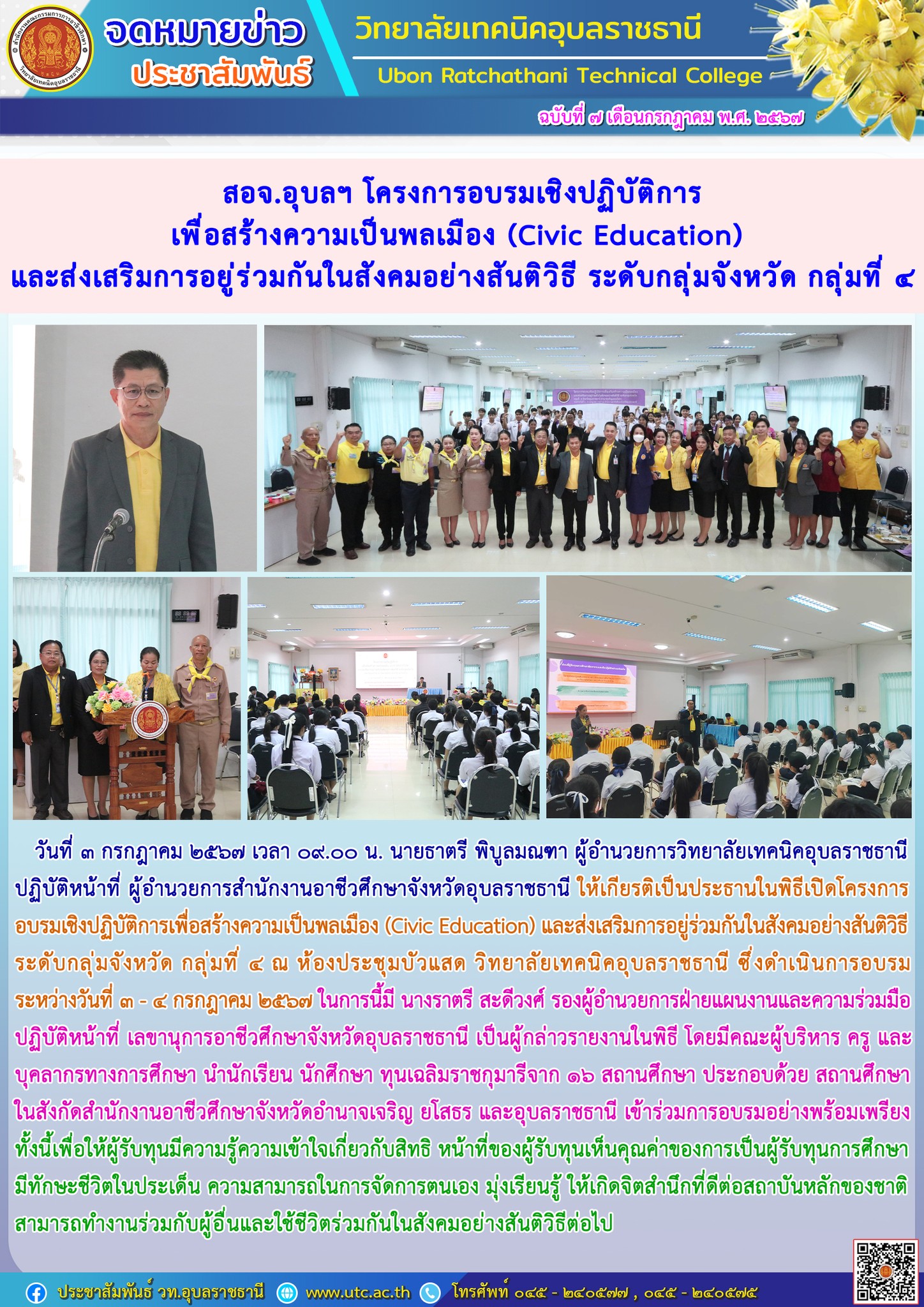 วันที่ ๓ กรกฎาคม ๒๕๖๗ เวลา ๐๙.๐๐ น. นายธาตรี พิบูลมณฑา ผู้อำนวยการวิทยาลัยเทคนิคอุบลราชธานี ปฏิบัติหน้าที่ ผู้อำนวยการสำนักงานอาชีวศึกษาจังหวัดอุบลราชธานี ให้เกียรติเป็นประธานในพิธีเปิดโครงการอบรมเชิงปฏิบัติการเพื่อสร้างความเป็นพลเมือง (Civic Education) และส่งเสริมการอยู่ร่วมกันในสังคมอย่างสันติวิธี ระดับกลุ่มจังหวัด กลุ่มที่ ๔ ณ ห้องประชุมบัวแสด วิทยาลัยเทคนิคอุบลราชธานี ซึ่งดำเนินการอบรมระหว่างวันที่ ๓ – ๔ กรกฎาคม ๒๕๖๗ ในการนี้มี นางราตรี สะดีวงศ์ รองผู้อำนวยการฝ่ายแผนงานและความร่วมมือปฏิบัติหน้าที่ เลขานุการอาชีวศึกษาจังหวัดอุบลราชธานี เป็นผู้กล่าวรายงานในพิธี โดยมีคณะผู้บริหาร ครู และบุคลากรทางการศึกษา นำนักเรียน นักศึกษา ทุนเฉลิมราชกุมารีจาก ๑๖ สถานศึกษา ประกอบด้วย สถานศึกษาในสังกัดสำนักงานอาชีวศึกษาจังหวัดอำนาจเจริญ ยโสธร และอุบลราชธานี เข้าร่วมการอบรมอย่างพร้อมเพรียง ทั้งนี้เพื่อให้ผู้รับทุนมีความรู้ความเข้าใจเกี่ยวกับสิทธิ หน้าที่ของผู้รับทุนเห็นคุณค่าของการเป็นผู้รับทุนการศึกษา มีทักษะชีวิตในประเด็น ความสามารถในการจัดการตนเอง มุ่งเรียนรู้ ให้เกิดจิตสำนึกที่ดีต่อสถาบันหลักของชาติ สามารถทำงานร่วมกับผู้อื่นและใช้ชีวิตร่วมกันในสังคมอย่างสันติวิธีต่อไป
