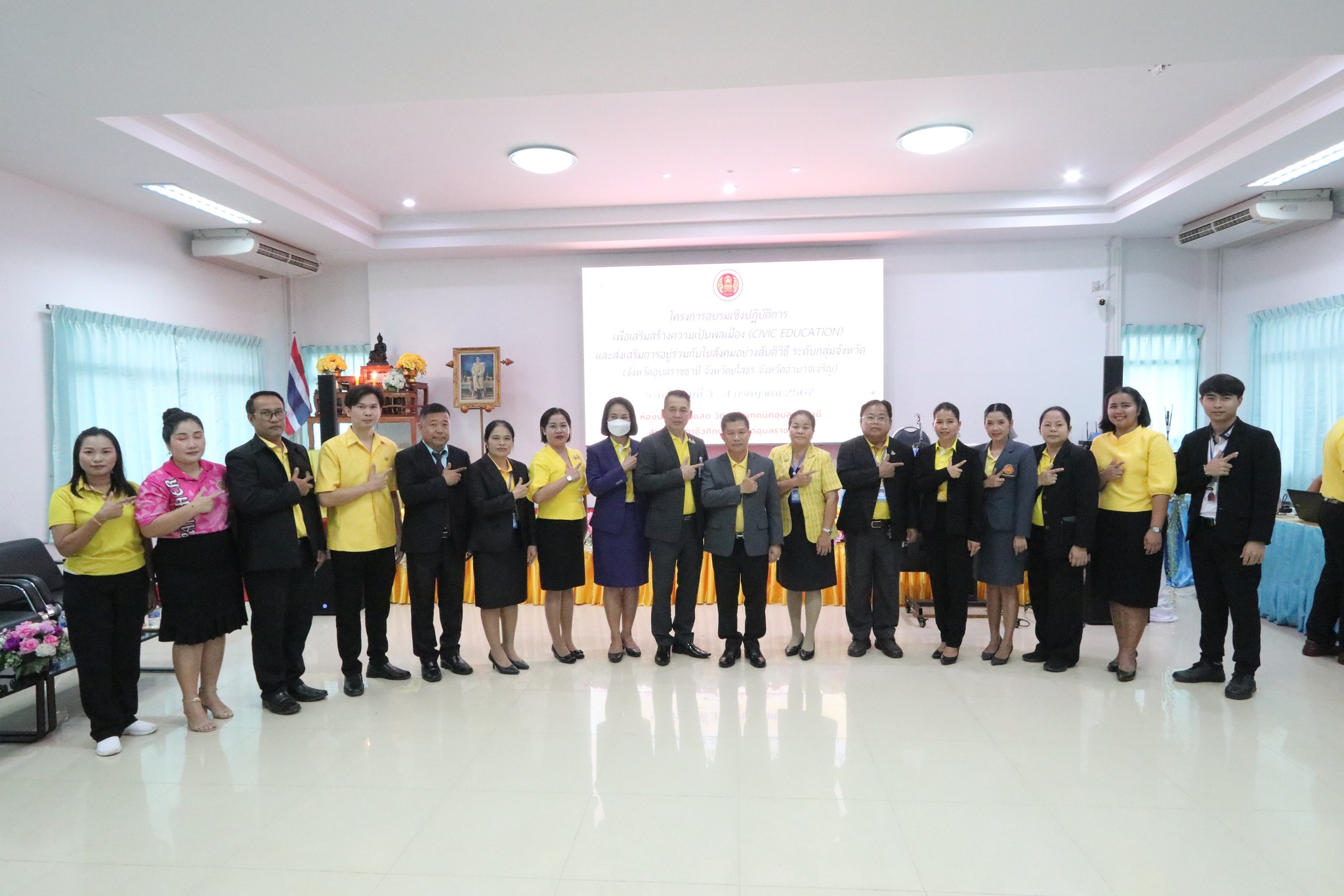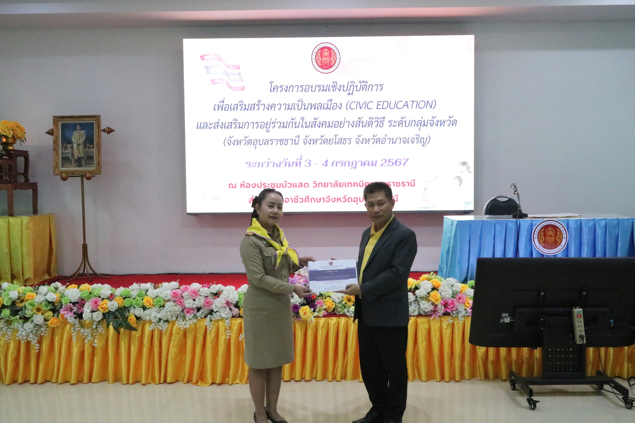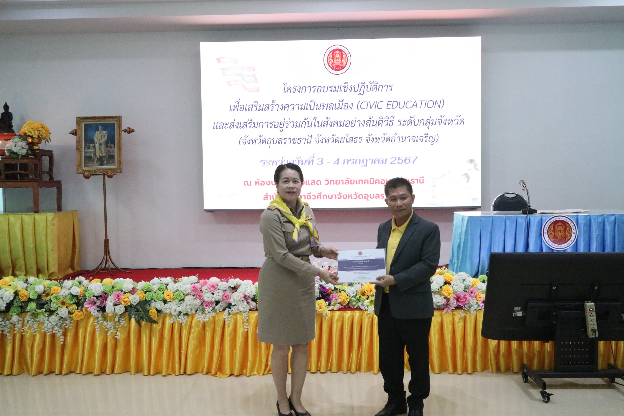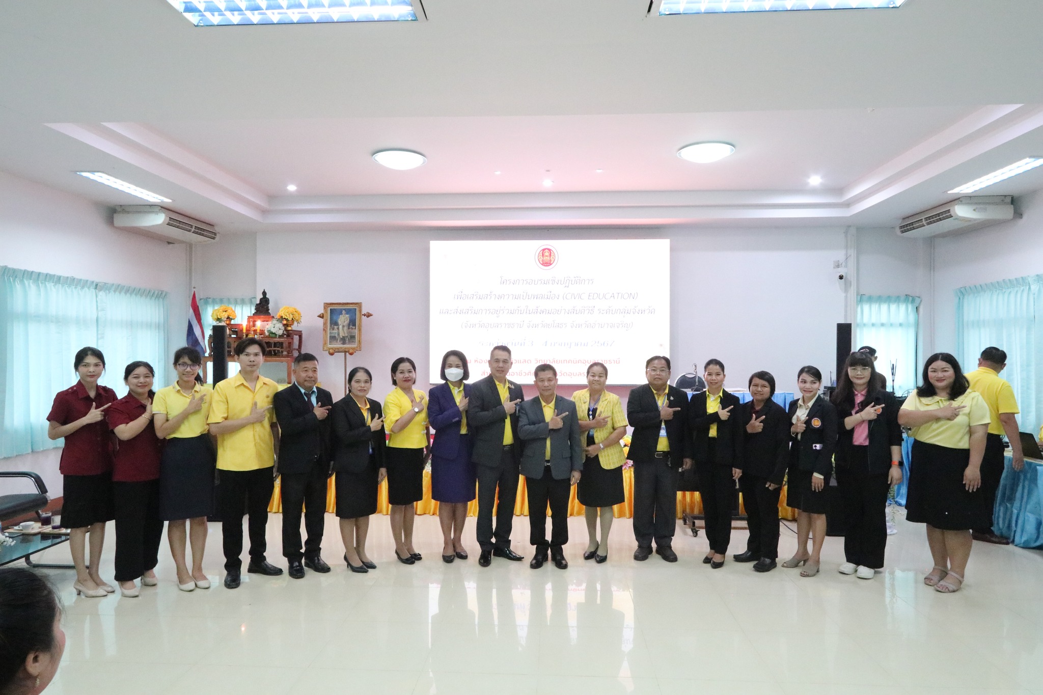 วันที่ ๓ กรกฎาคม ๒๕๖๗ เวลา ๐๙.๐๐ น. นายธาตรี พิบูลมณฑา ผู้อำนวยการวิทยาลัยเทคนิคอุบลราชธานี ปฏิบัติหน้าที่ ผู้อำนวยการสำนักงานอาชีวศึกษาจังหวัดอุบลราชธานี ให้เกียรติเป็นประธานในพิธีเปิดโครงการอบรมเชิงปฏิบัติการเพื่อสร้างความเป็นพลเมือง (Civic Education) และส่งเสริมการอยู่ร่วมกันในสังคมอย่างสันติวิธี ระดับกลุ่มจังหวัด กลุ่มที่ ๔ ณ ห้องประชุมบัวแสด วิทยาลัยเทคนิคอุบลราชธานี ซึ่งดำเนินการอบรมระหว่างวันที่ ๓ – ๔ กรกฎาคม ๒๕๖๗ ในการนี้มี นางราตรี สะดีวงศ์ รองผู้อำนวยการฝ่ายแผนงานและความร่วมมือปฏิบัติหน้าที่ เลขานุการอาชีวศึกษาจังหวัดอุบลราชธานี เป็นผู้กล่าวรายงานในพิธี โดยมีคณะผู้บริหาร ครู และบุคลากรทางการศึกษา นำนักเรียน นักศึกษา ทุนเฉลิมราชกุมารีจาก ๑๖ สถานศึกษา ประกอบด้วย สถานศึกษาในสังกัดสำนักงานอาชีวศึกษาจังหวัดอำนาจเจริญ ยโสธร และอุบลราชธานี เข้าร่วมการอบรมอย่างพร้อมเพรียง ทั้งนี้เพื่อให้ผู้รับทุนมีความรู้ความเข้าใจเกี่ยวกับสิทธิ หน้าที่ของผู้รับทุนเห็นคุณค่าของการเป็นผู้รับทุนการศึกษา มีทักษะชีวิตในประเด็น ความสามารถในการจัดการตนเอง มุ่งเรียนรู้ ให้เกิดจิตสำนึกที่ดีต่อสถาบันหลักของชาติ สามารถทำงานร่วมกับผู้อื่นและใช้ชีวิตร่วมกันในสังคมอย่างสันติวิธีต่อไป