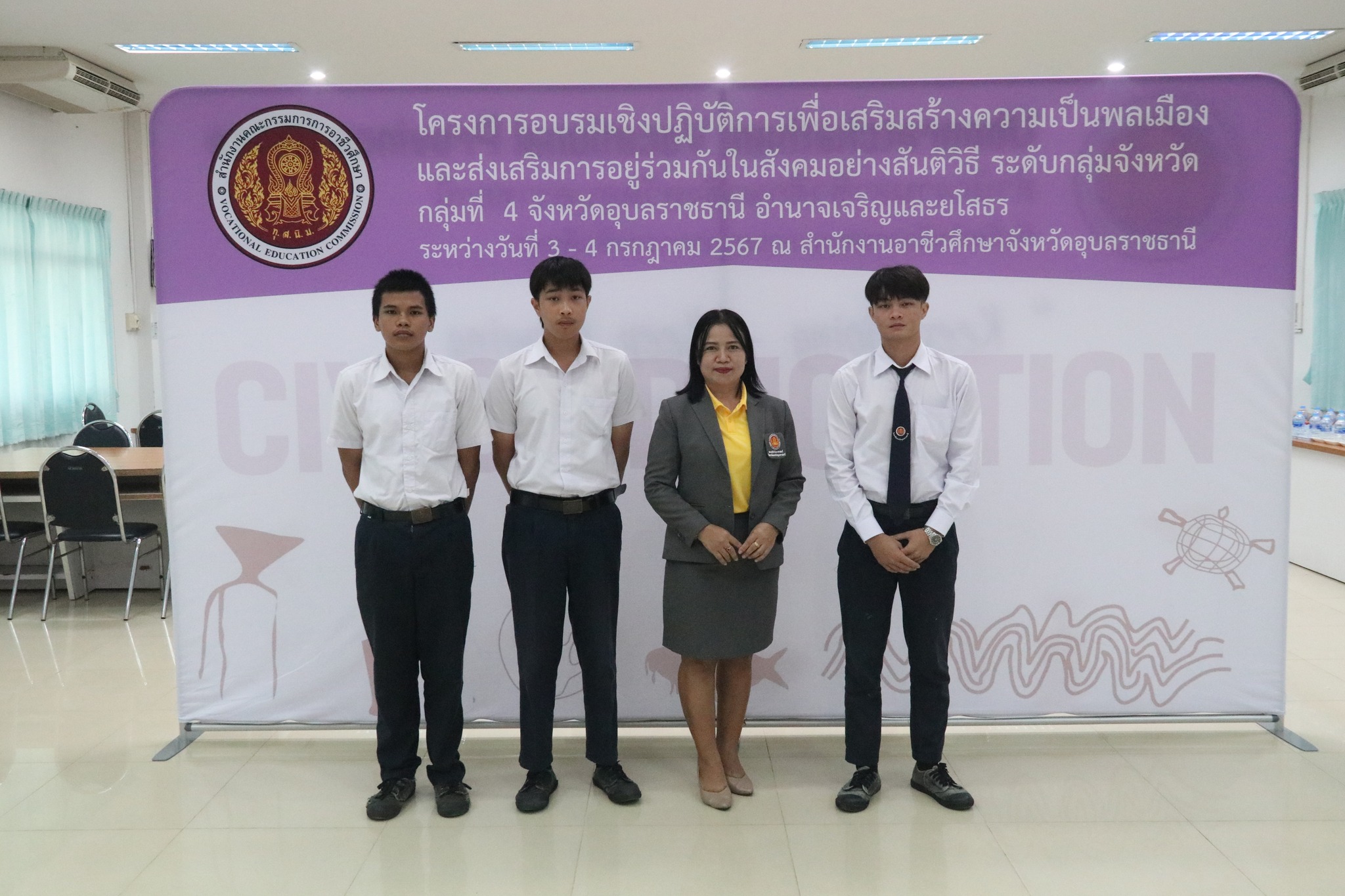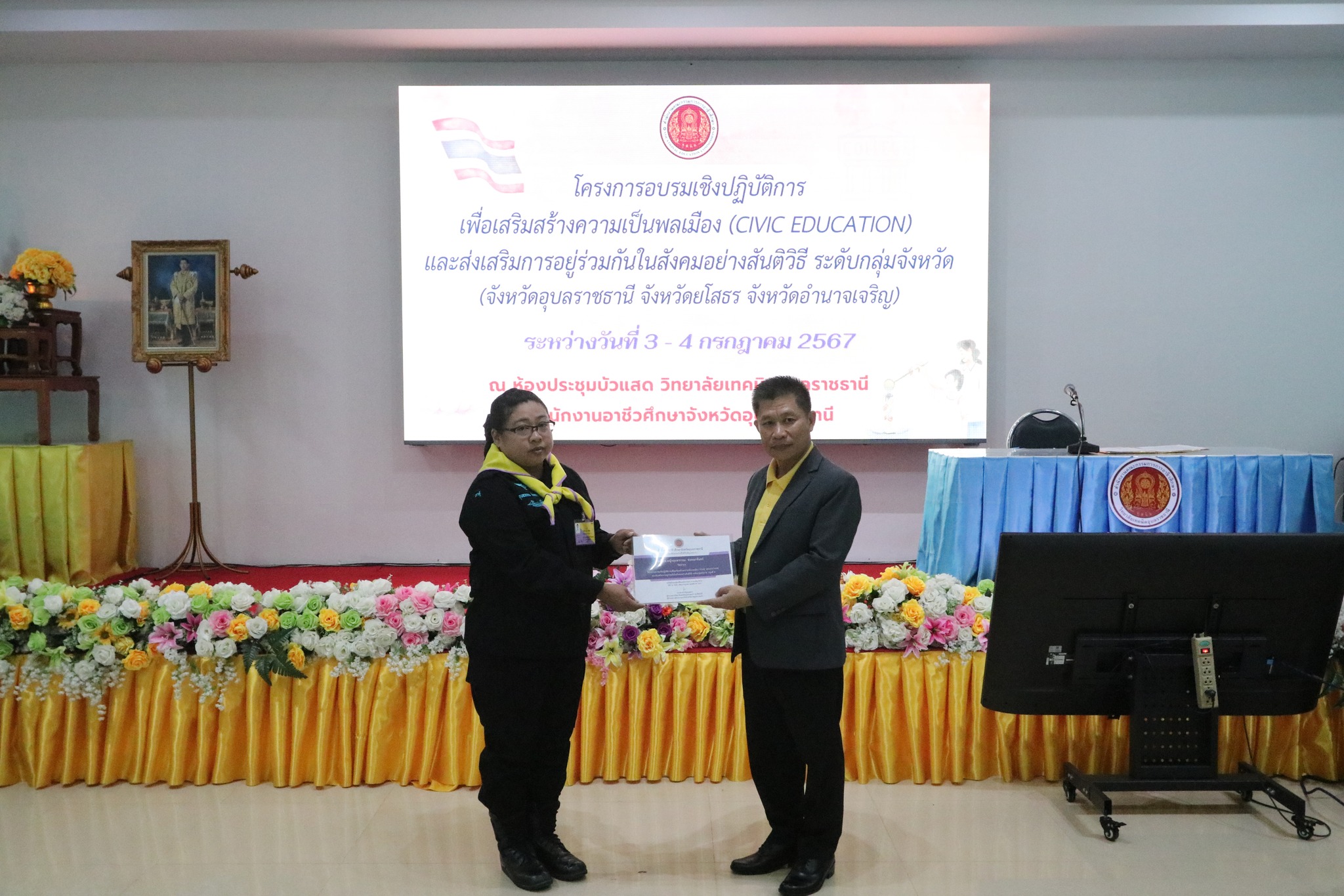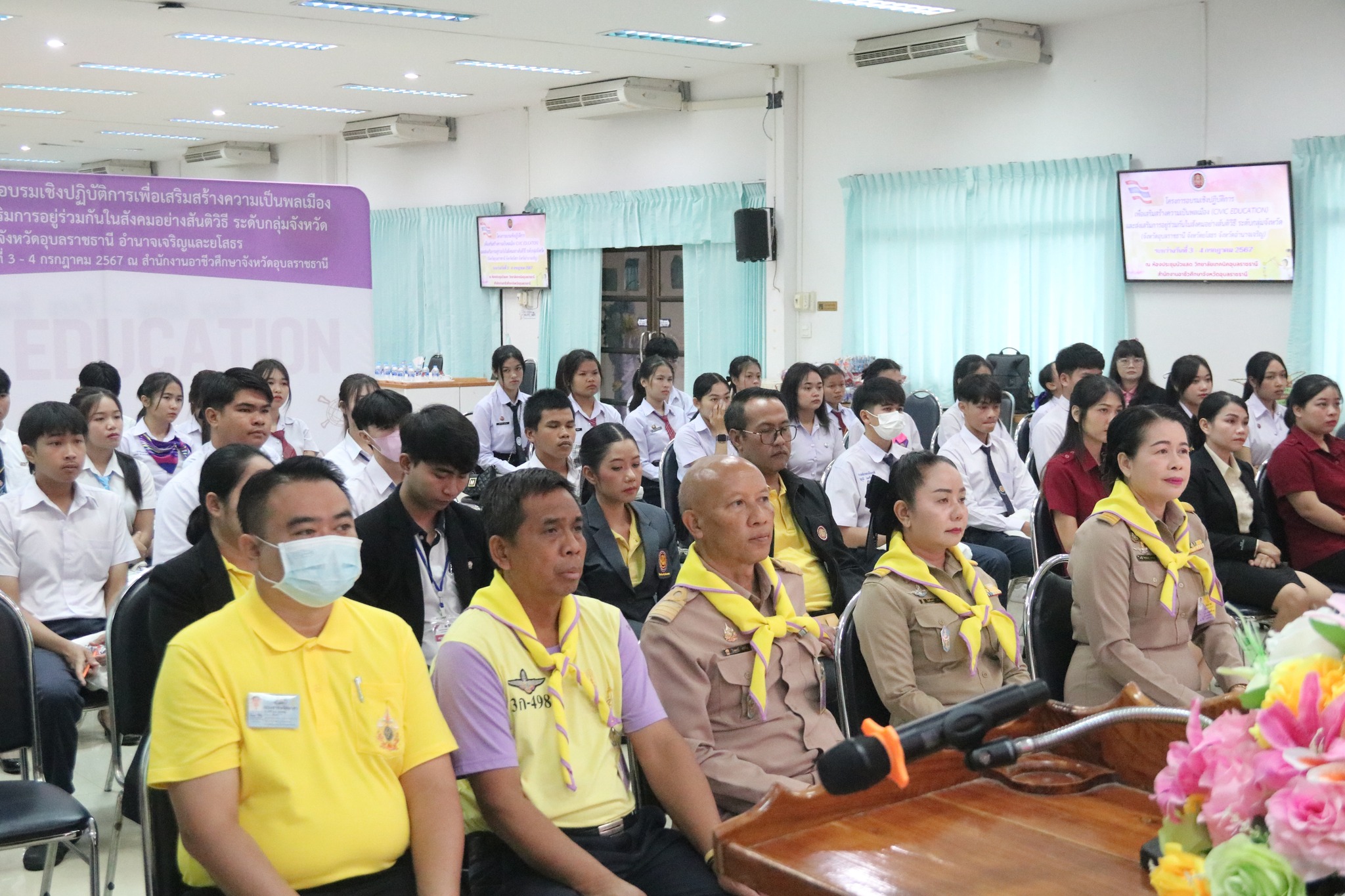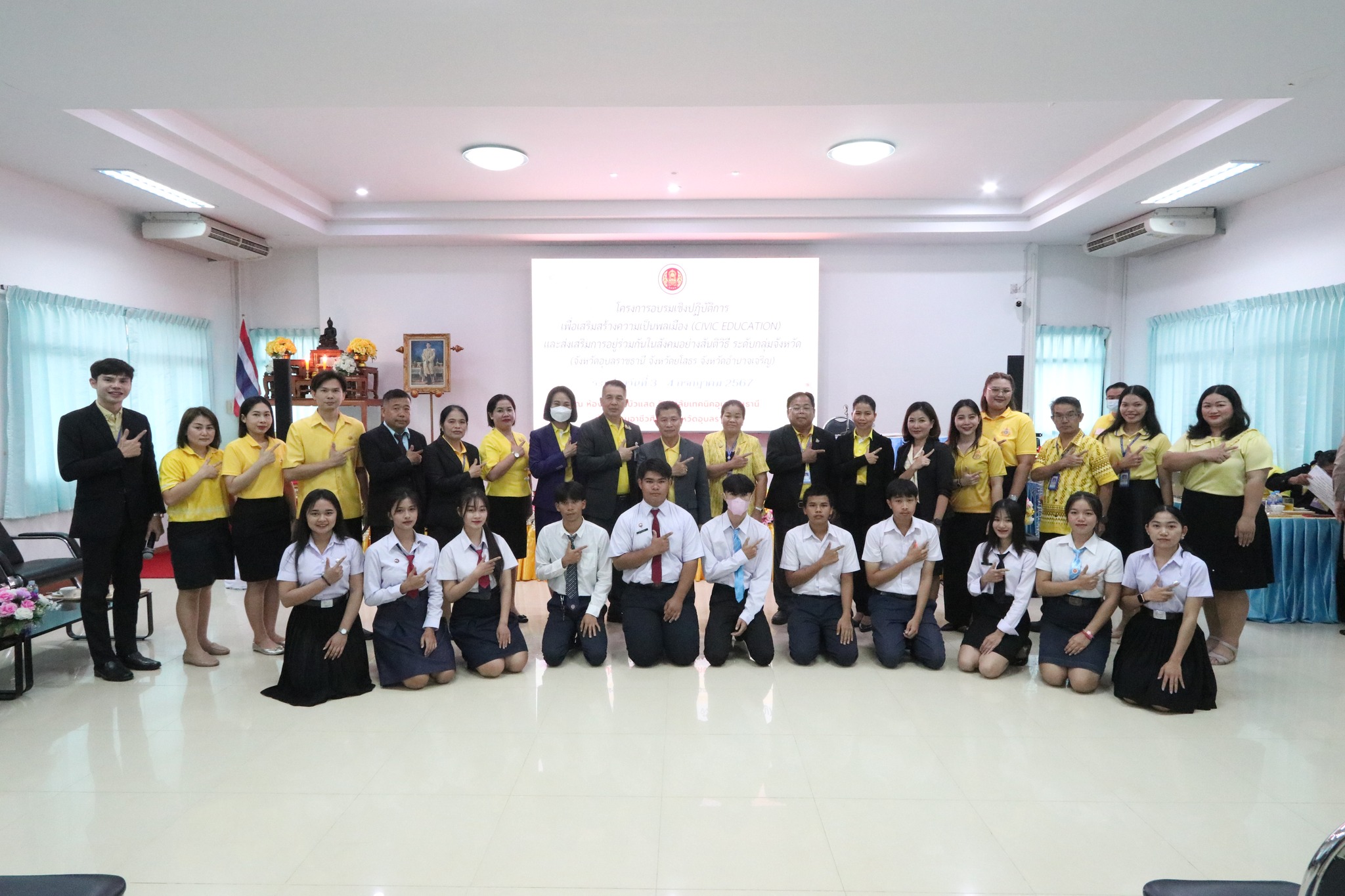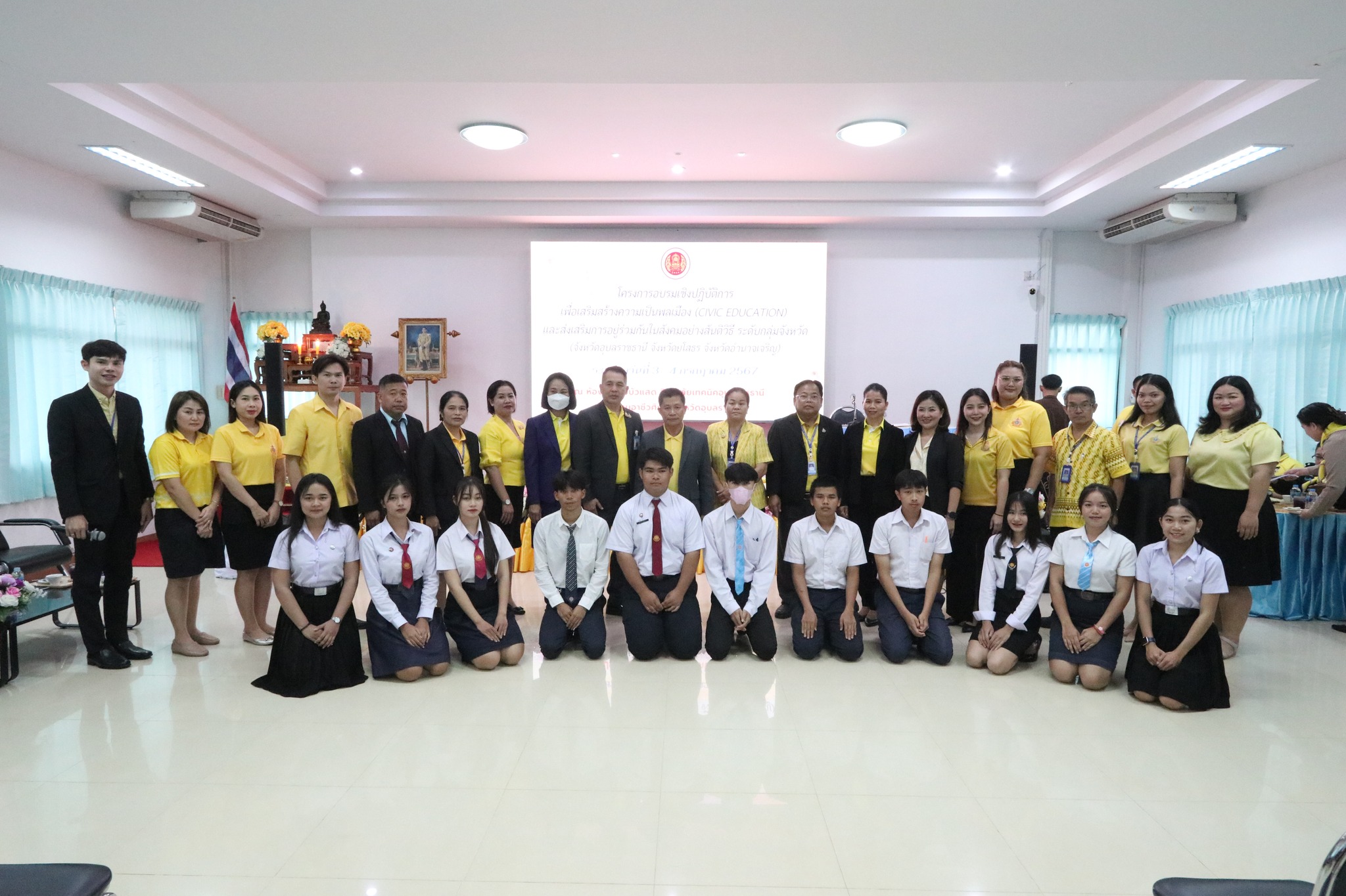 วันที่ ๓ กรกฎาคม ๒๕๖๗ เวลา ๐๙.๐๐ น. นายธาตรี พิบูลมณฑา ผู้อำนวยการวิทยาลัยเทคนิคอุบลราชธานี ปฏิบัติหน้าที่ ผู้อำนวยการสำนักงานอาชีวศึกษาจังหวัดอุบลราชธานี ให้เกียรติเป็นประธานในพิธีเปิดโครงการอบรมเชิงปฏิบัติการเพื่อสร้างความเป็นพลเมือง (Civic Education) และส่งเสริมการอยู่ร่วมกันในสังคมอย่างสันติวิธี ระดับกลุ่มจังหวัด กลุ่มที่ ๔ ณ ห้องประชุมบัวแสด วิทยาลัยเทคนิคอุบลราชธานี ซึ่งดำเนินการอบรมระหว่างวันที่ ๓ – ๔ กรกฎาคม ๒๕๖๗ ในการนี้มี นางราตรี สะดีวงศ์ รองผู้อำนวยการฝ่ายแผนงานและความร่วมมือปฏิบัติหน้าที่ เลขานุการอาชีวศึกษาจังหวัดอุบลราชธานี เป็นผู้กล่าวรายงานในพิธี โดยมีคณะผู้บริหาร ครู และบุคลากรทางการศึกษา นำนักเรียน นักศึกษา ทุนเฉลิมราชกุมารีจาก ๑๖ สถานศึกษา ประกอบด้วย สถานศึกษาในสังกัดสำนักงานอาชีวศึกษาจังหวัดอำนาจเจริญ ยโสธร และอุบลราชธานี เข้าร่วมการอบรมอย่างพร้อมเพรียง ทั้งนี้เพื่อให้ผู้รับทุนมีความรู้ความเข้าใจเกี่ยวกับสิทธิ หน้าที่ของผู้รับทุนเห็นคุณค่าของการเป็นผู้รับทุนการศึกษา มีทักษะชีวิตในประเด็น ความสามารถในการจัดการตนเอง มุ่งเรียนรู้ ให้เกิดจิตสำนึกที่ดีต่อสถาบันหลักของชาติ สามารถทำงานร่วมกับผู้อื่นและใช้ชีวิตร่วมกันในสังคมอย่างสันติวิธีต่อไป