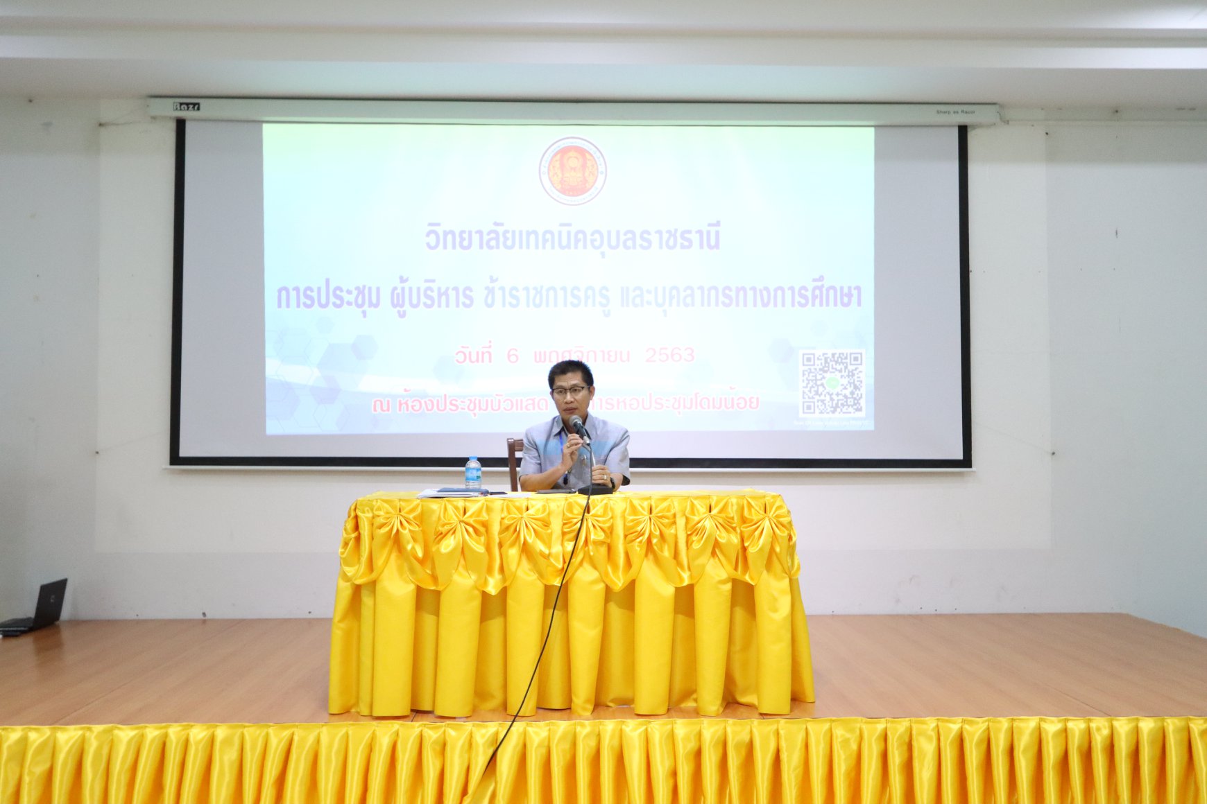เมื่อวันที่ ๖ พฤศจิกายน ๒๕๖๓ เวลา ๐๙.๓๐ น. ที่ผ่านมา นายธาตรี พิบูลมณฑา ผู้อำนวยการวิทยาลัยเทคนิคอุบลราชธานี ให้เกียรติเป็นประธานในการประชุมข้อราชการ เกี่ยวกับแนวทางการพัฒนาระบบการศึกษาภายในวิทยาลัยเทคนิคอุบลราชธานี และข้อพึงปฏิบัติของข้าราชการครู และบุคลากรทางการศึกษา ตลอดจนแสดงวิสัยทัศน์การบริหารสถานศึกษาตลอดระยะเวลาในการดำรงตำแหน่งผู้อำนวยการที่ผ่านมา การประชุมในครั้งนี้ได้รับความร่วมมือเป็นอย่างดีจากรองผู้อำนวยการ ข้าราชการ และบุคลากรทางการศึกษาทุกท่าน เข้าร่วมรับฟังการประชุมเพื่อนำไปปฏิบัติตนในการเพิ่มพูนระบบการศึกษาให้นักเรียน นักศึกษา วิทยาลัยเทคนิคอุบลราชธานีต่อไปในอนาคต โดยการจัดประชุมดังกล่าวจัดขึ้น ณ ห้องประชุมบัวแสด อาคารหอประชุมโดมน้อย วิทยาลัยเทคนิคอุบลราชธานี