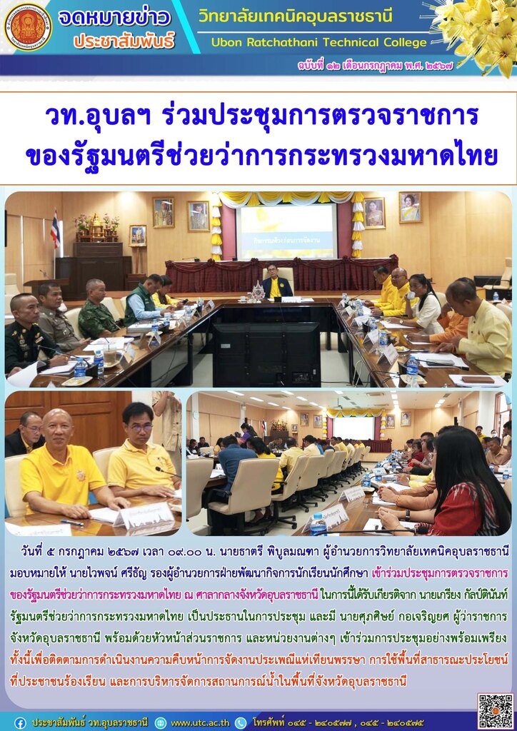 วันที่ ๕ กรกฎาคม ๒๕๖๗ เวลา ๐๙.๐๐ น. นายธาตรี พิบูลมณฑา ผู้อำนวยการวิทยาลัยเทคนิคอุบลราชธานี มอบหมายให้ นายไวพจน์ ศรีธัญ รองผู้อำนวยการฝ่ายพัฒนากิจการนักเรียนนักศึกษา เข้าร่วมการประชุมการตรวจราชการของรัฐมนตรีช่วยว่าการกระทรวงมหาดไทย ณ ศาลากลางจังหวัดอุบลราชธานี ในการนี้ได้รับเกียรติจาก นายเกรียง กัลป์ตินันท์ รัฐมนตรีช่วยว่าการกระทรวงมหาดไทย เป็นประธานในการประชุม และมี นายศุภศิษย์ กอเจริญยศ ผู้ว่าราชการจังหวัดอุบลราชธานี พร้อมด้วยหัวหน้าส่วนราชการ และหน่วยงานต่างๆ เข้าร่วมการประชุมอย่างพร้อมเพรียง ทั้งนี้เพื่อติดตามการดำเนินงานความคืบหน้าการจัดงานประเพณีแห่เทียนพรรษา การใช้พื้นที่สาธารณะประโยชน์ที่ประชาชนร้องเรียน และการบริหารจัดการสถานการณ์น้ำในพื้นที่จังหวัดอุบลราชธานี