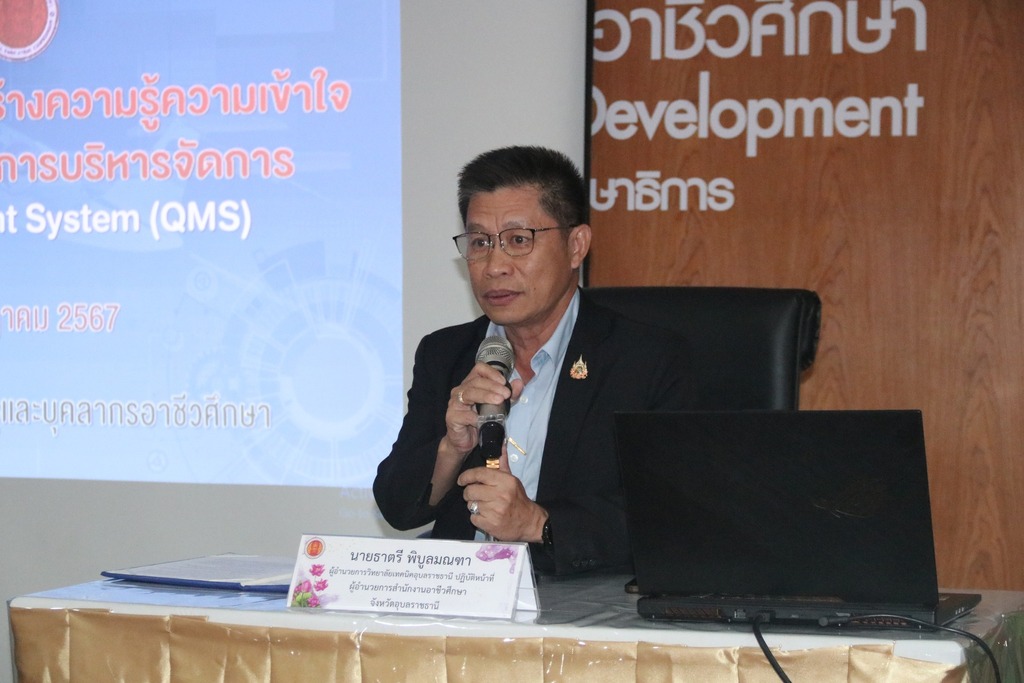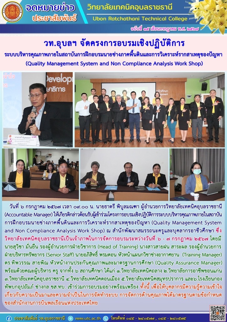 วันที่ ๖ กรกฎาคม ๒๕๖๗ เวลา ๐๙.๐๐ น. นายธาตรี พิบูลมณฑา ผู้อำนวยการวิทยาลัยเทคนิคอุบลราชธานี (Accountable Manager) ให้เกียรติกล่าวต้อนรับผู้เข้าร่วมโครงการอบรมเชิงปฏิบัติการระบบบริหารคุณภาพภายในสถาบันการฝึกอบรมนายช่างภาคพื้นดินและการวิเคราะห์รากสาเหตุของปัญหา (Quality Management System and Non Compliance Analysis Work Shop) ณ สำนักพัฒนาสมรรถนะครูและบุคลากรอาชีวศึกษา ซึ่งวิทยาลัยเทคนิคอุบลราชธานีเป็นเจ้าภาพในการจัดการอบรมระหว่างวันที่ ๖ – ๗ กรกฎาคม ๒๕๖๗ โดยมีนายสุวิชา มั่นยืน รองผู้อำนวยการฝ่ายวิชาการ (Head of Training) นางสาวสายฝน สาระผล รองผู้อำนวยการฝ่ายบริหารทรัพยากร (Senior Staff) นายอภิสิทธิ์ พรมดอน หัวหน้าแผนกวิชาช่างอากาศยาน (Training Manager) ดร.ทิพวรรณ สายพิณ หัวหน้างานประกันคุณภาพและมาตรฐานการศึกษา (Quality Assurance Manager) พร้อมด้วยคณะผู้บริหาร ครู จากทั้ง ๖ สถานศึกษา ได้แก่ ๑.วิทยาลัยเทคนิคถลาง ๒.วิทยาลัยการอาชีพขอนแก่น ๓.วิทยาลัยเทคนิคอุบลราชธานี ๔.วิทยาลัยเทคนิคดอนเมือง ๕.วิทยาลัยเทคนิคสมุทรปราการ และ๖.โรงเรียนกองทัพบกอุปถัมภ์ ช่างกล ขส.ทบ. เข้าร่วมการอบรมอย่างพร้อมเพรียง ทั้งนี้ เพื่อให้บุคลากรมีความรู้ความเข้าใจเกี่ยวกับความเป็นมาและความจำเป็นในการจัดทำระบบ การจัดการด้านคุณภาพได้มาตรฐานตามข้อกำหนดของสำนักงานการบินพลเรือนแห่งประเทศไทย
