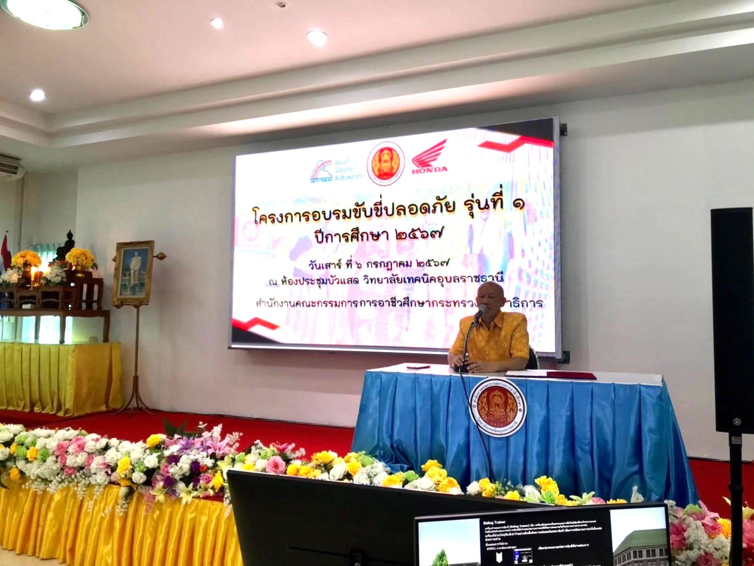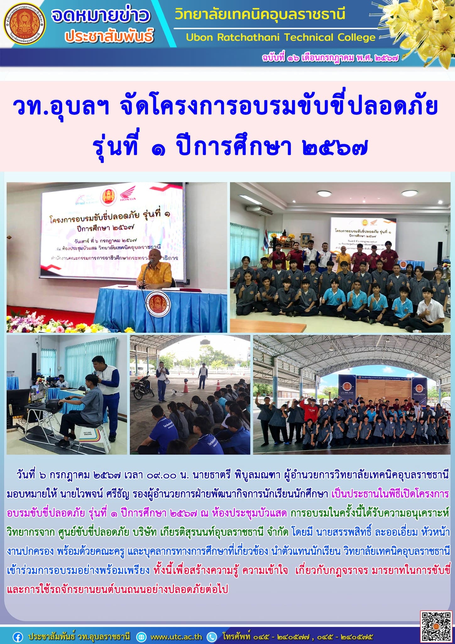 วันที่ ๖ กรกฎาคม ๒๕๖๗ เวลา ๐๙.๐๐ น. นายธาตรี พิบูลมณฑา ผู้อำนวยการวิทยาลัยเทคนิคอุบลราชธานี มอบหมายให้ นายไวพจน์ ศรีธัญ รองผู้อำนวยการฝ่ายพัฒนากิจการนักเรียนนักศึกษา เป็นประธาน ในพิธีเปิดโครงการอบรมขับขี่ปลอดภัยรุ่นที่ ๑ ประจำปีการศึกษา ๒๕๖๗ ณ ห้องประชุมบัวแสด การอบรมในครั้งนี้ได้รับความอนุเคราะห์วิทยากรจาก ศูนย์ขับขี่ปลอดภัย บริษัท เกียรติสุรนนท์อุบลราชธานี จำกัด โดยมี นายสรรพสิทธิ์ ละออเอี่ยม หัวหน้างานปกครอง พร้อมด้วยคณะครู และบุคลากรทางการศึกษาที่เกี่ยวข้อง นำตัวแทนนักเรียน นักศึกษา วิทยาลัยเทคนิคอุบลราชธานี เข้าร่วมการอบรมอย่างพร้อมเพรียง ทั้งนี้เพื่อสร้างความรู้ ความเข้าใจ เกี่ยวกับกฎจราจรและมารยาทในการขับขี่ การใช้รถจักรยานยนต์บนถนนอย่างปลอดภัยต่อไป