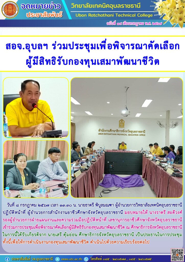 วันที่ ๘ กรกฎาคม ๒๕๖๗ เวลา ๑๓.๓๐ น. นายธาตรี พิบูลมณฑา ผู้อำนวยการวิทยาลัยเทคนิคอุบลราชธานี ปฏิบัติหน้าที่ ผู้อำนวยการสำนักงานอาชีวศึกษาจังหวัดอุบลราชธานี มอบหมายให้ นางราตรี สะดีวงศ์ รองผู้อำนวยการฝ่ายแผนงานและความร่วมมือ ปฏิบัติหน้าที่ เลขานุการอาชีวศึกษาจังหวัดอุบลราชธานี เข้าร่วมการประชุมเพื่อพิจารณาคัดเลือกผู้มีสิทธิรับกองทุนเสมาพัฒนาชีวิต ณ ศึกษาธิการจังหวัดอุบลราชธานี ในการนี้ได้รับเกียรติจาก นายเสรี ตุ้มอ่อน ศึกษาธิการจังหวัดอุบลราชธานี เป็นประธานในการประชุม ทั้งนี้เพื่อให้การดำเนินงานกองทุนเสมาพัฒนาชีวิต ดำเนินไปด้วยความเรียบร้อยต่อไป