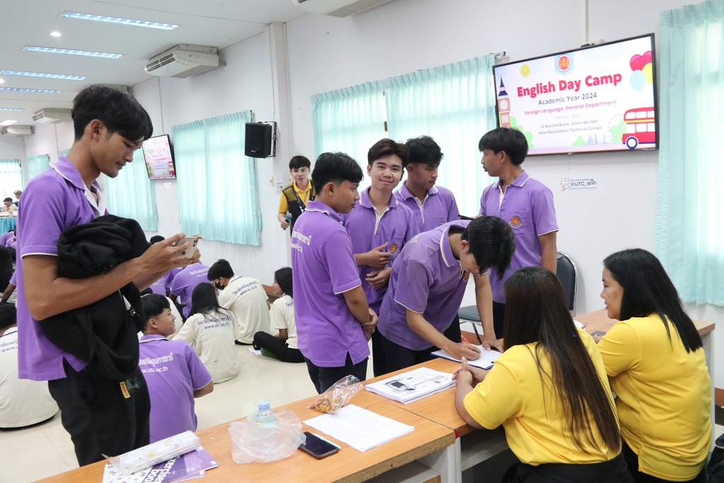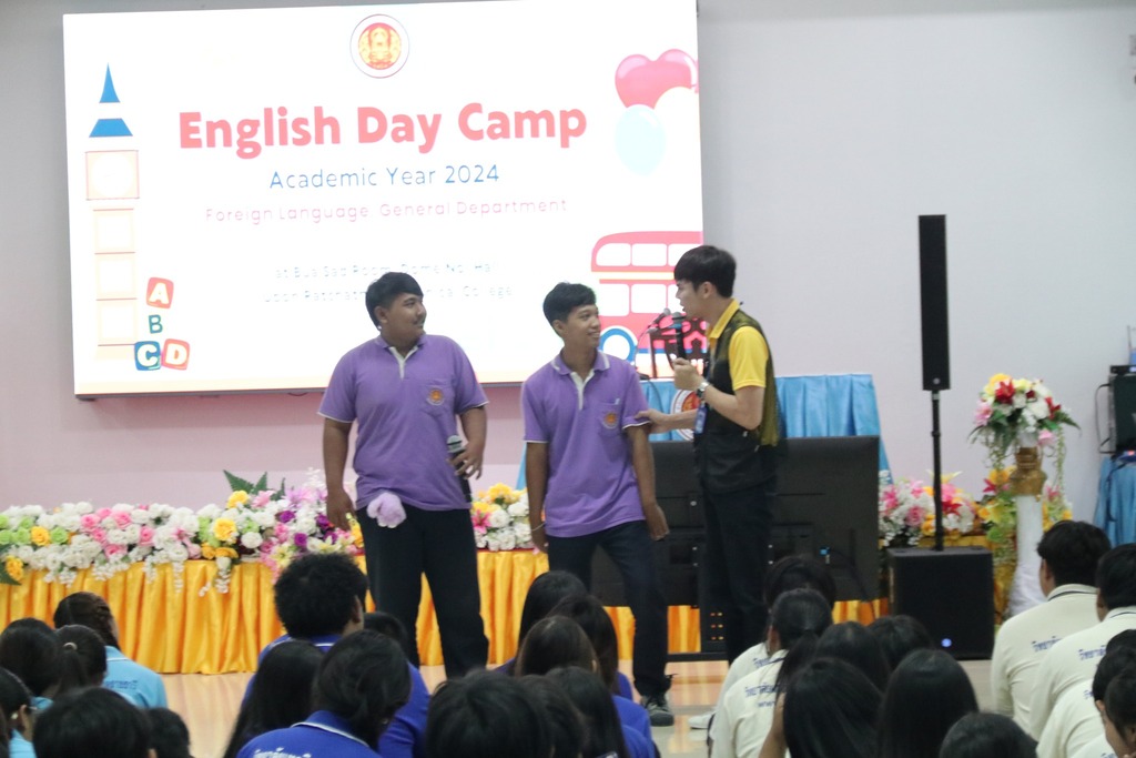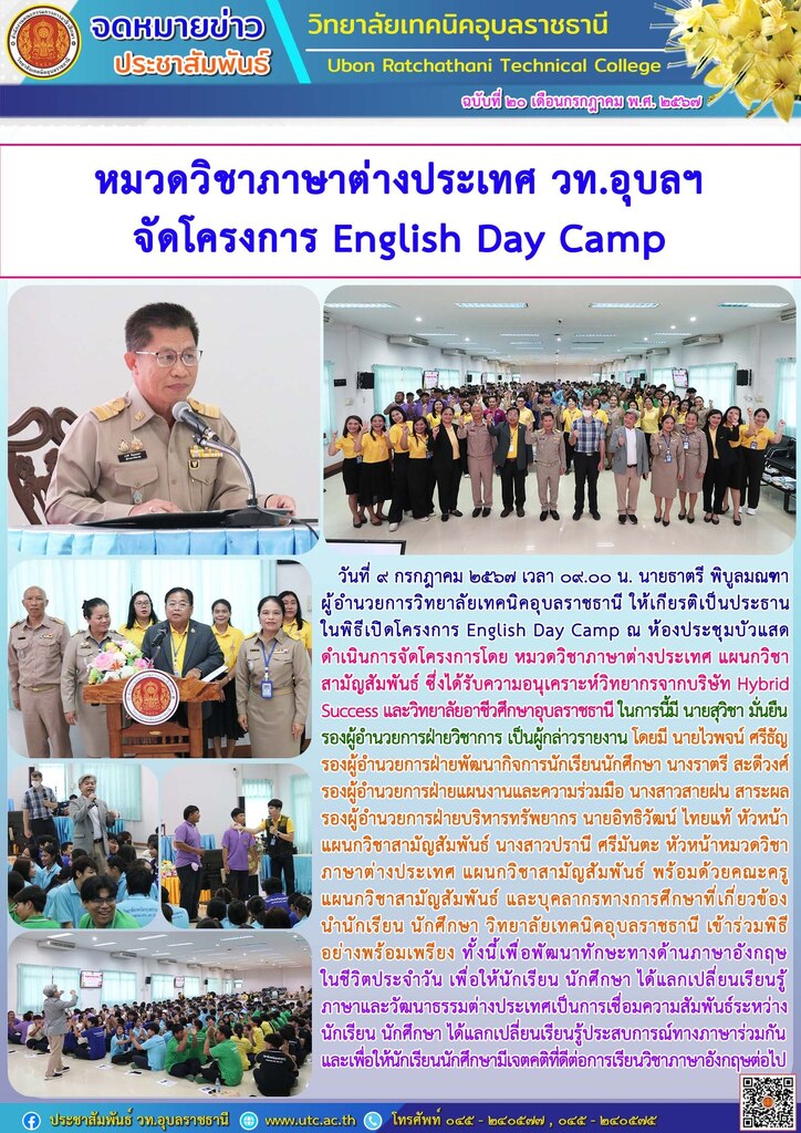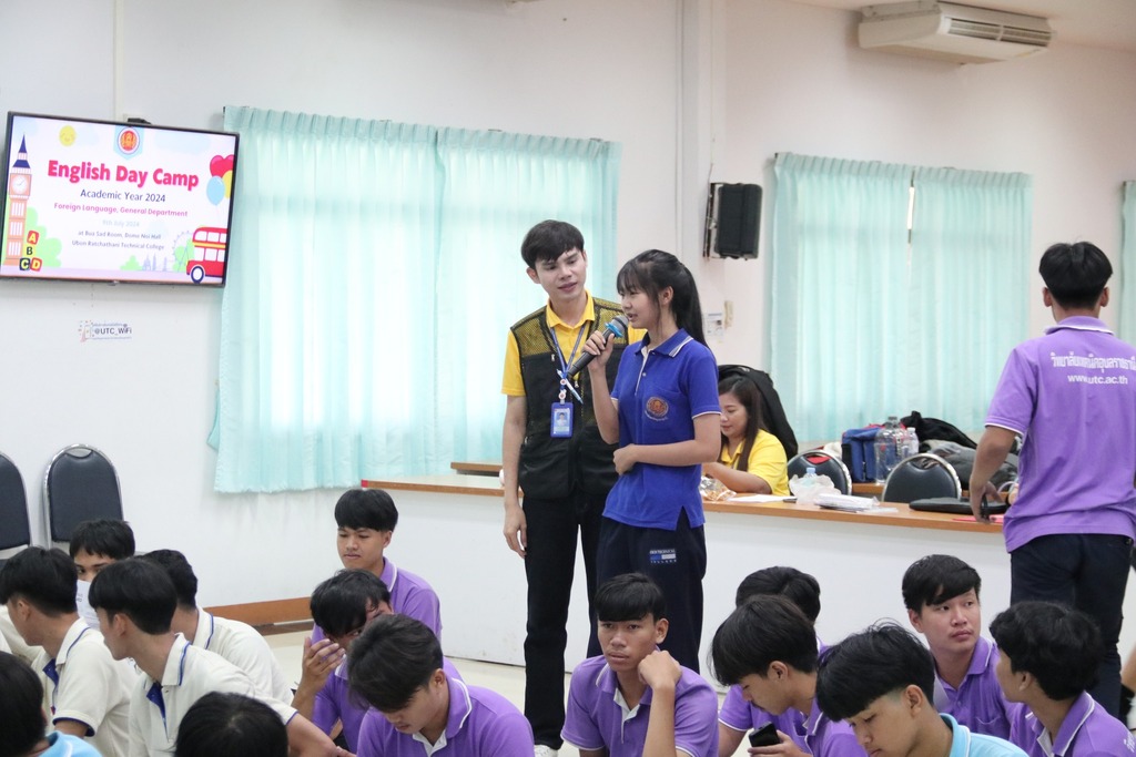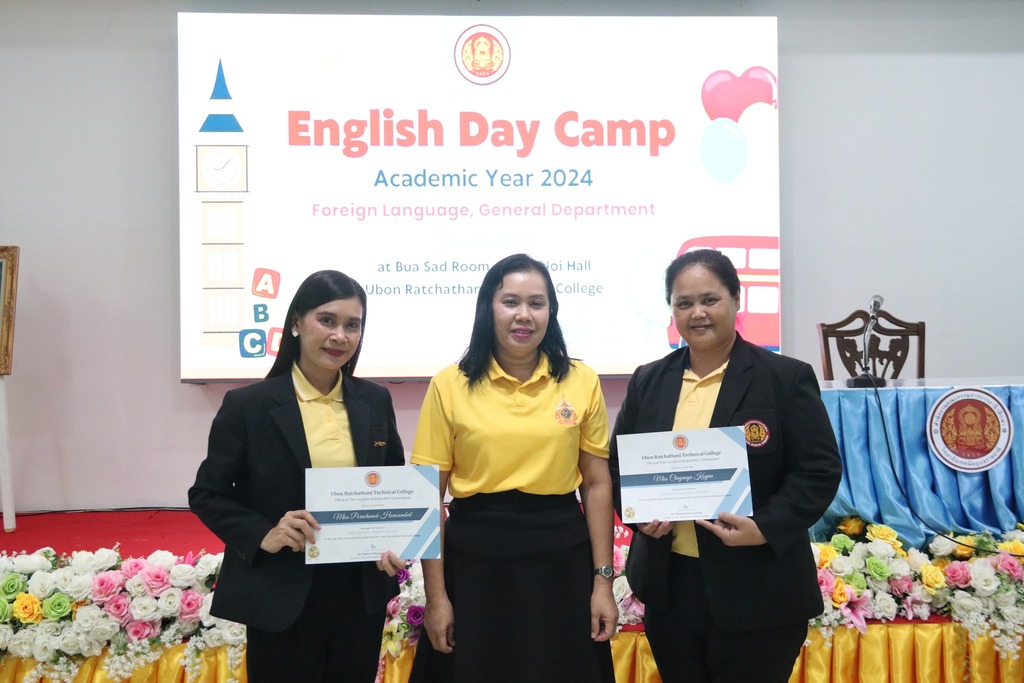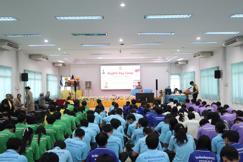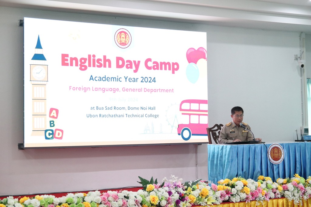 วันที่ ๙ กรกฎาคม ๒๕๖๗ เวลา ๐๙.๐๐ น. นายธาตรี พิบูลมณฑา ผู้อำนวยการวิทยาลัยเทคนิคอุบลราชธานี ให้เกียรติเป็นประธานในพิธีเปิดโครงการ English Day Camp ณ ห้องประชุมบัวแสด ซึ่งดำเนินการจัดโครงการโดย หมวดวิชาภาษาต่างประเทศ แผนกวิชาสามัญสัมพันธ์ และได้รับความอนุเคราะห์วิทยากรจากบริษัท Hybrid Success และวิทยาลัยอาชีวศึกษาอุบลราชธานี ในการนี้มี นายสุวิชา มั่นยืน รองผู้อำนวยการฝ่ายวิชาการ เป็นผู้กล่าวรายงาน โดยมี นายไวพจน์ ศรีธัญ รองผู้อำนวยการฝ่ายพัฒนากิจการนักเรียนนักศึกษา นางราตรี สะดีวงศ์ รองผู้อำนวยการฝ่ายแผนงานและความร่วมมือ นางสาวสายฝน สาระผล รองผู้อำนวยการฝ่ายบริหารทรัพยากร นายอิทธิวัฒน์ ไทยแท้ หัวหน้าแผนกวิชาสามัญสัมพันธ์ นางสาวปรานี ศรีมันตะ หัวหน้าหมวดวิชาภาษาต่างประเทศ แผนกวิชาสามัญสัมพันธ์ พร้อมด้วยคณะครู แผนกวิชาสามัญสัมพันธ์ และบุคลากรทางการศึกษาที่เกี่ยวข้อง นำนักเรียน นักศึกษา วิทยาลัยเทคนิคอุบลราชธานี เข้าร่วมพิธีอย่างพร้อมเพรียง ทั้งนี้เพื่อพัฒนาทักษะทางด้านภาษาอังกฤษ ในชีวิตประจำวัน เพื่อให้นักเรียน นักศึกษา ได้แลกเปลี่ยนเรียนรู้ภาษาและวัฒนธรรมต่างประเทศเป็นการเชื่อมความสัมพันธ์ระหว่างนักเรียน นักศึกษา ได้แลกเปลี่ยนเรียนรู้ประสบการณ์ร่วมกัน และเพื่อให้นักเรียนนักศึกษามีเจตคติที่ดีต่อการเรียนวิชาภาษาวิชาอังกฤษต่อไป