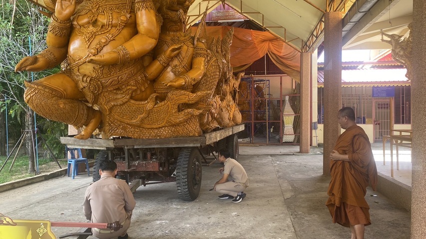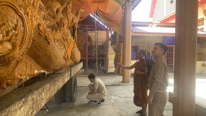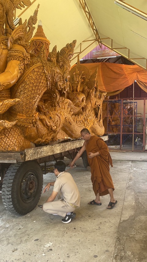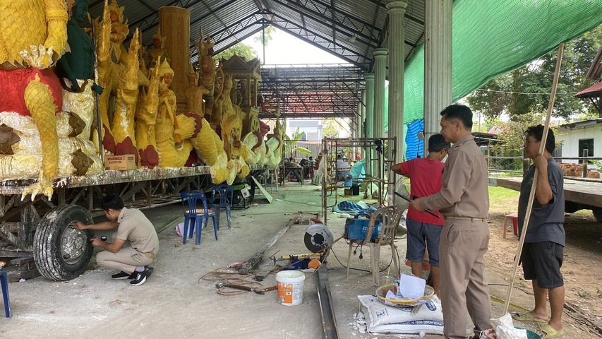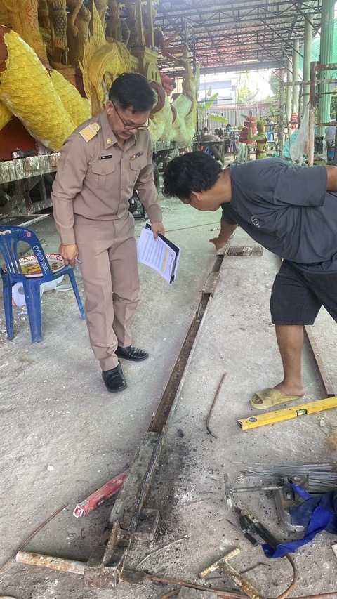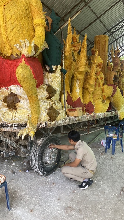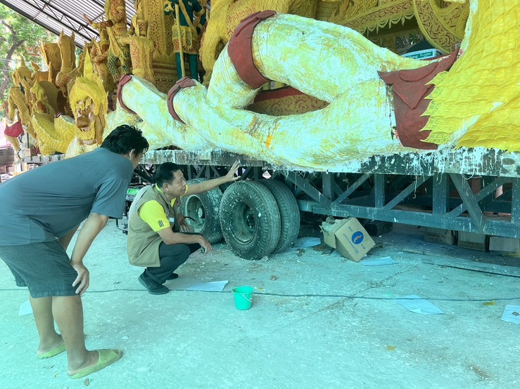 หัวหน้างานโครงการพิเศษและการบริการชุมชน เข้าตรวจโครงสร้างความแข็งแรงของรถต้นเทียน ภายใต้กิจกรรมอาชีวะอาสา