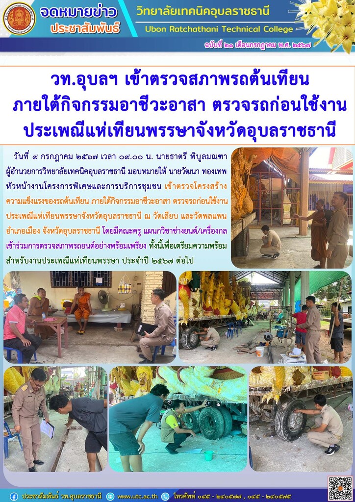 วันที่ ๙ กรกฎาคม ๒๕๖๗ เวลา ๐๙.๐๐ น. นายธาตรี พิบูลมณฑา ผู้อำนวยการวิทยาลัยเทคนิคอุบลราชธานี มอบหมายให้ นายวัฒนา ทองเทพ หัวหน้างานโครงการพิเศษและการบริการชุมชน เข้าตรวจโครงสร้างความแข็งแรงของรถต้นเทียน ภายใต้กิจกรรมอาชีวะอาสา ตรวจรถก่อนใช้งานประเพณีแห่เทียนพรรษาจังหวัดอุบลราชธานี ณ วัดเลียบ และวัดพลแพน อำเภอเมือง จังหวัดอุบลราชธานี โดยมีคณะครู แผนกวิชาช่างยนต์/เครื่องกล เข้าร่วมการตรวจสภาพรถยนต์อย่างพร้อมเพรียง ทั้งนี้เพื่อเตรียมความพร้อมสำหรับงานประเพณีแห่เทียนพรรษา ประจำปี ๒๕๖๗ ต่อไป