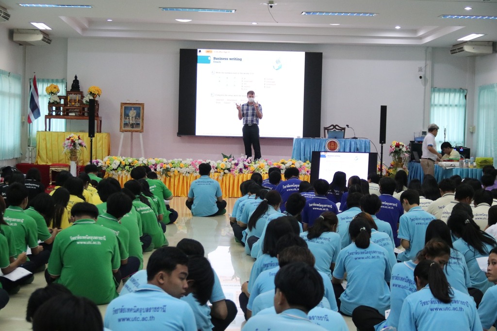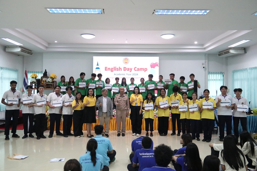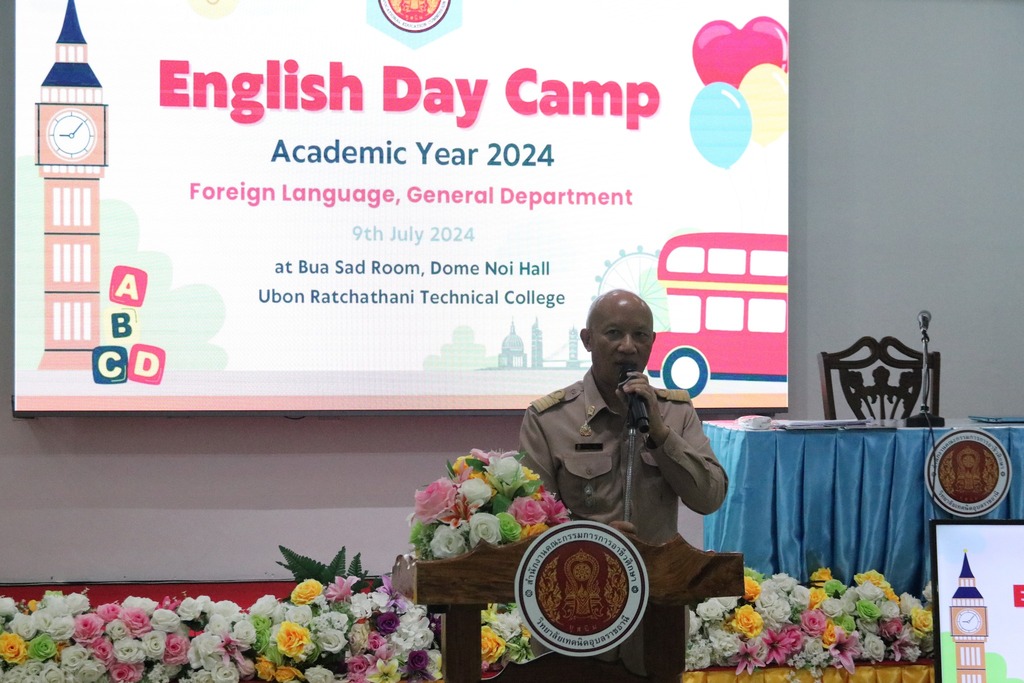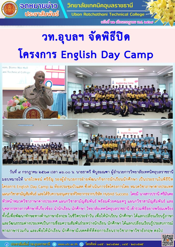 วันที่ ๙ กรกฎาคม ๒๕๖๗ เวลา ๑๖.๐๐ น. นายธาตรี พิบูลมณฑา ผู้อำนวยการวิทยาลัยเทคนิคอุบลราชธานีมอบหมายให้ นายไวพจน์ ศรีธัญ รองผู้อำนวยการฝ่ายพัฒนากิจการนักเรียนนักศึกษา เป็นประธานในพิธีปิดโครงการ English Day Camp ณ ห้องประชุมบัวแสด ซึ่งดำเนินการจัดโครงการโดย หมวดวิชาภาษาต่างประเทศ แผนกวิชาสามัญสัมพันธ์ และได้รับความอนุเคราะห์วิทยากรจากบริษัท Hybrid Success โดยมี นางสาวปรานี ศรีมันตะหัวหน้าหมวดวิชาภาษาต่างประเทศ แผนกวิชาสามัญสัมพันธ์ พร้อมด้วยคณะครู แผนกวิชาสามัญสัมพันธ์ และบุคลากรทางการศึกษาที่เกี่ยวข้อง นำนักเรียน นักศึกษา วิทยาลัยเทคนิคอุบลราชธานี เข้าร่วมพิธีอย่างพร้อมเพรียงทั้งนี้เพื่อพัฒนาทักษะทางด้านภาษาอังกฤษ ในชีวิตประจำวัน เพื่อให้นักเรียน นักศึกษา ได้แลกเปลี่ยนเรียนรู้ภาษาและวัฒนธรรมต่างประเทศเป็นการเชื่อมความสัมพันธ์ระหว่างนักเรียน นักศึกษา ได้แลกเปลี่ยนเรียนรู้ประสบการณ์ทางภาษาร่วมกัน และเพื่อให้นักเรียน นักศึกษามีเจตคติที่ดีต่อการเรียนรายวิชาภาษาวิชาอังกฤษ ต่อไป
