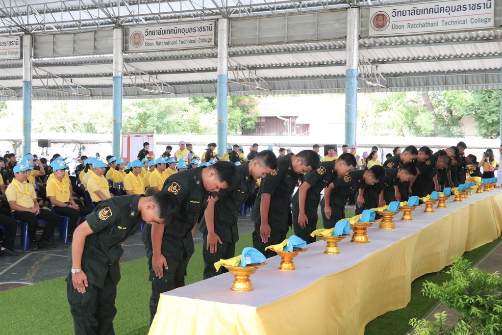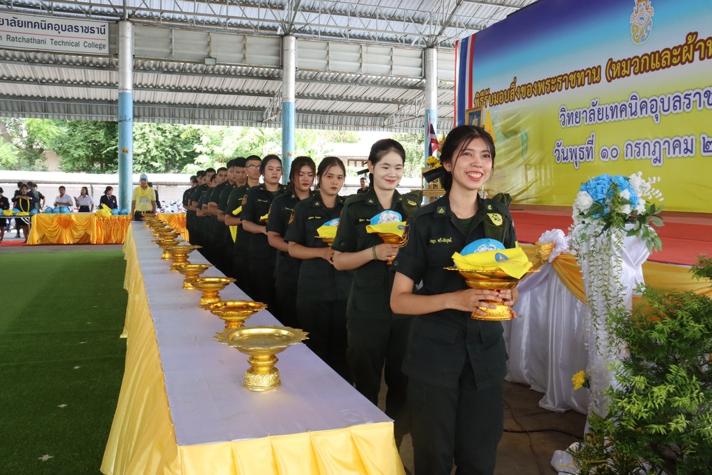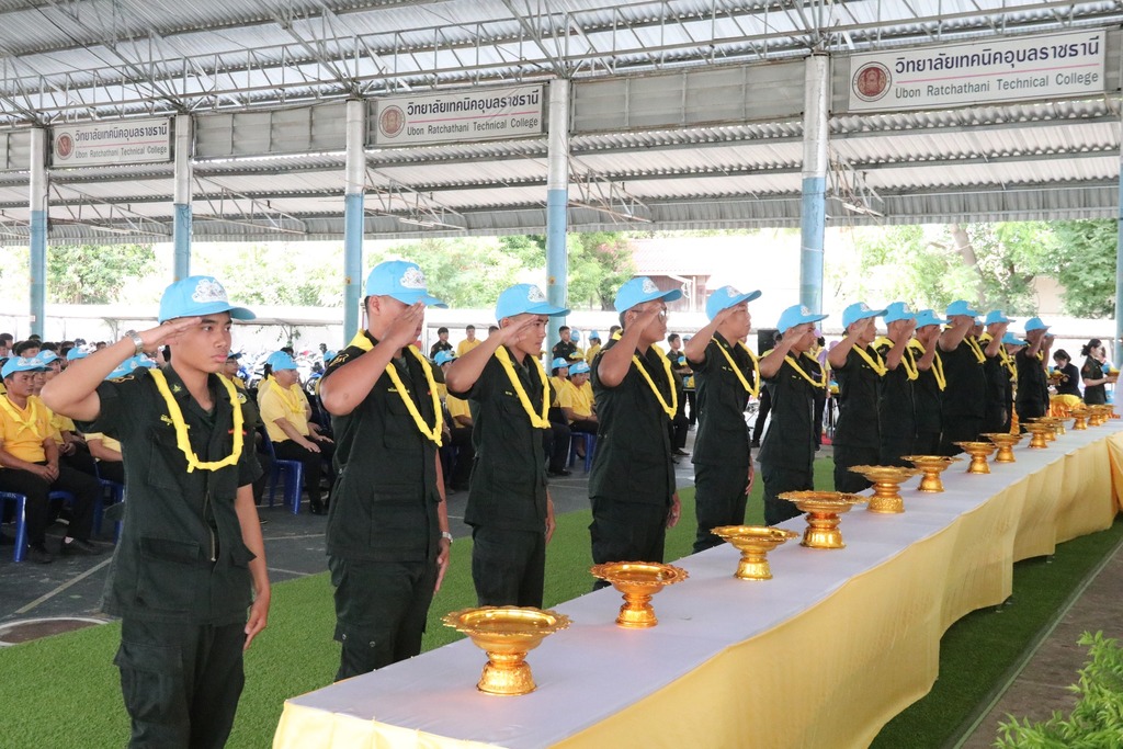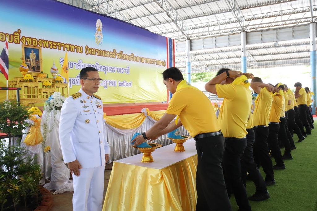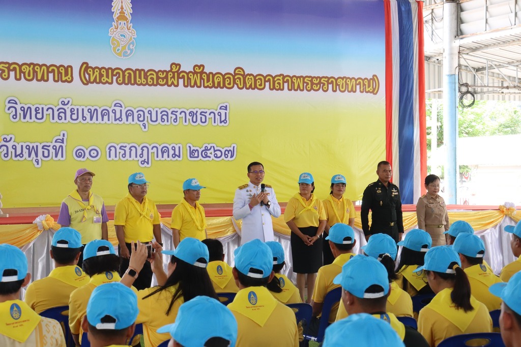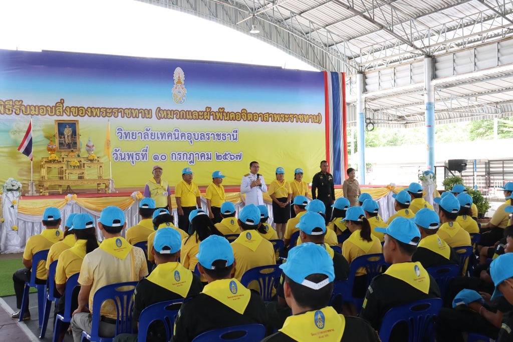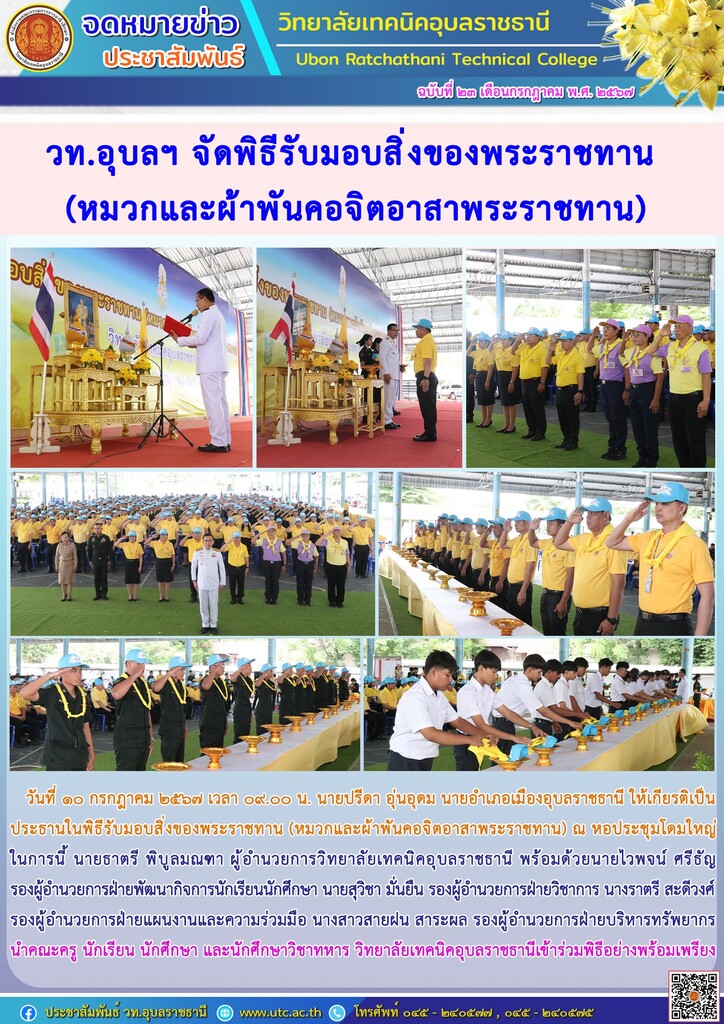 วันที่ ๑๐ กรกฎาคม ๒๕๖๗ เวลา ๐๙.๐๐ น. นายปรีดา อุ่นอุดม นายอำเภอเมืองอุบลราชธานี ให้เกียรติเป็นประธานในพิธีรับมอบสิ่งของพระราชทาน (หมวกและผ้าพันคอจิตอาสาพระราชทาน) ณ หอประชุมโดมใหญ่ ในการนี้ นายธาตรี พิบูลมณฑา ผู้อำนวยการวิทยาลัยเทคนิคอุบลราชธานี พร้อมด้วยนายไวพจน์ ศรีธัญ รองผู้อำนวยการฝ่ายพัฒนากิจการนักเรียนนักศึกษา นายสุวิชา มั่นยืน รองผู้อำนวยการฝ่ายวิชาการ นางราตรี สะดีวงศ์ รองผู้อำนวยการฝ่ายแผนงานและความร่วมมือ นางสาวสายฝน สาระผล รองผู้อำนวยการฝ่ายบริหารทรัพยากรนำคณะครู นักเรียน นักศึกษา และนักศึกษาวิชาทหาร วิทยาลัยเทคนิคอุบลราชธานีเข้าร่วมพิธีอย่างพร้อมเพรียง