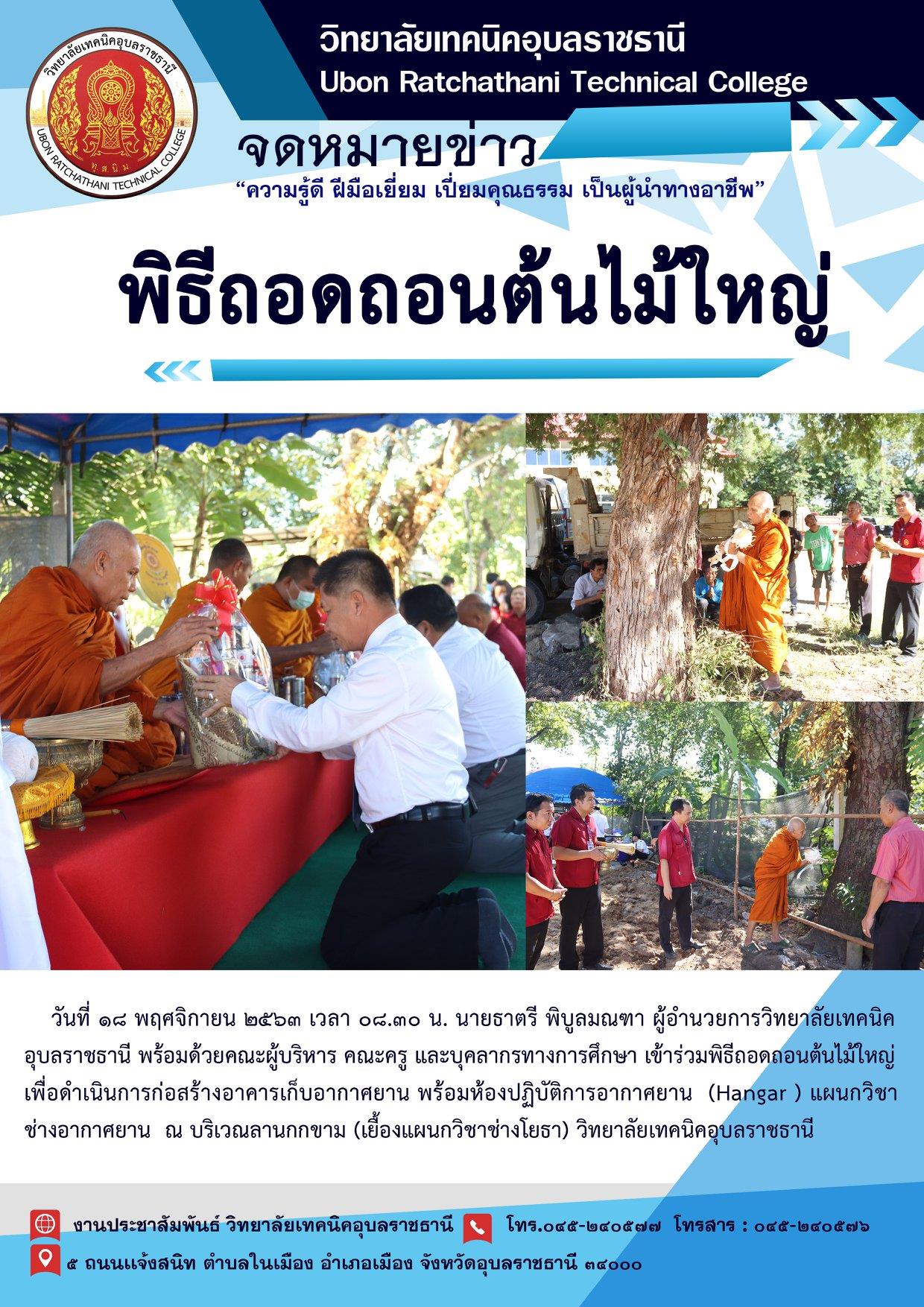 วันที่ ๑๘ พฤศจิกายน ๒๕๖๓ เวลา ๐๘.๓๐ น. นายธาตรี พิบูลมณฑา ผู้อำนวยการวิทยาลัยเทคนิคอุบลราชธานี พร้อมด้วยคณะผู้บริหาร คณะครู และบุคลากรทางการศึกษา เข้าร่วมพิธีถอดถอนต้นไม้ใหญ่ เพื่อดำเนินการก่อสร้างอาคารเก็บอากาศยาน พร้อมห้องปฏิบัติการอากาศยาน (Hangar ) แผนกวิชาช่างอากาศยาน ณ บริเวณลานกกขาม (เยื้องแผนกวิชาช่างโยธา) วิทยาลัยเทคนิคอุบลราชธานี